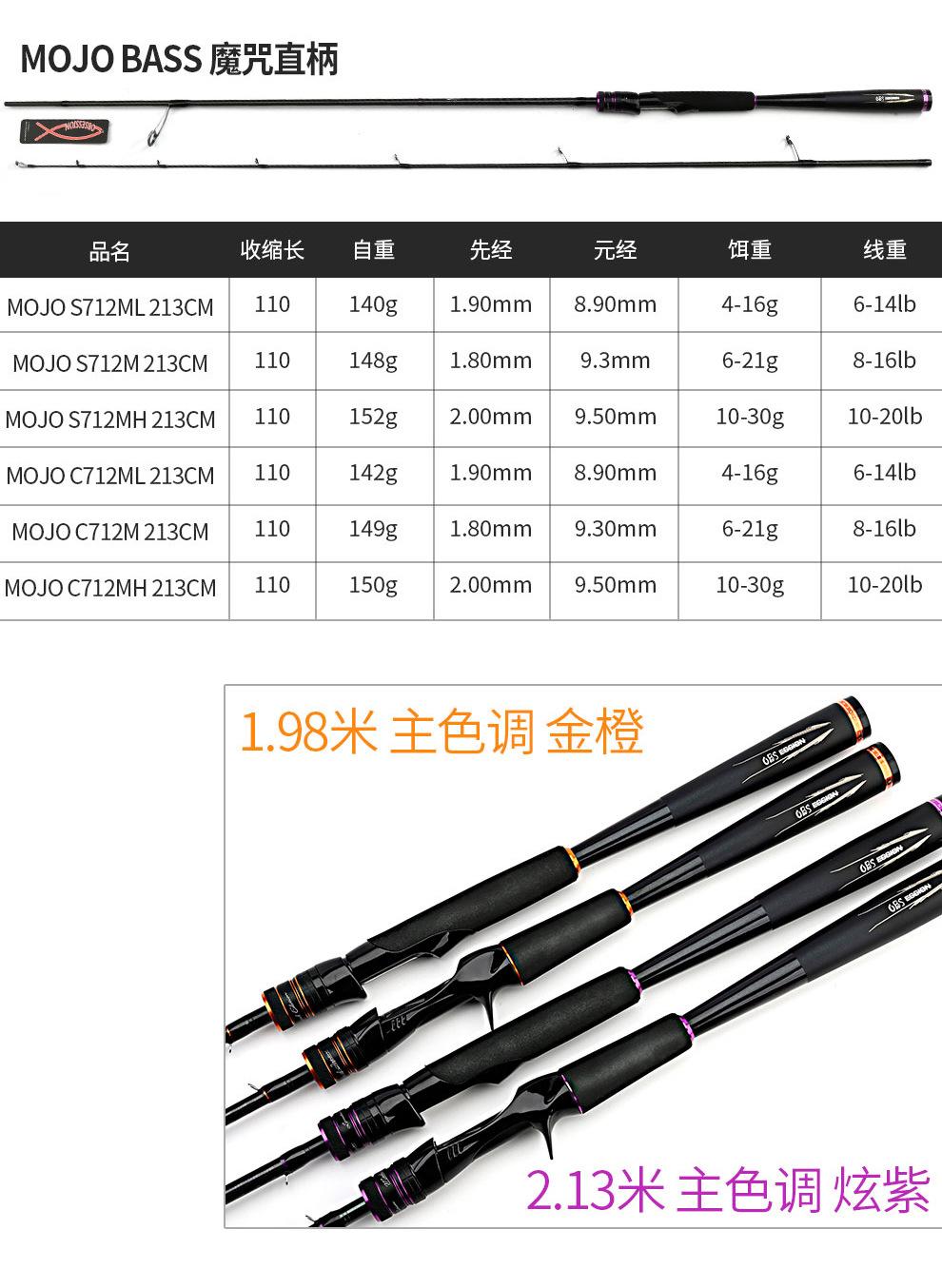 | MOJO S712ML 213CMrecto | 110 centímetros | 140g | 1.90 | 8.90 | 4-16g | 6-14LB |