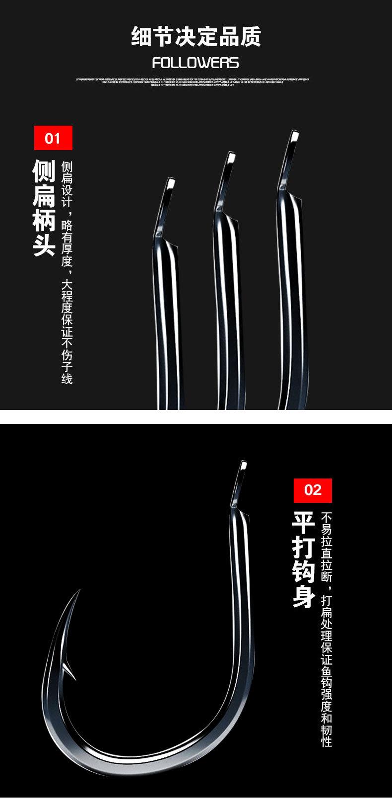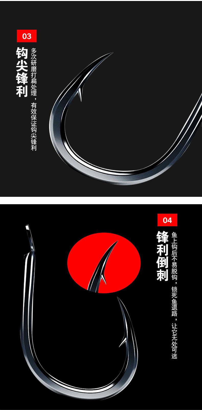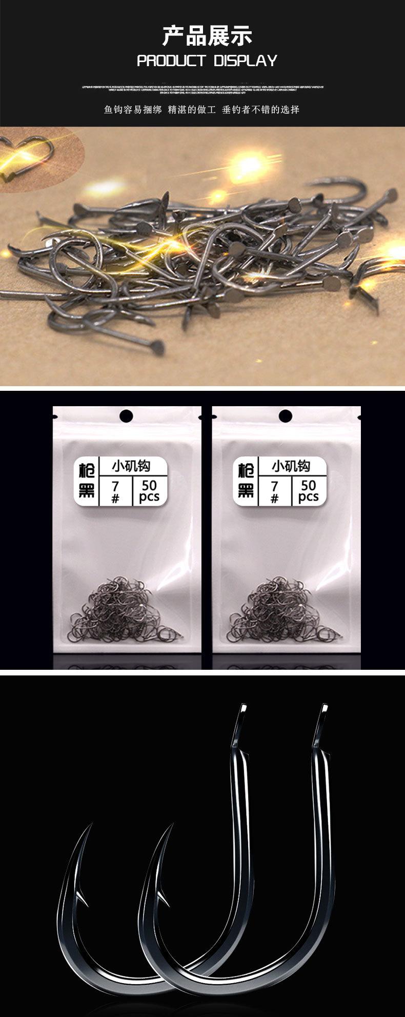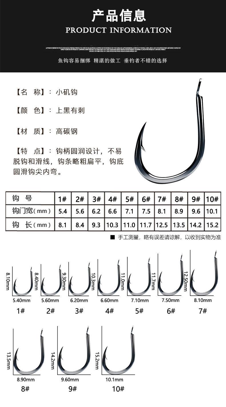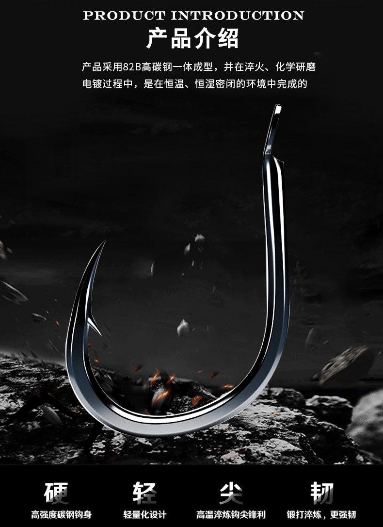 Manga: Este tipo de anzuelo no tiene púas. La punta es afilada, el mango es largo, el anzuelo es delgado y el cuerpo es ligero. Es adecuado para peces pequeños que se alimentan por succión. Es rápido de atrapar y de morder. Se utiliza principalmente para capturar carpas blancas, pequeños peces blancos, etc.