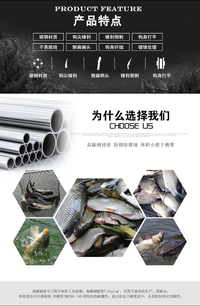 Al hablar del anzuelo de pesca, nos referimos a la pesca tradicional, con caña larga y línea corta. El anzuelo de pesca generalmente se compone de una línea principal atada directamente a la ranura del anzuelo con el color base, y el flotador utiliza principalmente flotadores de siete estrellas y flotadores fijos. Al estar integrados el anzuelo y el plomo, cuando el pez muerde el anzuelo, la señal de pesca se envía principalmente al flotador. Solo cuando la carpa herbívora, la carpa negra, el besugo y otros peces grandes muerden el anzuelo, el flotador mostrará un flotador negro. El anzuelo de pesca es muy común y es la herramienta principal para la pesca salvaje. Una caña de mano con un conjunto de pesca tradicional permite la pesca salvaje en entornos naturales complejos. Además, ofrece mayor flexibilidad de maniobrabilidad. Las ventajas de pescar en estanques de hierba son incomparables con la pesca con plomo suspendido. Además, el anzuelo de pesca casi siempre tiene púas. Una vez enganchado, el pez tiene dificultades para soltarse del anzuelo debido al efecto de las púas, lo cual es muy popular entre pescadores de mayor edad y principiantes.