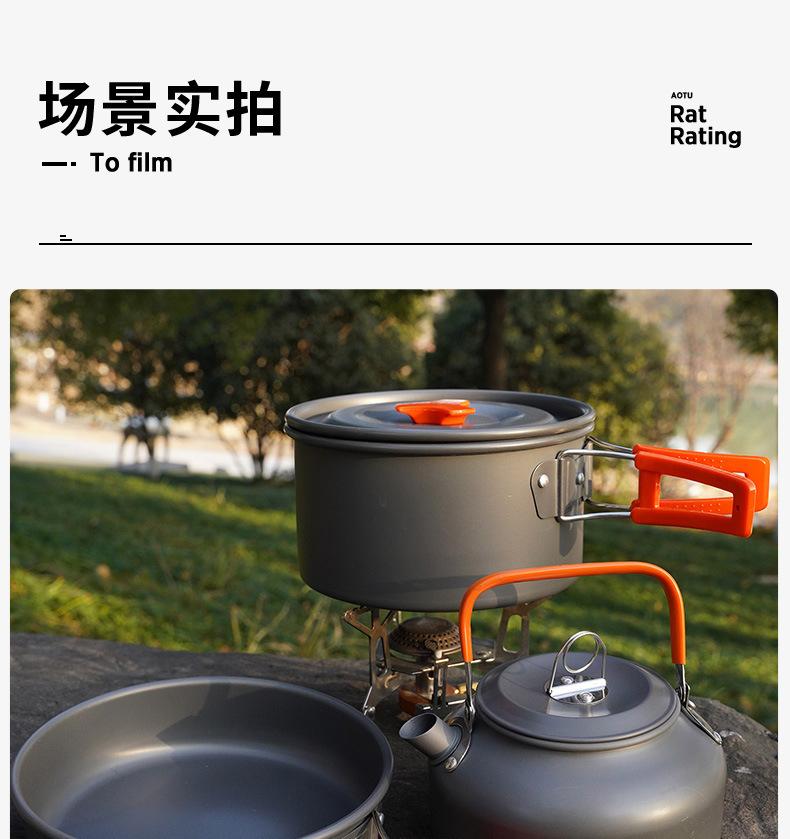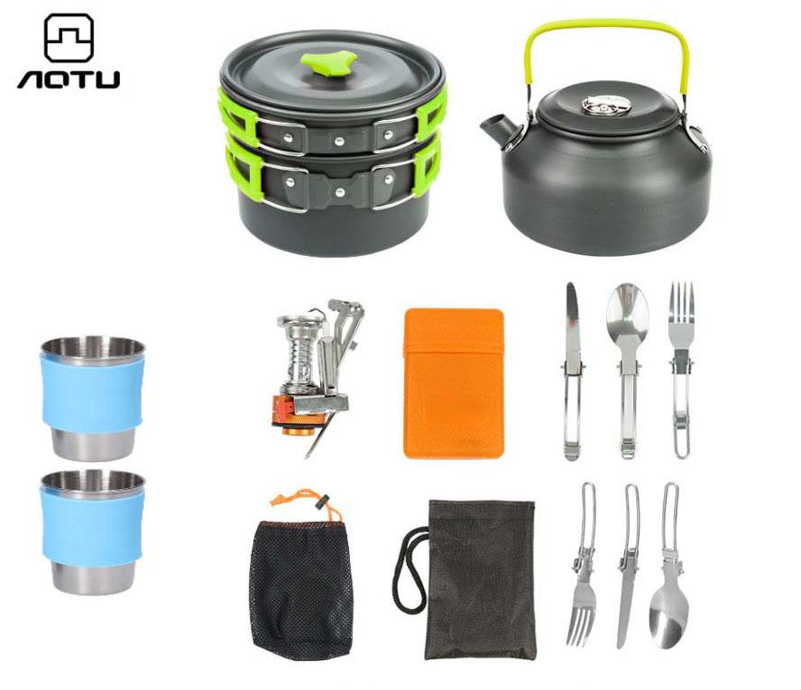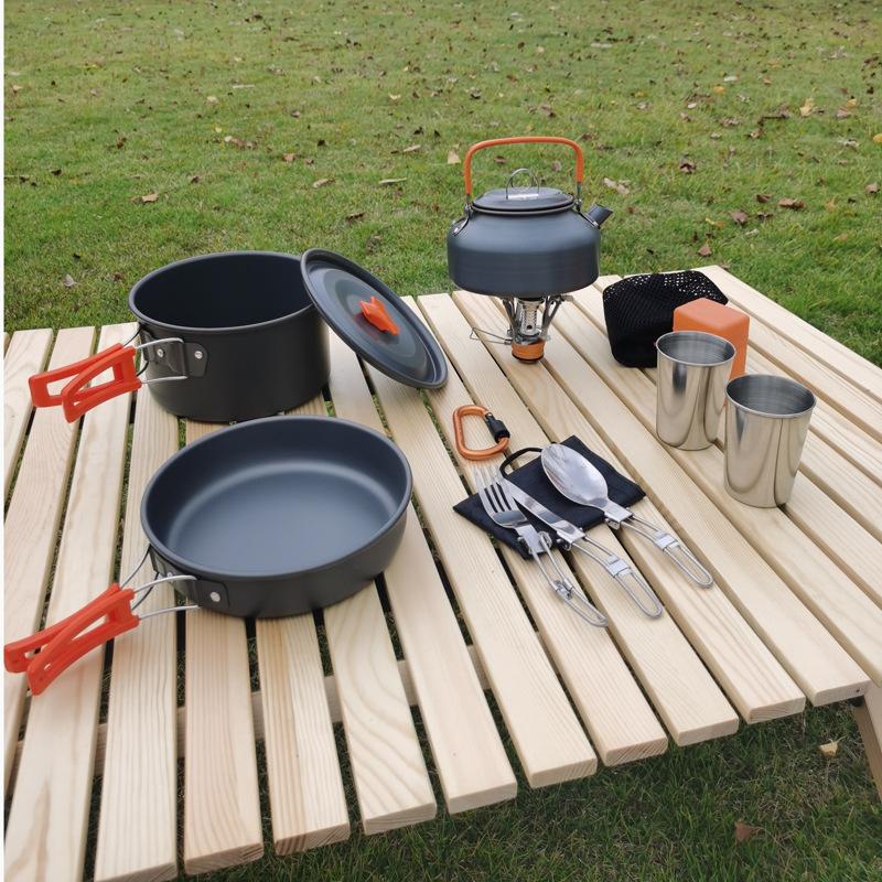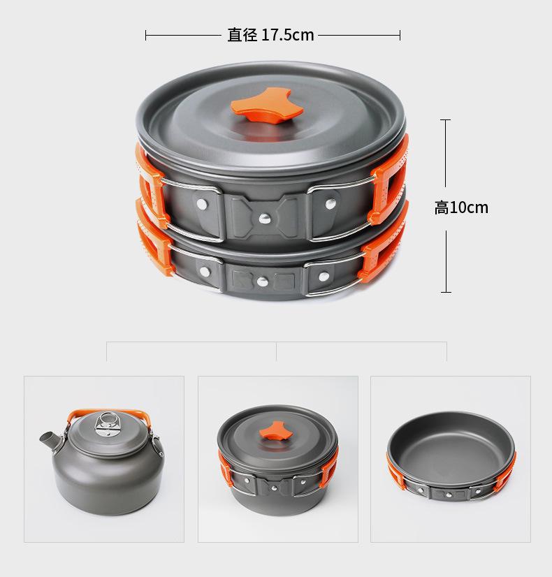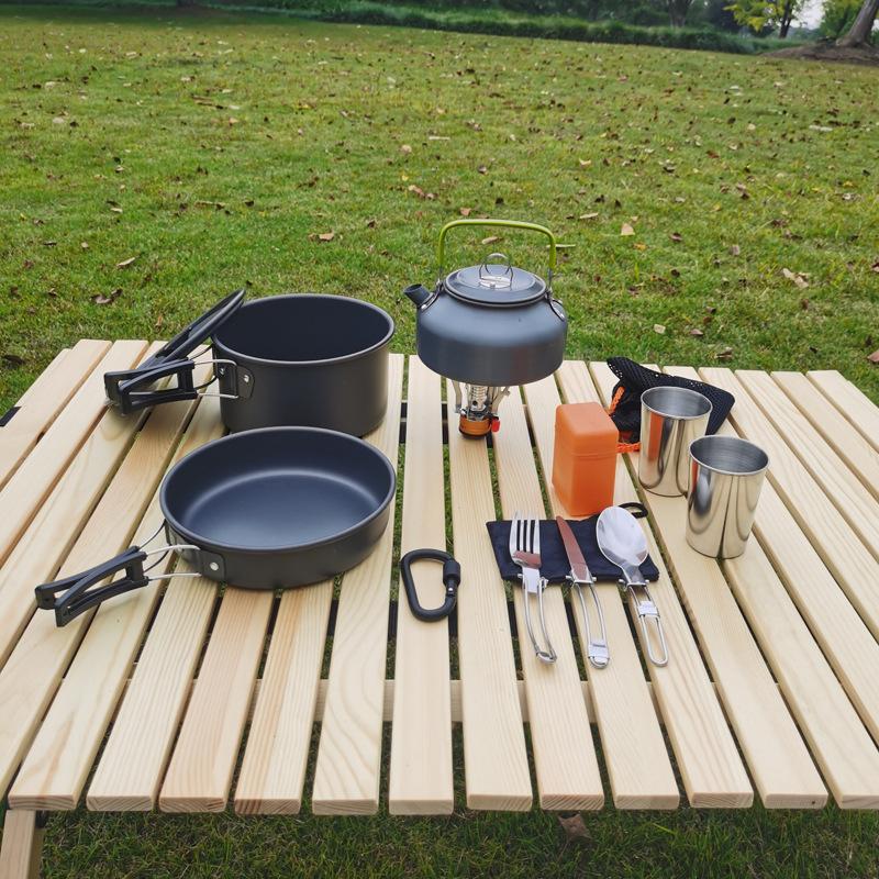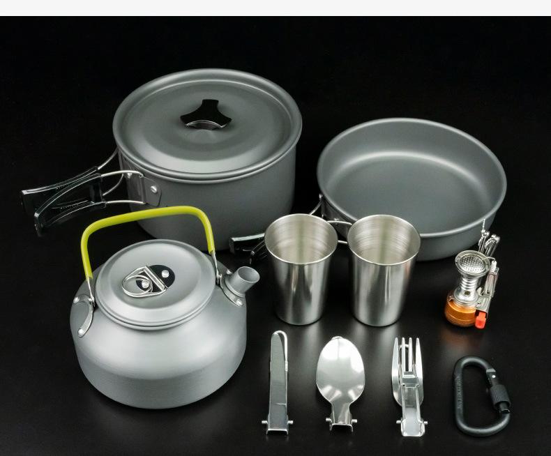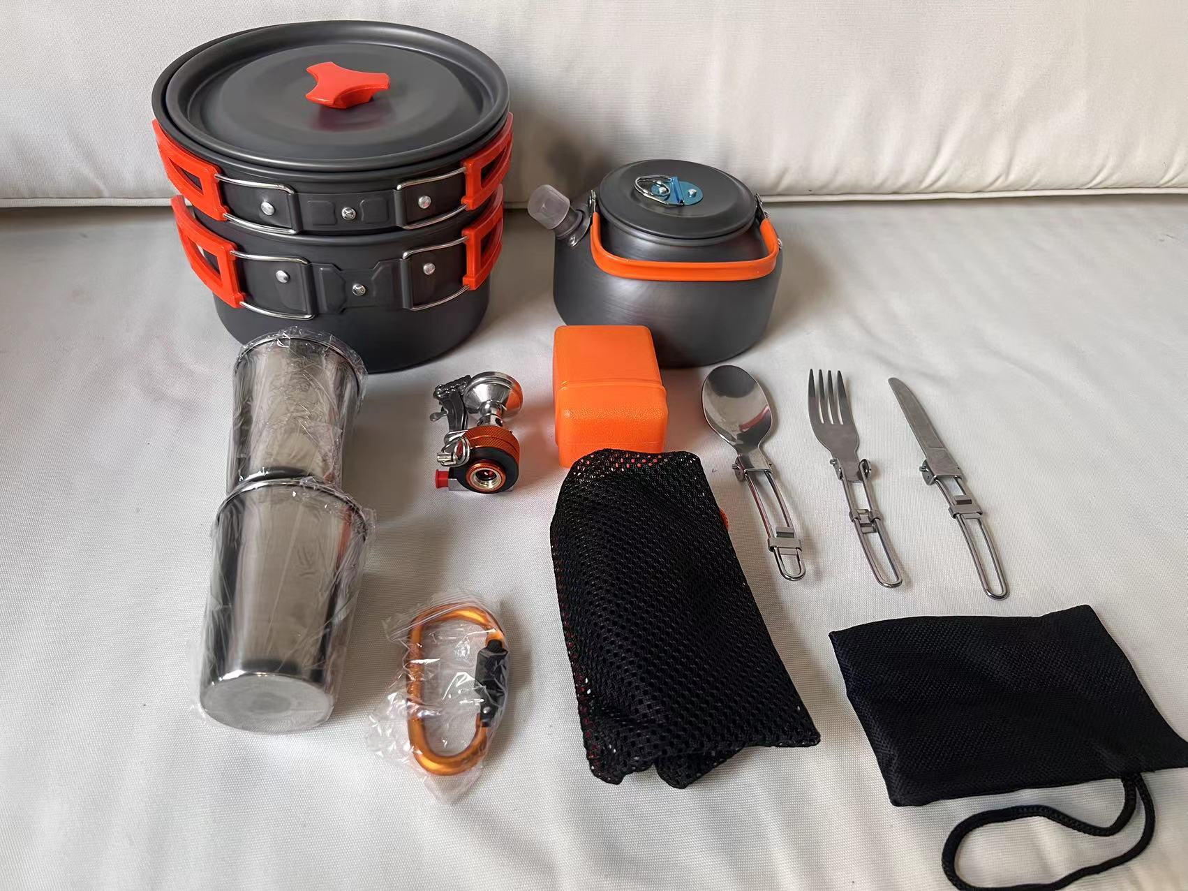 Lista: Olla grande*1, Tetera*1, Sartén*1, Tazas*2, Mosquetón D*1, Juego de cubiertos de tres piezas*1, Mini hornillo*1