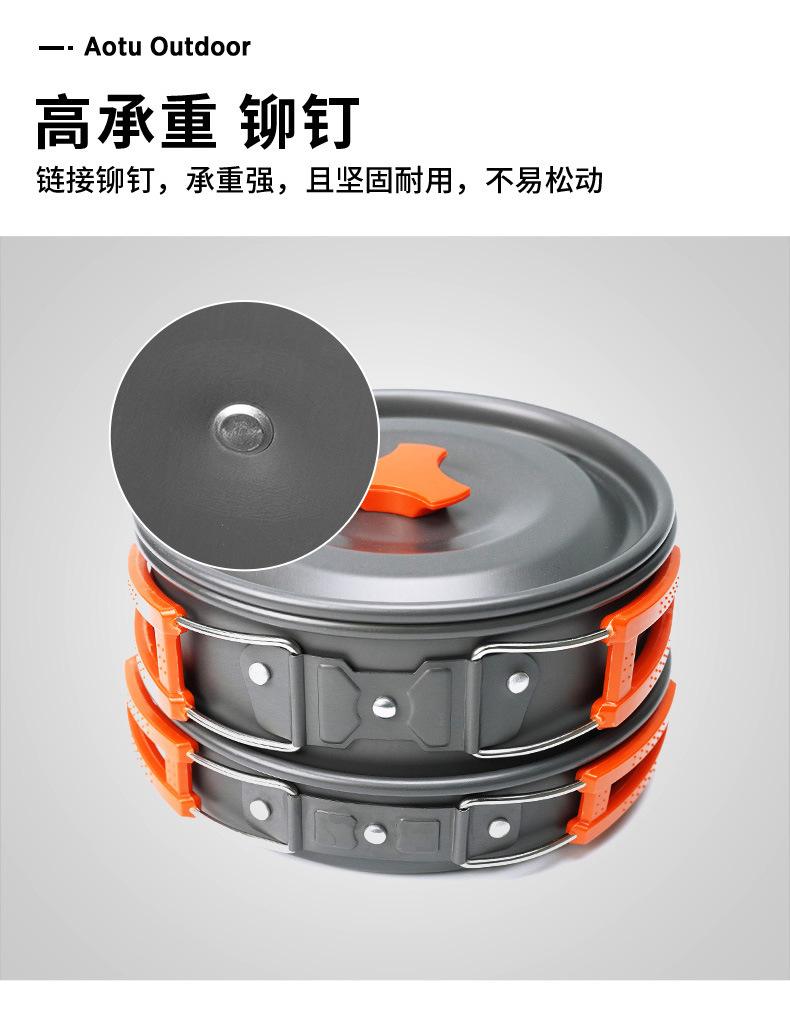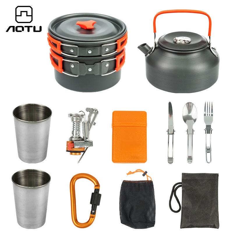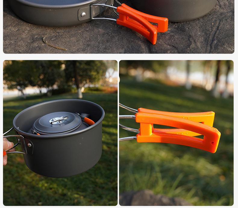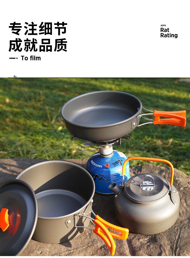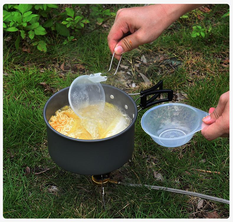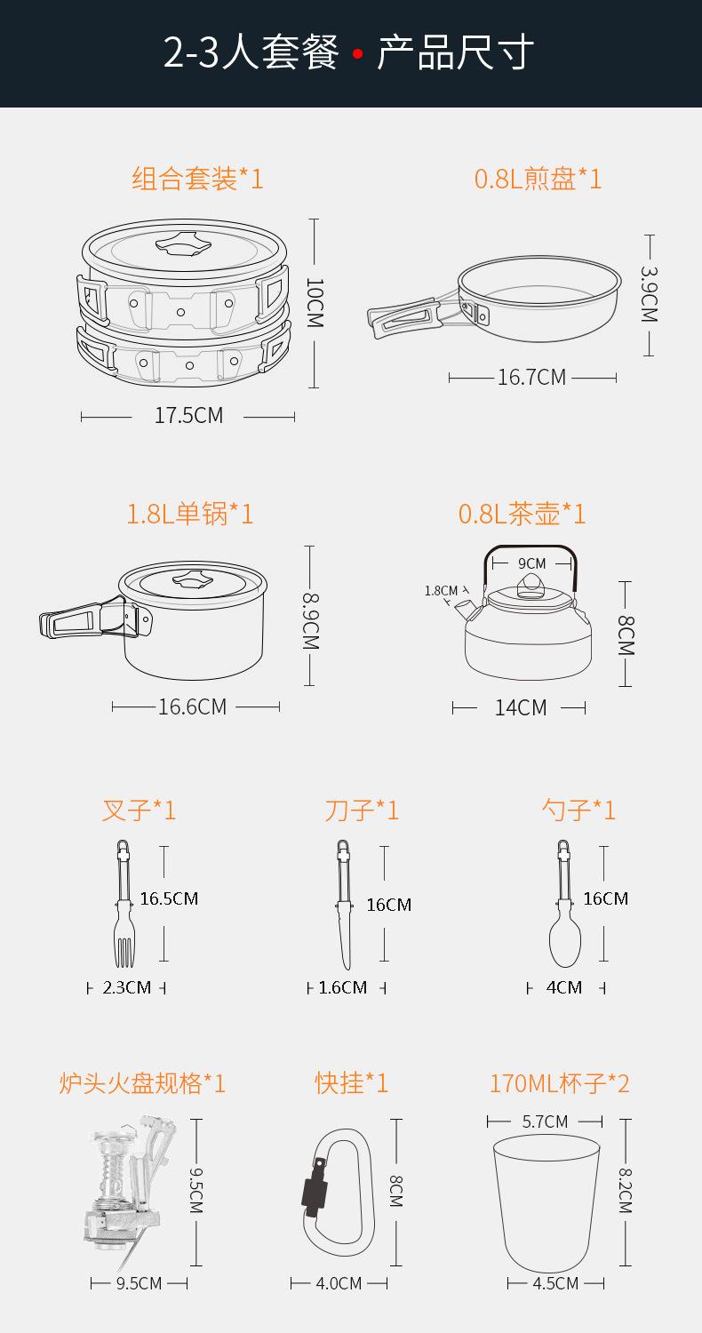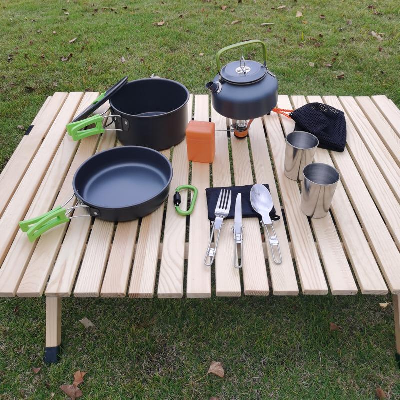 Lista: Olla grande*1, Tetera*1, Sartén*1, Tazas*2, Mosquetón D*1, Juego de cubiertos de tres piezas*1, Mini hornillo*1