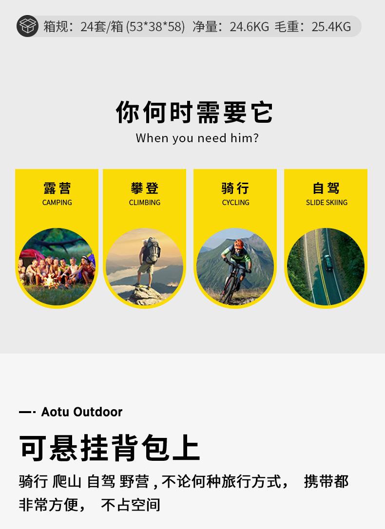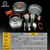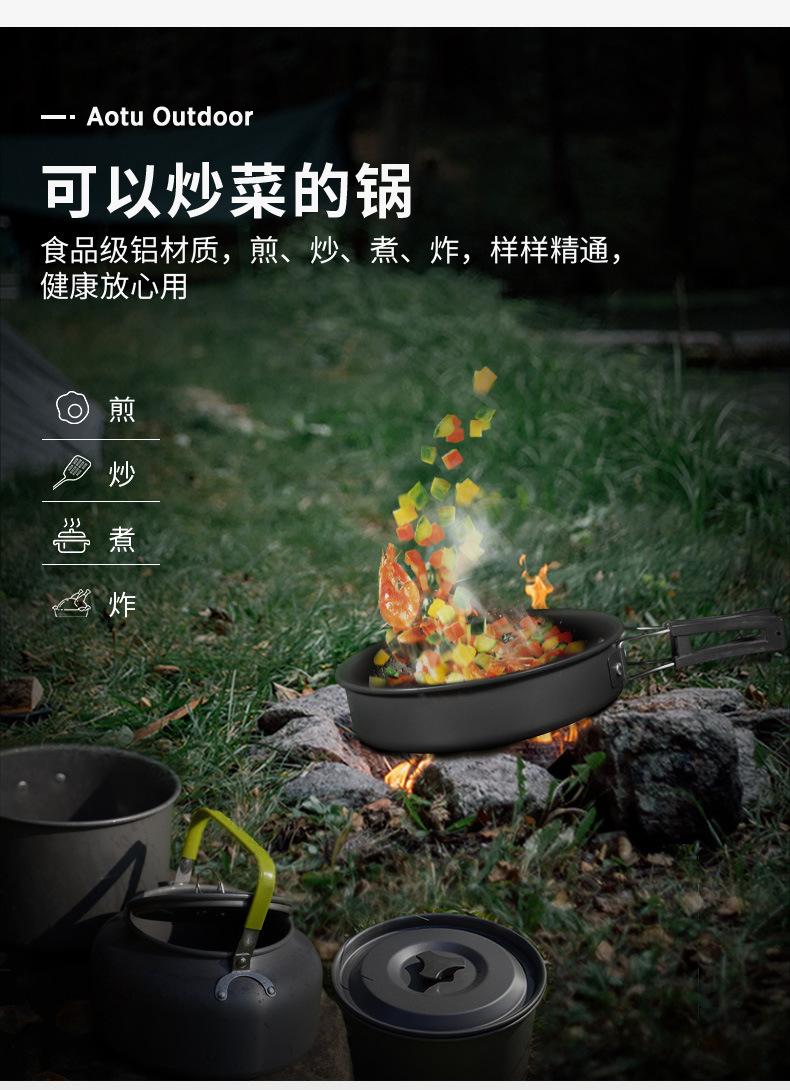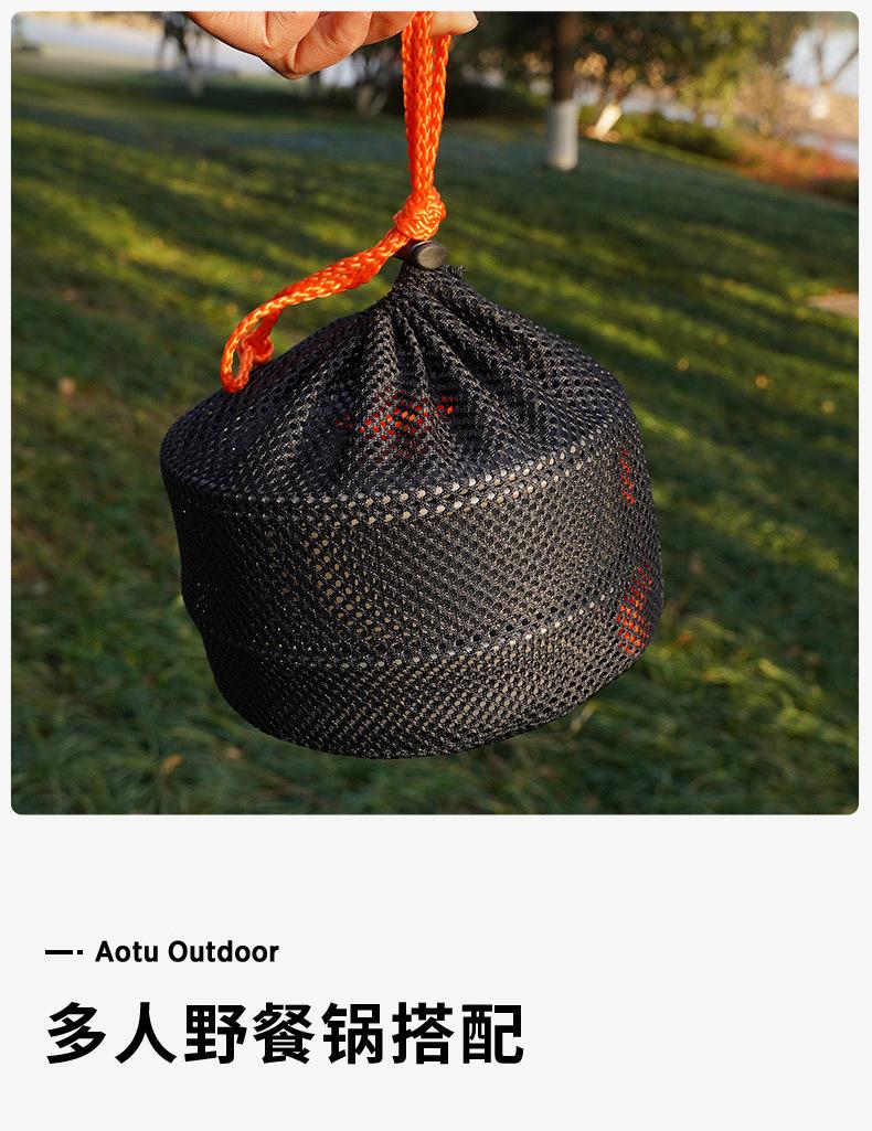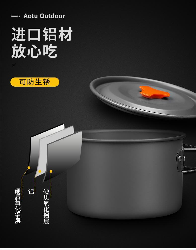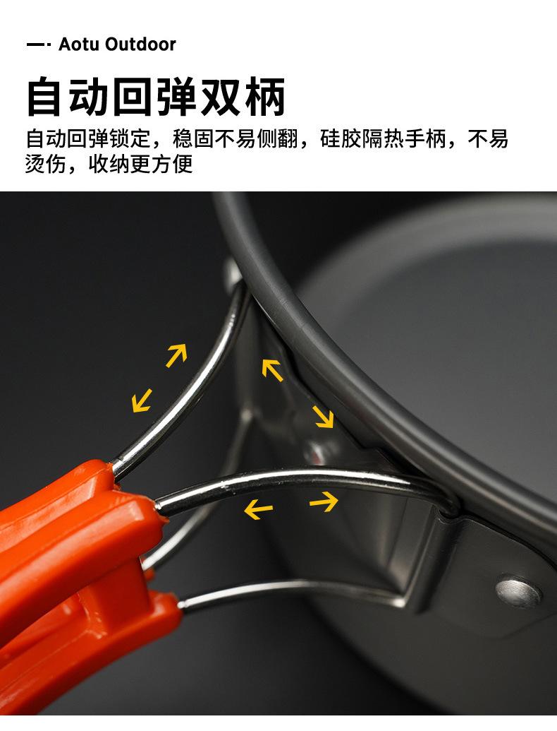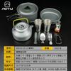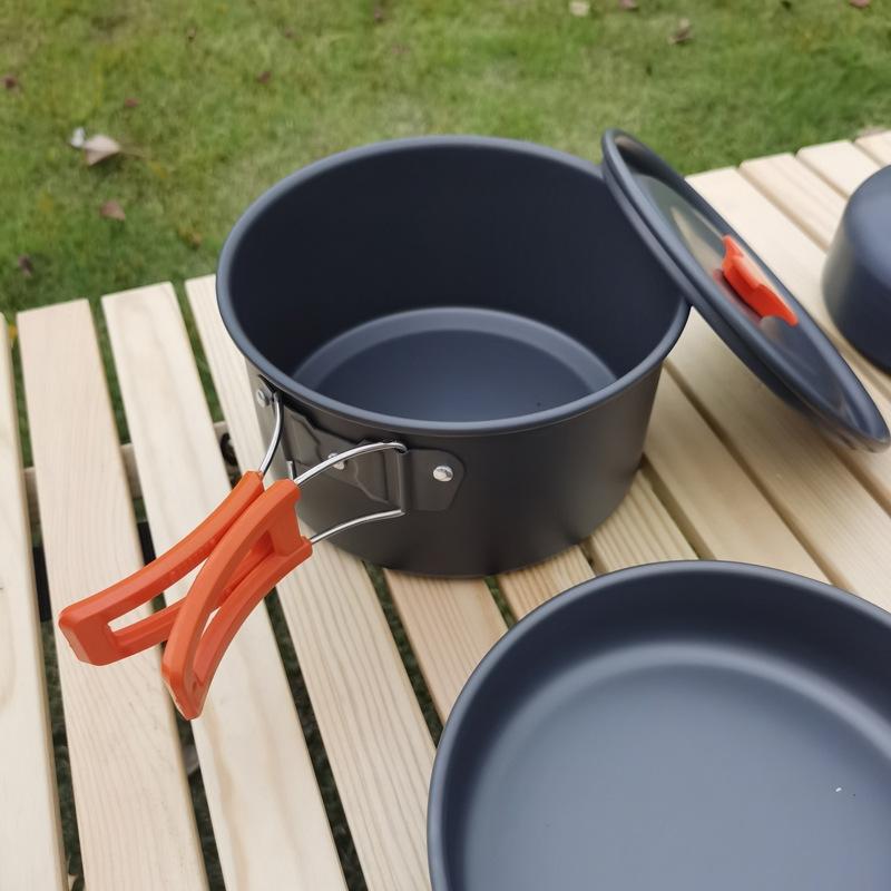Lista: Olla grande*1, Tetera*1, Sartén*1, Tazas*2, Mosquetón D*1, Juego de cubiertos de tres piezas*1, Mini hornillo*1