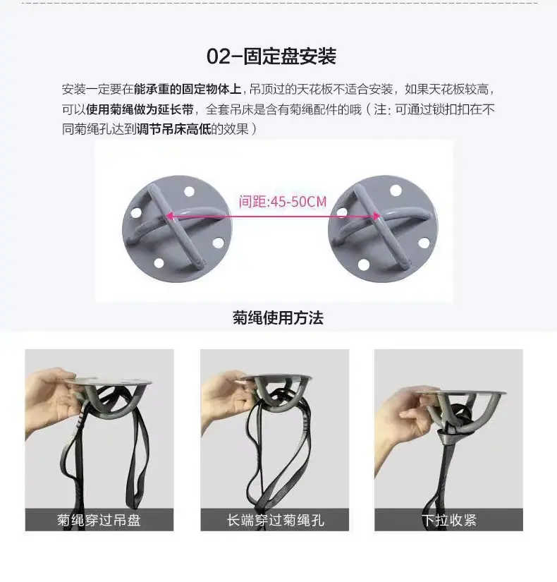 Requisitos de instalación: Colgar en el techo conlleva cierto grado de peligro. Se recomienda usar una placa colgante de buena calidad y tela importada. La parte inferior de la hamaca debe estar a aproximadamente 1 metro del suelo. La distancia específica se puede ajustar según los requisitos reales.