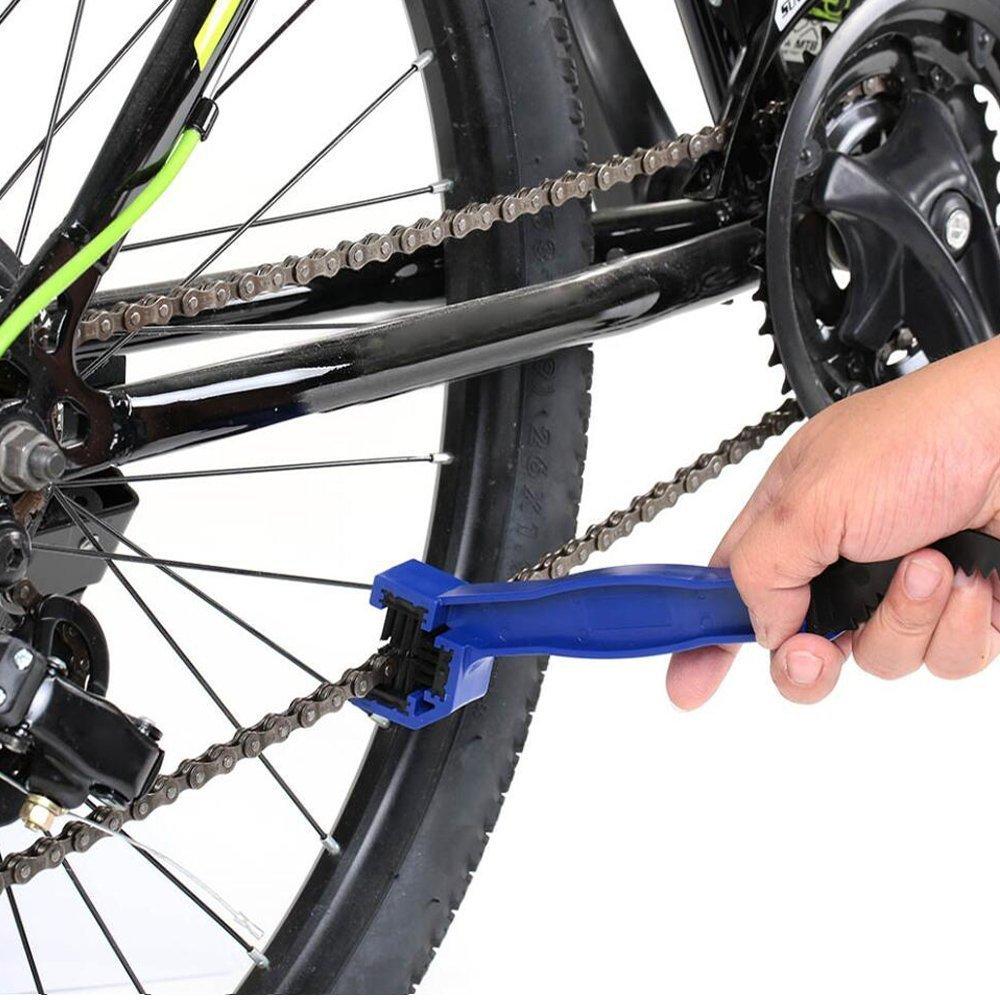 ? VERSÁTIL- Funciona con todo tipo de bicicletas- ¡si tiene cadena, puede limpiarla! Para diseños de rueda libre, simplemente coloque el limpiador en la cadena y use el pedal para girar la cadena. Para bicicletas con frenos de contrapedal, la bicicleta debe elevarse o voltearse para que funcione.