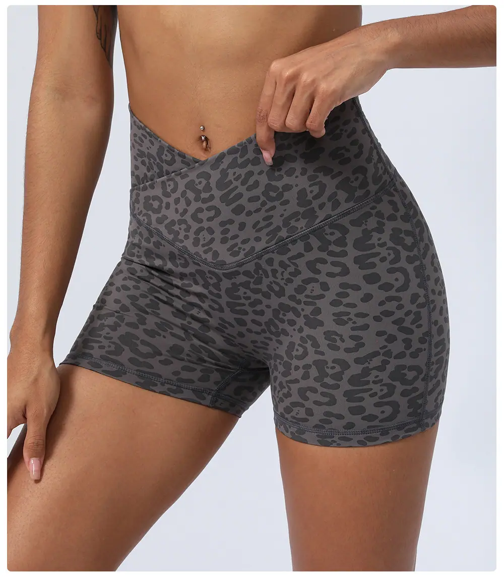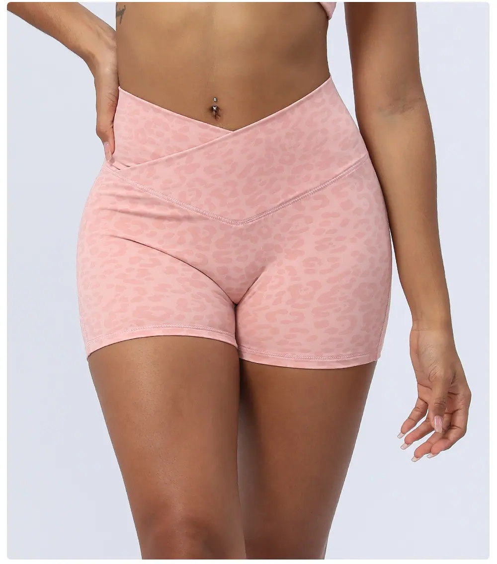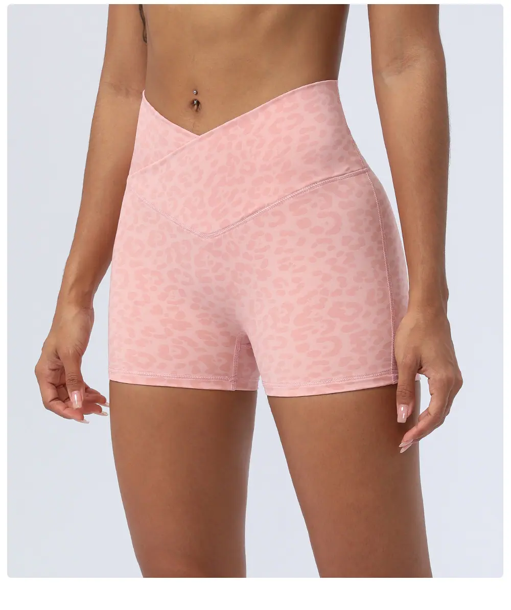 Pantalones cortos de yoga con estampado de leopardo y cintura cruzada, ajustados, color melocotón, elásticos, de cintura alta, para correr y fitness, de tres puntos