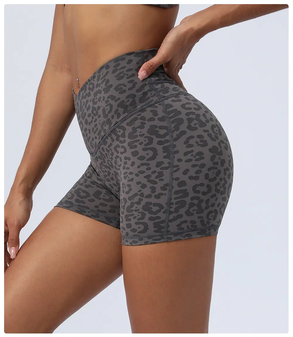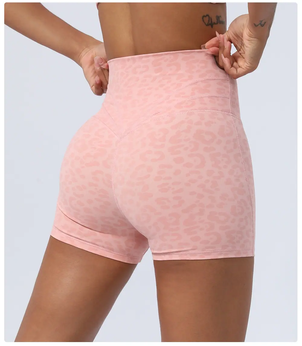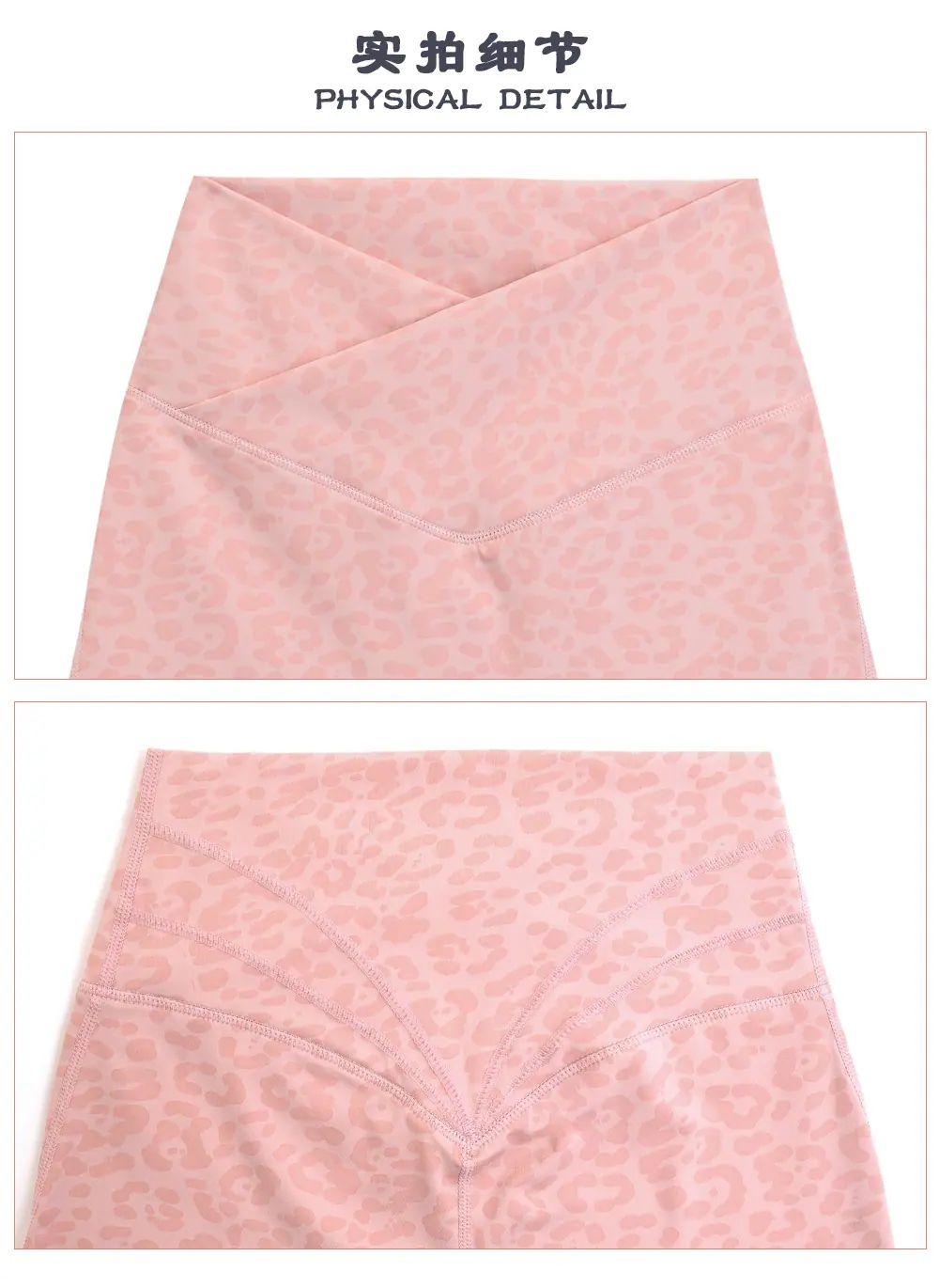 Pantalones cortos de yoga con estampado de leopardo y cintura cruzada, ajustados, color melocotón, elásticos, de cintura alta, para correr y fitness, de tres puntos