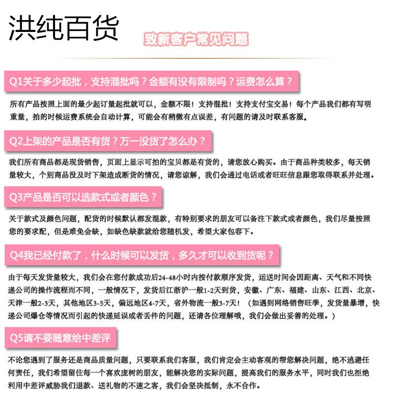 Gracias por visitar Genglan Commodity Factory. Nuestra empresa está ubicada en Yiwu, la capital mundial de las pequeñas materias primas, y está afiliada a Yiwu Genglan Commodity Factory. Para dar la bienvenida a la era de las pequeñas materias primas, la empresa ha abierto la plataforma de venta directa de fábrica de Alibaba para suministrar directamente todo tipo de artículos de primera necesidad, accesorios y otros productos de la empresa a mayoristas, supermercados, tiendas físicas y mercados mayoristas nacionales e internacionales. Con una alta reputación entre los consumidores, la empresa ha establecido relaciones de cooperación duraderas y estables con numerosos minoristas y agentes.