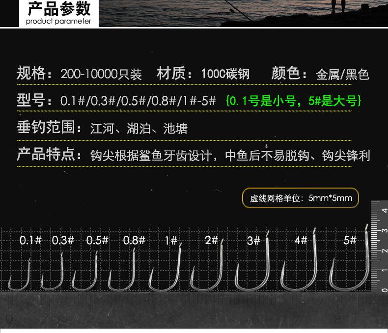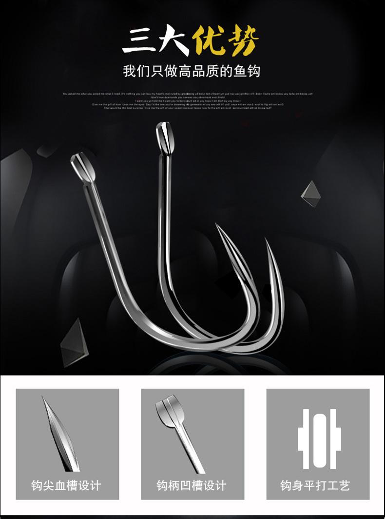 Manga: Este tipo de anzuelo no tiene púas. La punta es afilada, el mango es largo, el anzuelo es delgado y el cuerpo es ligero. Es adecuado para peces pequeños que se alimentan por succión. Es rápido de atrapar y de morder. Se utiliza principalmente para capturar carpas blancas, pequeños peces blancos, etc.