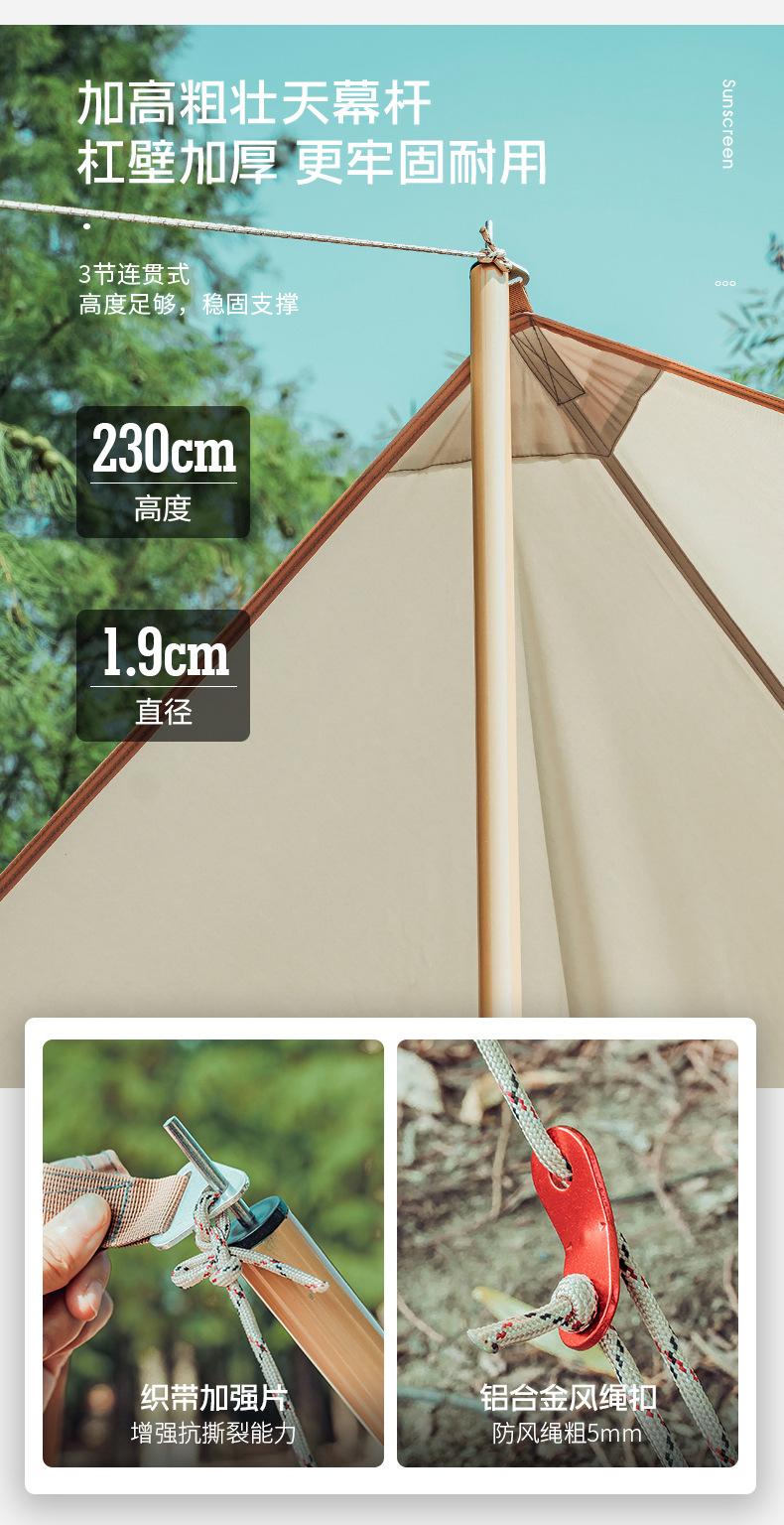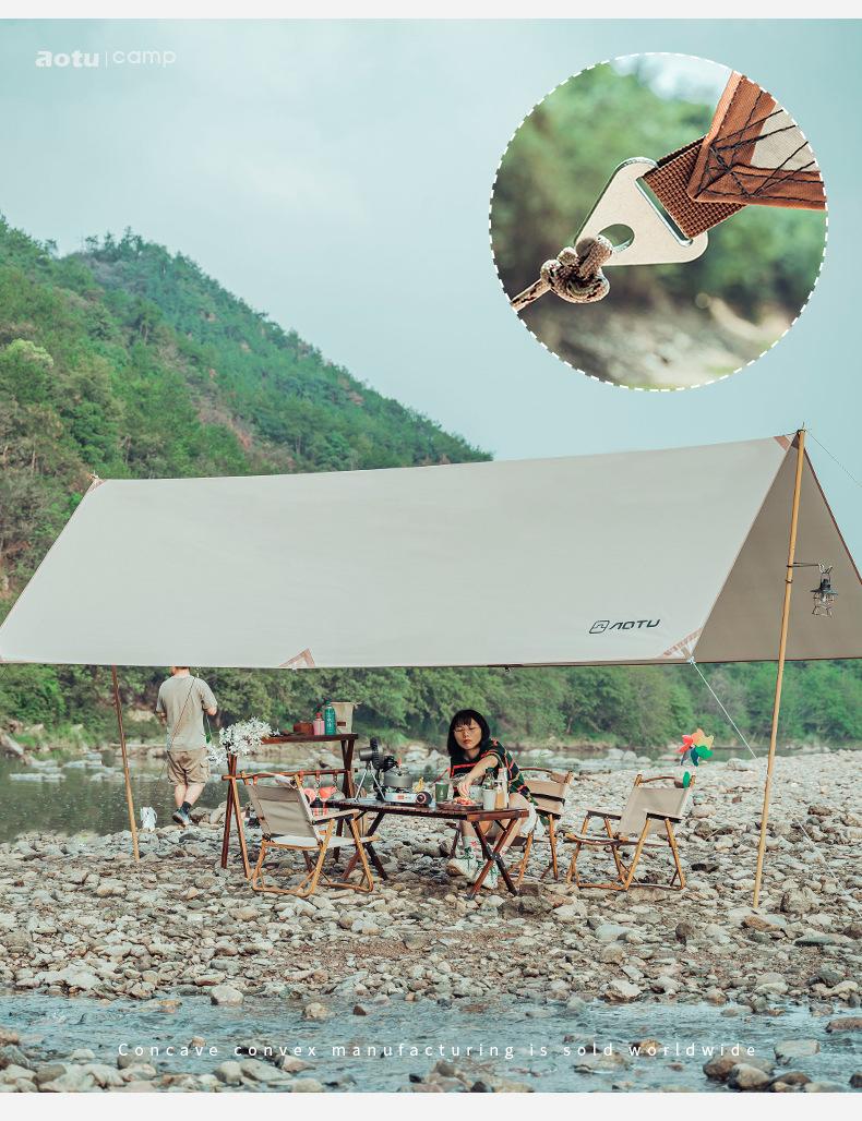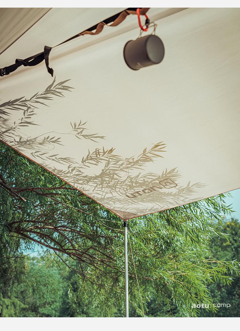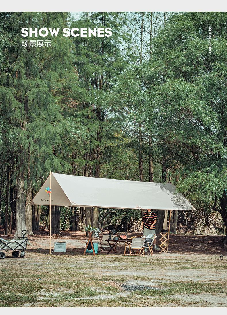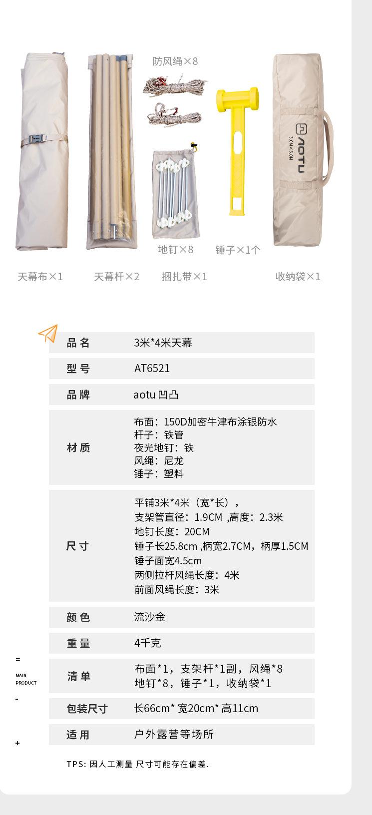 Lista: tela*1, varilla de soporte*1 par, cuerda de viento*8, estaca de tierra*8, martillo*1, bolsa de almacenamiento*1