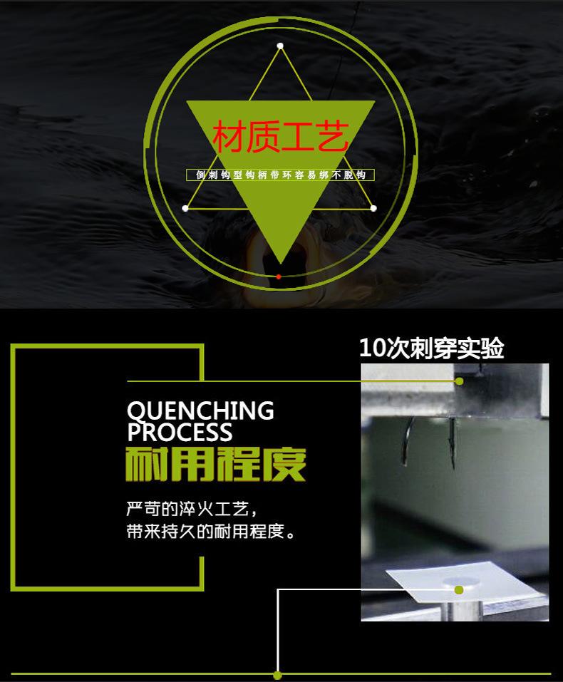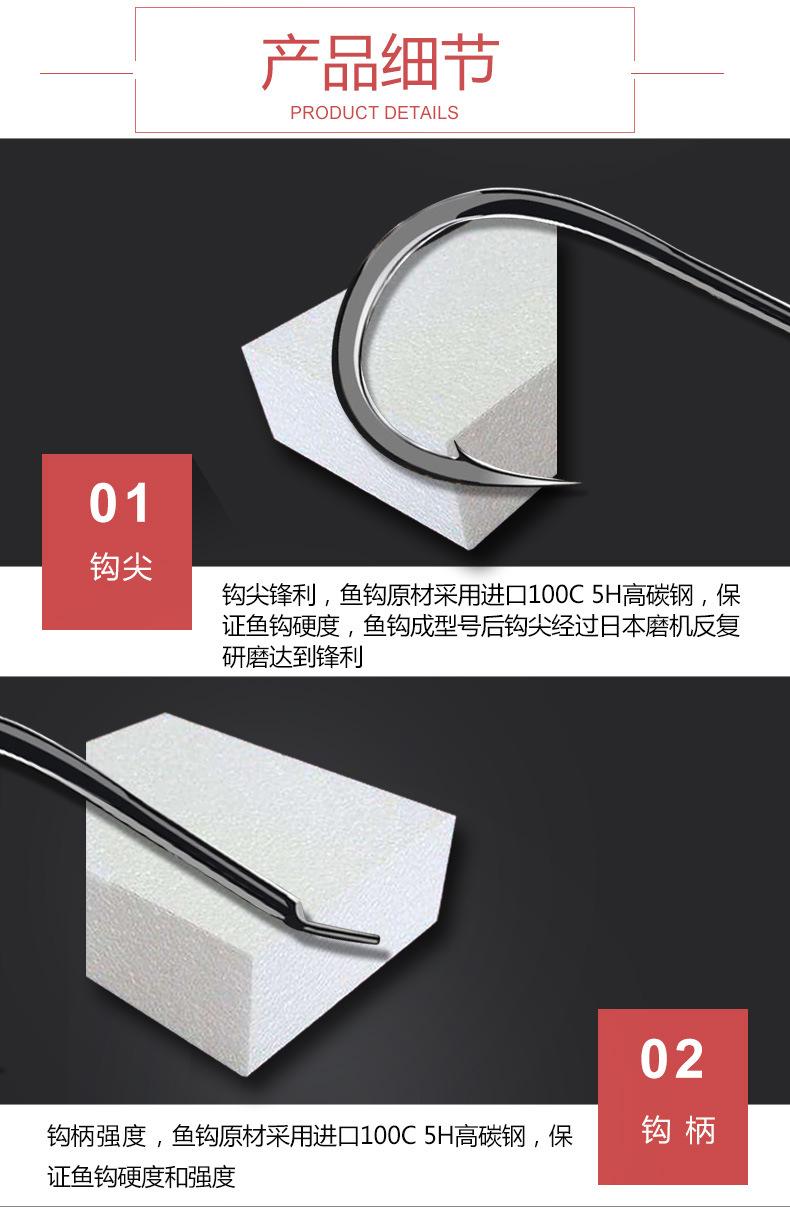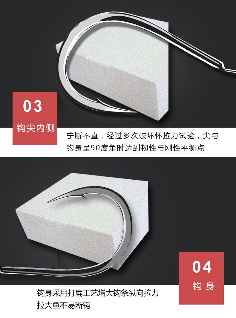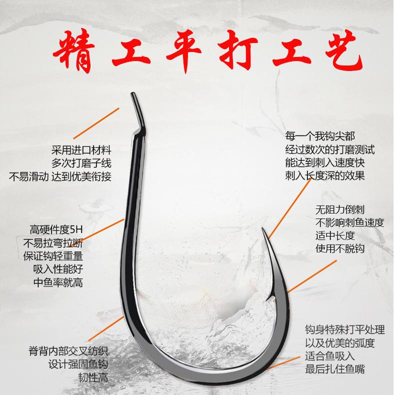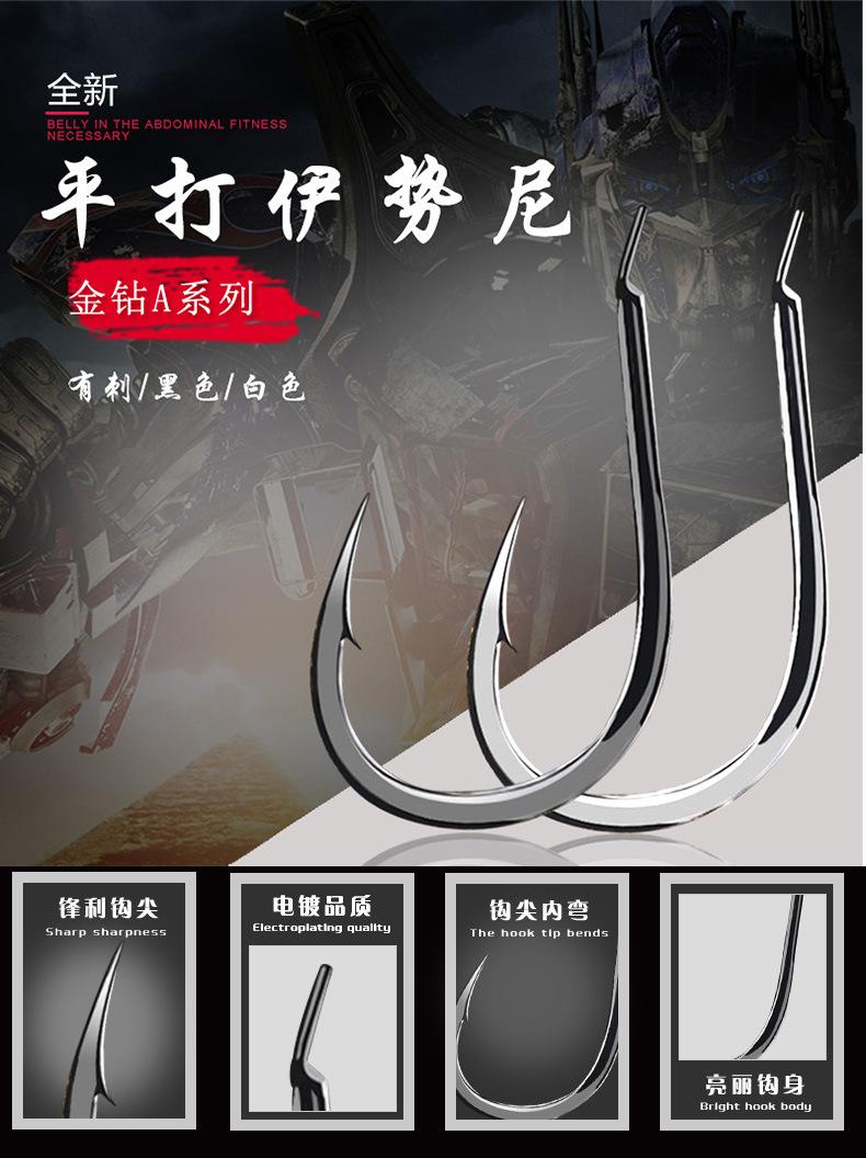 Manga: Este tipo de anzuelo no tiene púas. La punta es afilada, el mango es largo, el anzuelo es delgado y el cuerpo es ligero. Es adecuado para peces pequeños que se alimentan por succión. Es rápido de atrapar y de morder. Se utiliza principalmente para capturar carpas blancas, pequeños peces blancos, etc.
