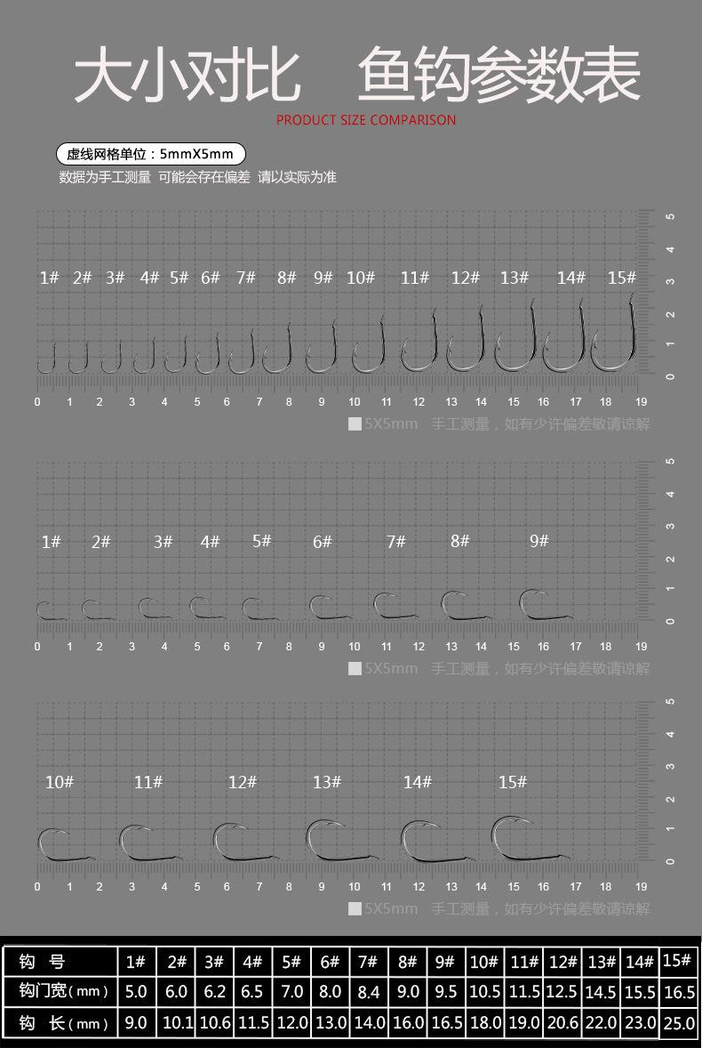 Los tipos representativos de anzuelos de mango corto incluyen los de forma Maru, Ise-ni, Maru-sode y Turtle, etc. Se utilizan principalmente para pescar en aguas poco profundas, en zonas de pesca con una profundidad de agua de 2 metros o menos. Dado que la tasa de mordida de los anzuelos de mango corto es mayor que la de los anzuelos de mango largo, se utilizan en una gama más amplia. Muchos pescadores los reprocesan y sueldan un anzuelo (anzuelo ascendente) con una ranura para atar la línea en el ojo del anzuelo para pescar peces de agua dulce. La diferencia entre los anzuelos de mango largo y los de mango corto es que los primeros se utilizan principalmente para pescar peces de aguas profundas, como carpas, carpas negras y carpas herbívoras. Los segundos se utilizan principalmente para pescar carpas crucianas, doradas y sargos en aguas poco profundas, etc.