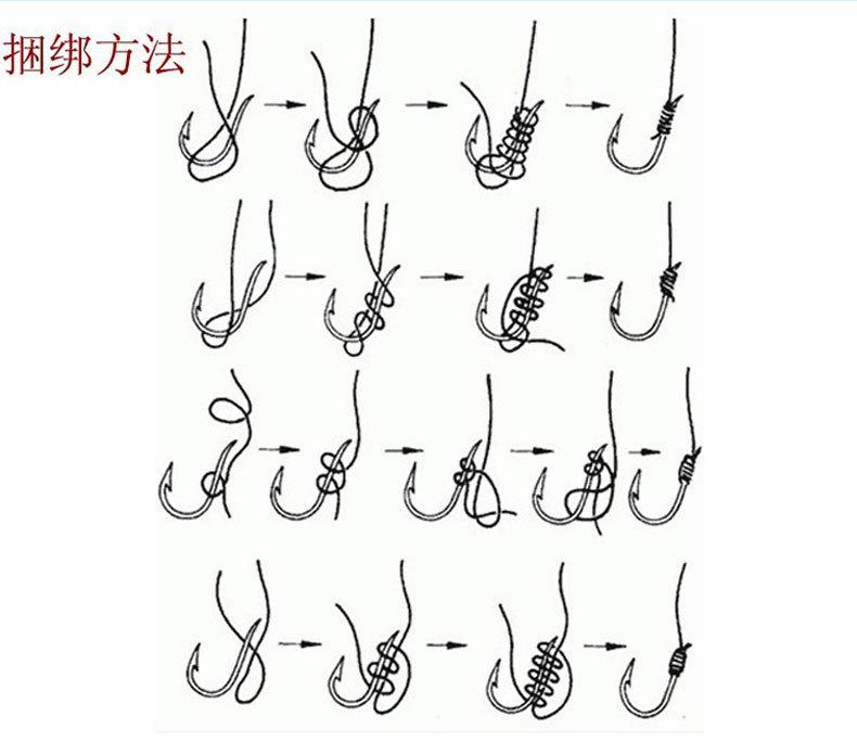 Al atar el anzuelo, tenga en cuenta lo siguiente: independientemente del tipo de sedal que utilice, debe atar los extremos superior e inferior del sedal al interior del anzuelo para asegurar que la fuerza de tracción sea la correcta al capturar el pez y evitar que se caiga. Si utiliza varias hebras de hilo de seda como línea de cerebro o un anzuelo de bomba autoatado, no las enrolle más de cuatro veces al atar el anzuelo. Si lo enrolla demasiado, será difícil atar el anzuelo con fuerza y el hilo de seda se soltará fácilmente del mango. También puede atar un sedal de doble hebilla de "8", que puede tensar y fortalecer el anzuelo.
