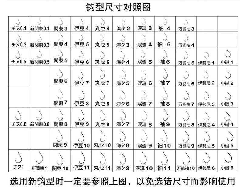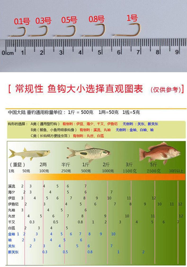 Para la pesca de peces pequeños como la carpa cruciana y la dorada en estanques y zanjas, se recomienda usar anzuelos de manga corta y boca redonda. Los modelos incluyen 4-7, Ise 3-5 y Chimata 0.8-1. Para la pesca competitiva, elija Kanto 5-8 e Izu 5-8. Al elegir un anzuelo, puede usar la punta para arrastrarlo suavemente sobre la uña del pulgar. Elija anzuelos que no sean fáciles de arrastrar sobre la uña, ya que son pegajosos y astringentes, y pueden dejar marcas blancas con un poco de fuerza. Dentro del mismo tipo de anzuelos, elija el más delgado posible, con mayor dureza y elasticidad. En cuanto al color del anzuelo, puede elegir anzuelos negros, verdes, azules, blancos metalizados y rojos, según sus preferencias.
