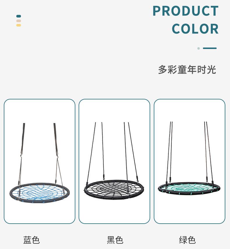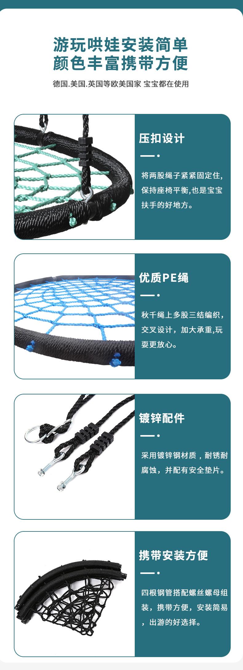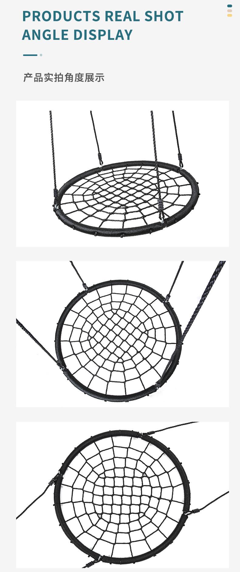 Este columpio está hecho con 3 cuerdas de polietileno, hechas a mano, no tóxicas, ecológicas y libres de contaminación. La plataforma del columpio está compuesta por 4 secciones de anillos de hierro recubiertos de plástico, desmontables y fáciles de instalar. Es un excelente juguete para el ocio en casa.