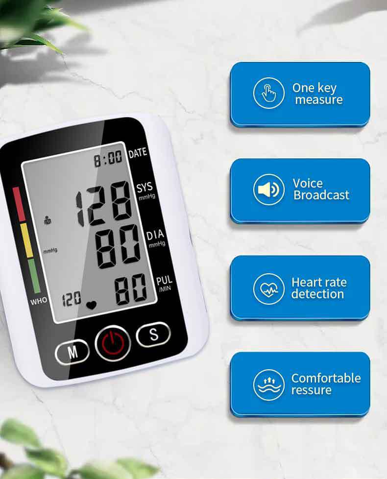 | 13. Ventajas: | Medición con un solo botón, monitoreo de frecuencia cardíaca, brazalete cómodo, pantalla grande y caracteres grandes, presurización inteligente, medición precisa, pequeño y exquisito, fácil de transportar. |