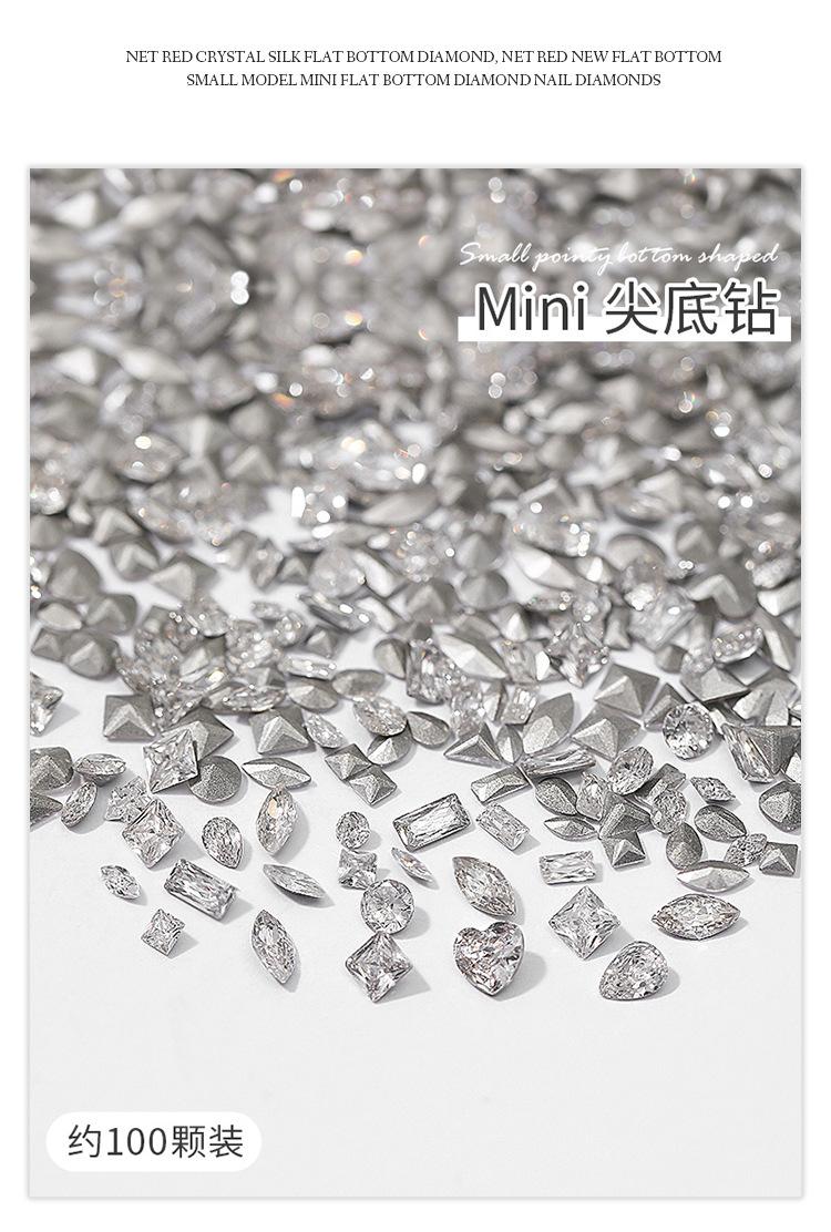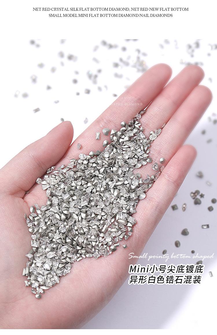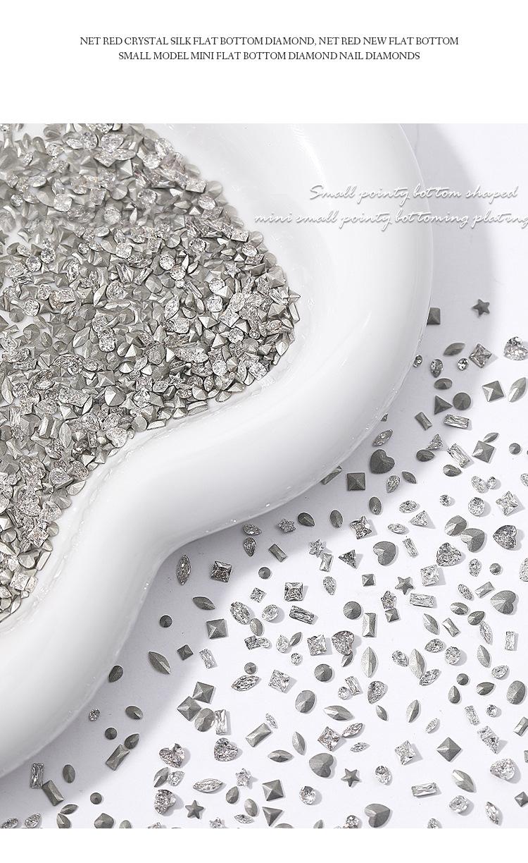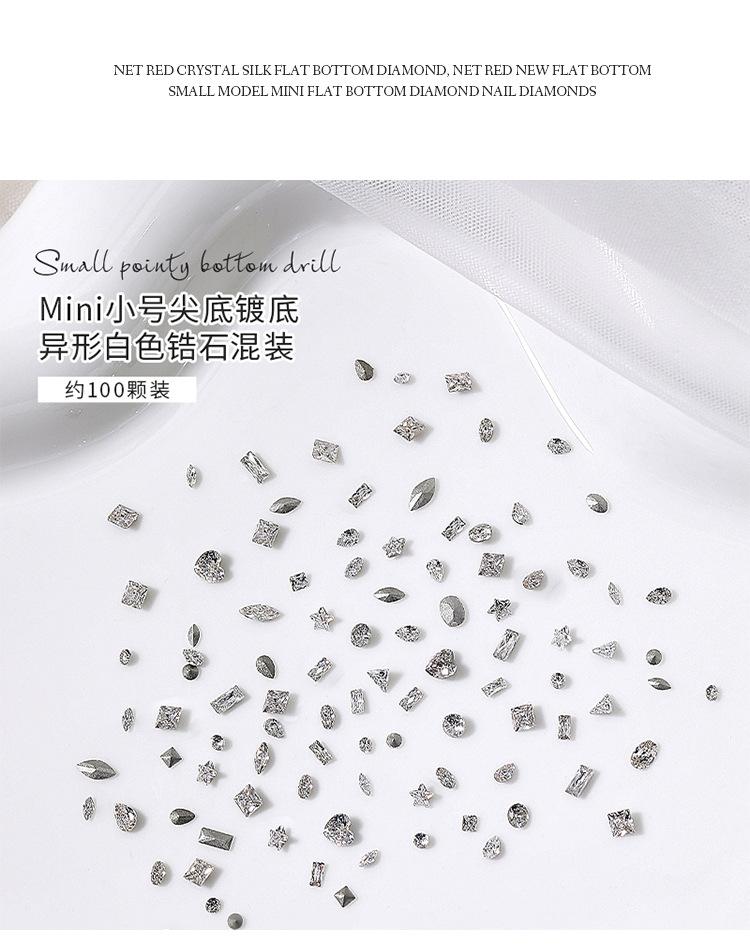 Mini tamaño pequeño, base puntiaguda, base plateada, forma de piedra blanca, decoraciones para uñas, tamaño de uña, pegatinas mixtas, taladro, venta al por mayor
