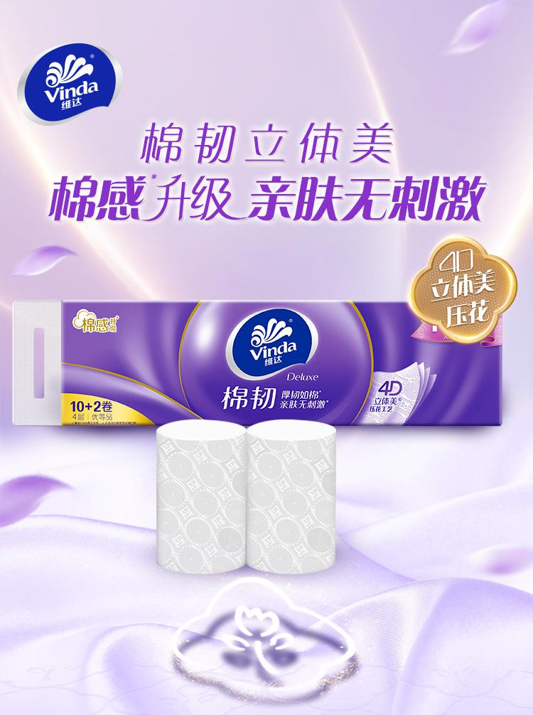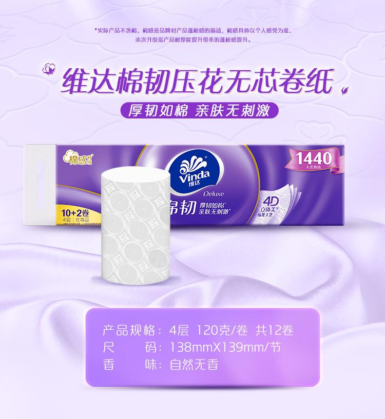 Papel Higiénico Vinda Rollo Algodón Resistente Sin Centro 4 Capas 120g 12 Rollos Suave y Cómodo para el Hogar Asequible