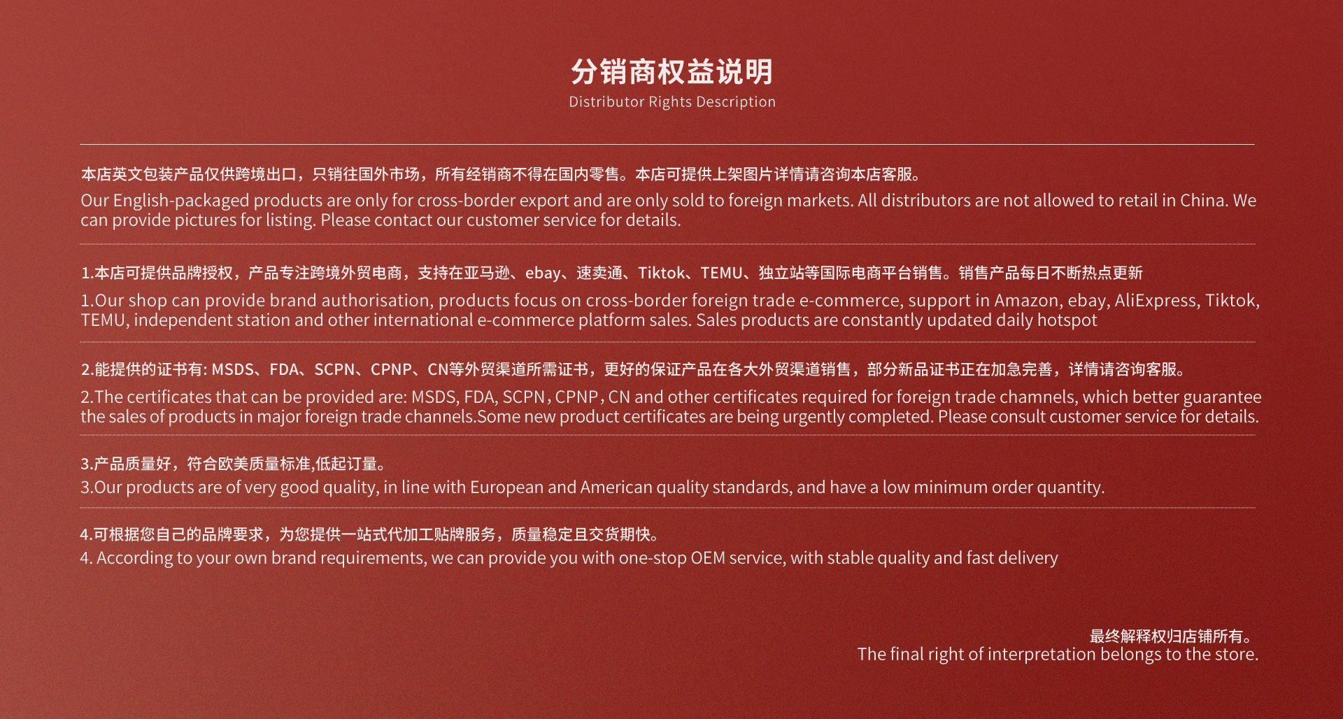 2) Las ganancias de las ventas al por mayor son escasas. Si surgen problemas como insatisfacción con el producto o daños causados por la logística, no se aceptarán reembolsos ni descuentos. El 3% se encuentra dentro del rango normal de pérdidas de transporte. Por favor, comprenda. Los gastos de envío de las devoluciones y los cambios corren a cargo del cliente. Somos un fabricante líder y preparamos y sellamos la mercancía con rigor.