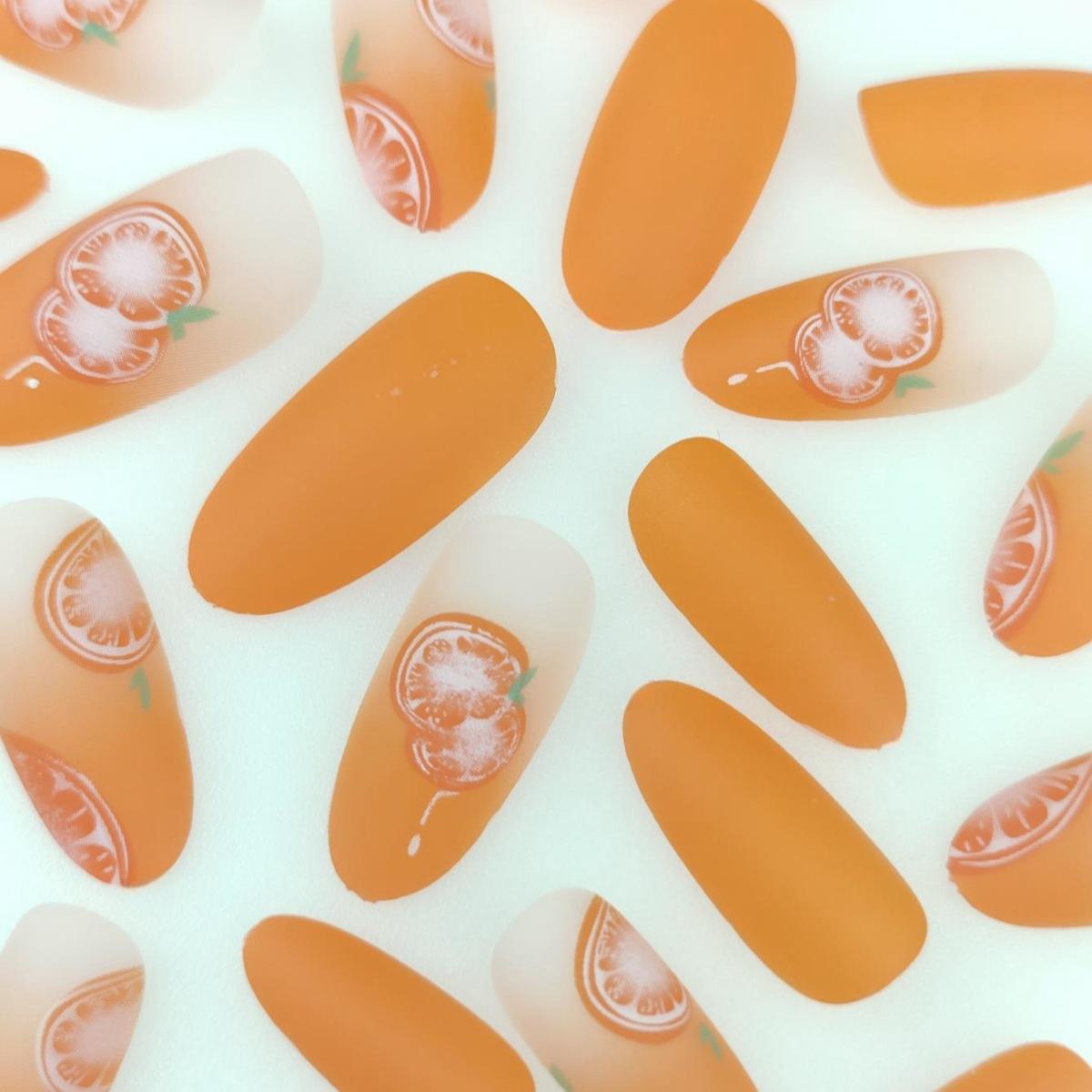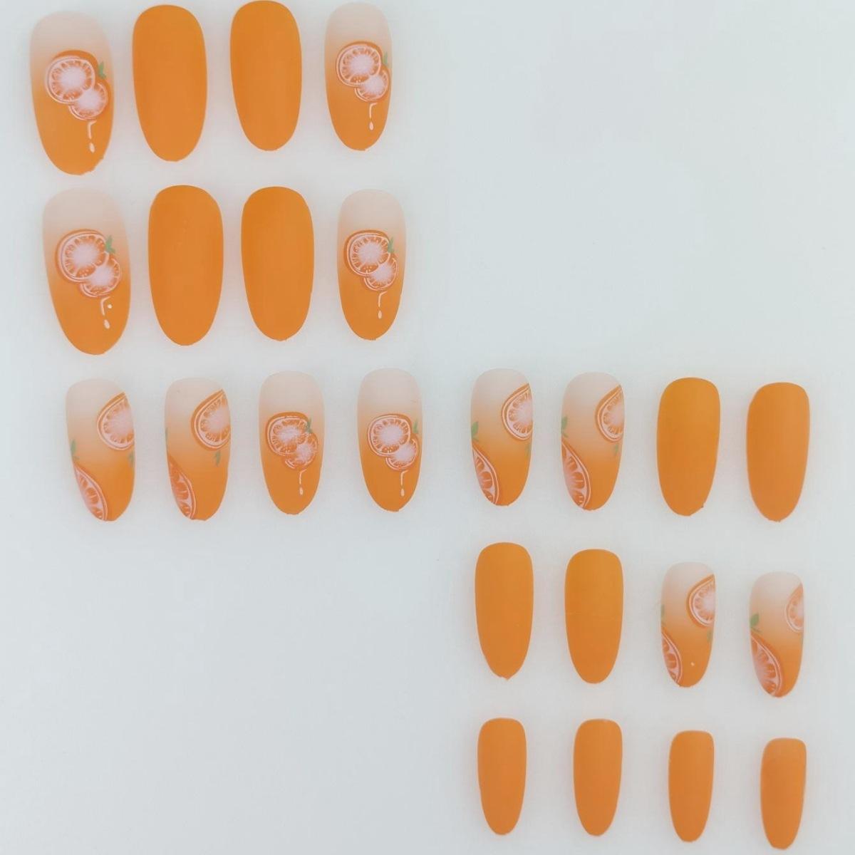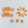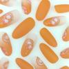 Uñas postizas con diseño de corazón ovalado largo y esmerilado, color naranja, con degradado de viento y parche terminado.