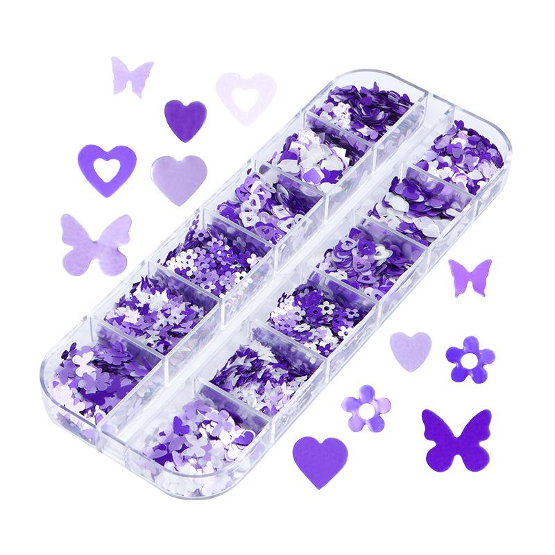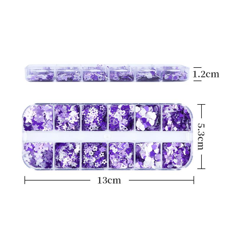 Caja larga de 12 compartimentos serie púrpura mixta lentejuelas para arte de uñas