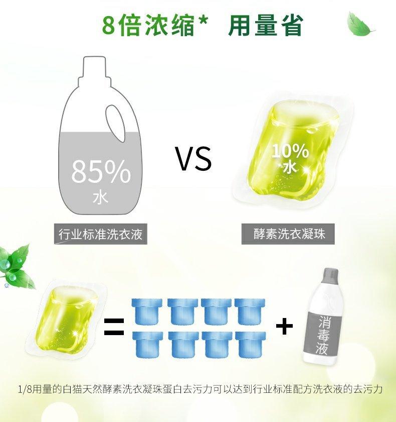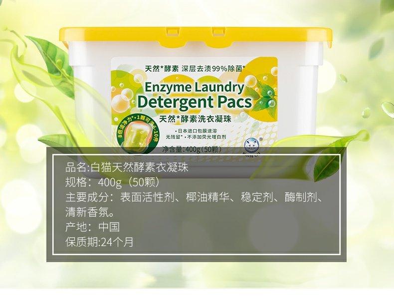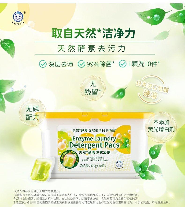 Cápsulas de gel para lavandería con enzimas naturales para gato blanco 400g50 remoción profunda de manchas sin residuos 99% esterilización 8 veces poder de limpieza