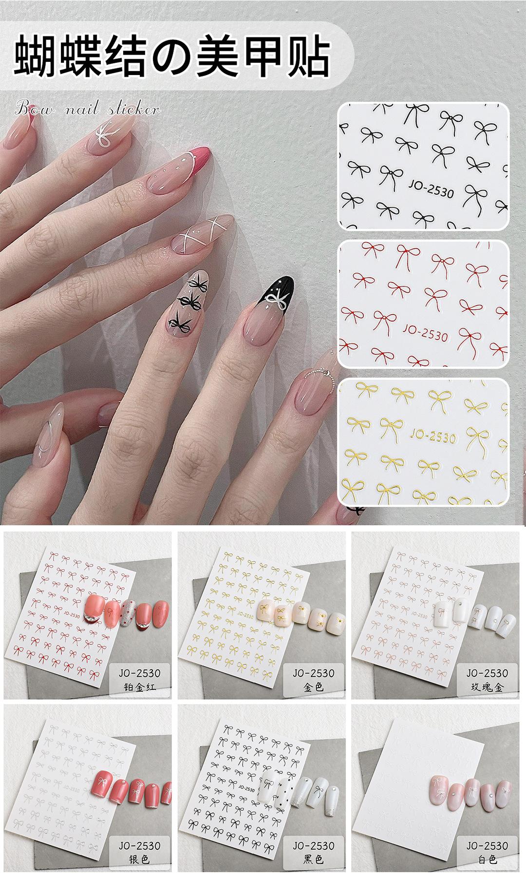 Pegatinas para decoración de uñas con lazo, en blanco y negro, dorado y plateado, finas y resistentes, decoraciones 3D sencillas para uñas.