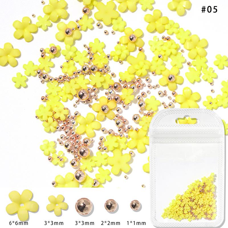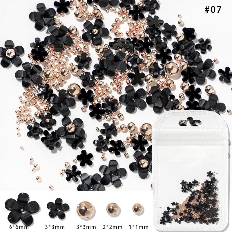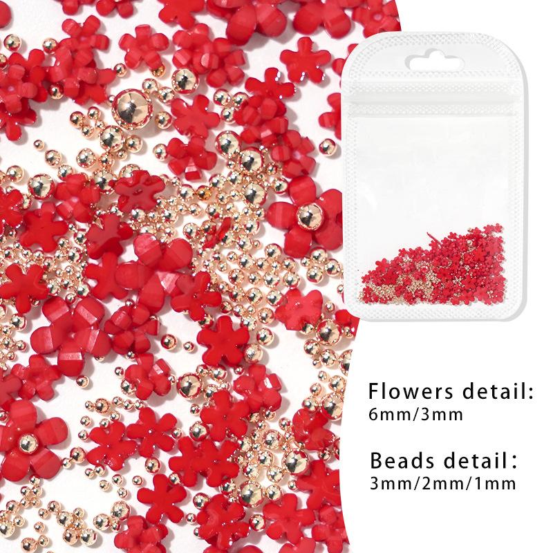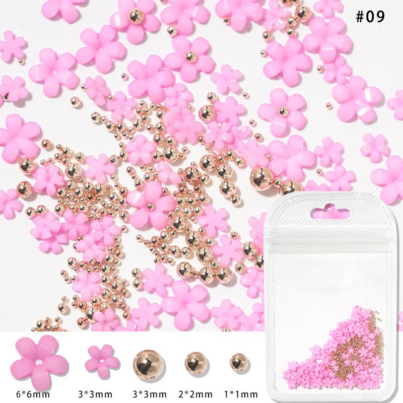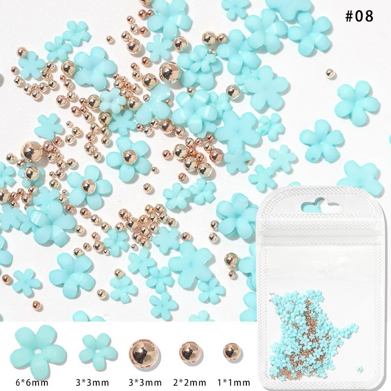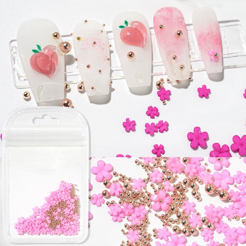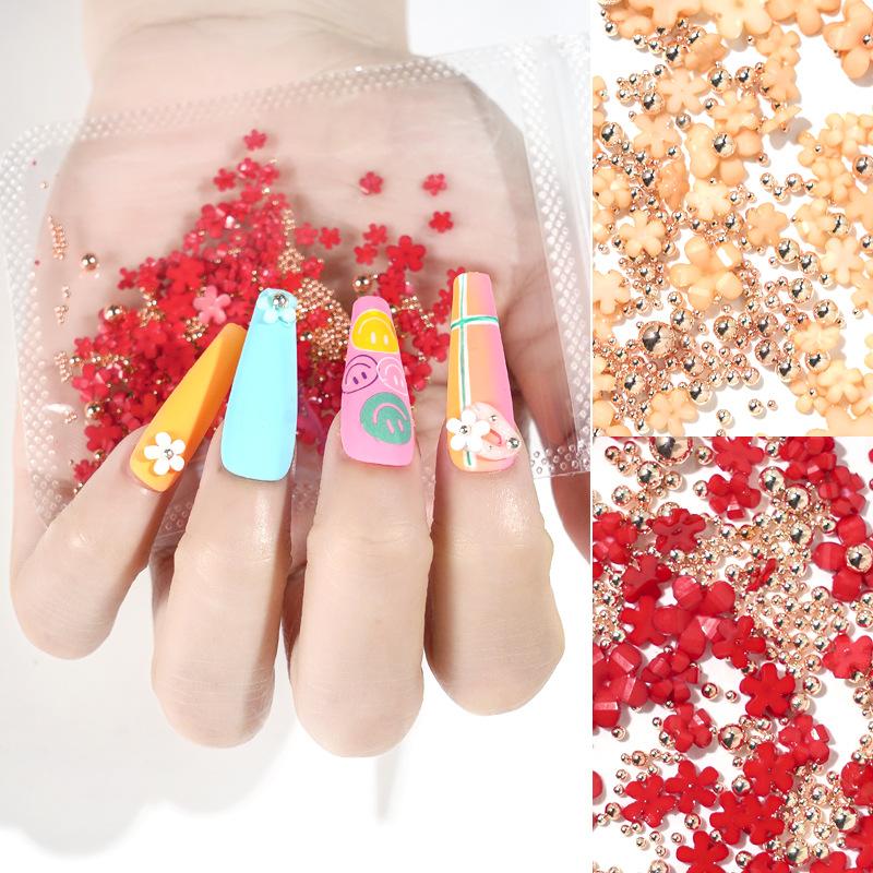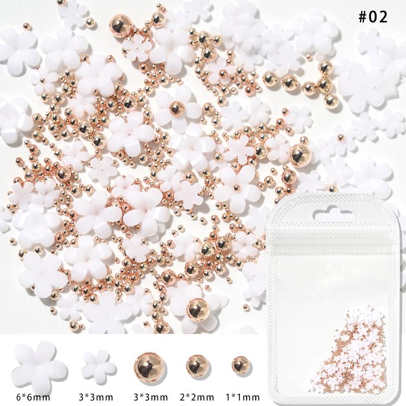Nombre del producto: Mini flor de acero con cuentas, accesorios para decoración de uñas, linda flor de diamante con cuentas doradas tridimensionales, versátil decoración de uñas con flores de cinco pétalos.