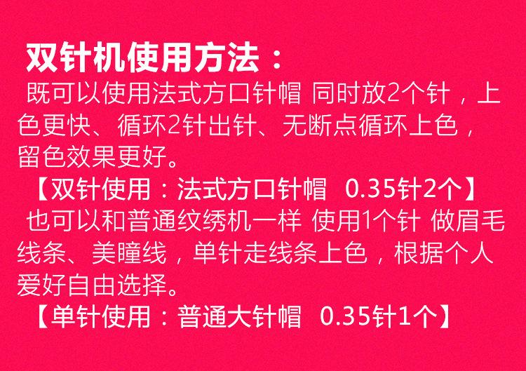 Cómo utilizar la máquina de doble aguja: ① Puede usar la boquilla cuadrada francesa para colocar dos agujas al mismo tiempo, lo que puede colorear más rápido y ciclar 2 agujas sin interrupción, y el efecto de retención del color es mejor. [Uso con doble aguja: boquilla cuadrada francesa aguja 0.35 2 piezas] ② También puedes usar una aguja para hacer líneas de cejas y líneas de cejas como una máquina de tatuar ordinaria, y usar una sola aguja para colorear las líneas. Puedes elegir libremente según tu preferencia personal. [Uso de una sola aguja: tapa de aguja grande común de 0,35 agujas, 1 pieza] Si necesita un enlace de aguja y tapa de aguja, comuníquese con el servicio de atención al cliente para que se lo envíen. La máquina de doble aguja tiene todas las funciones de una máquina de una sola aguja, y también puede colorear y nebulizar con agujas dobles, lo que la convierte en una máquina multiusos.