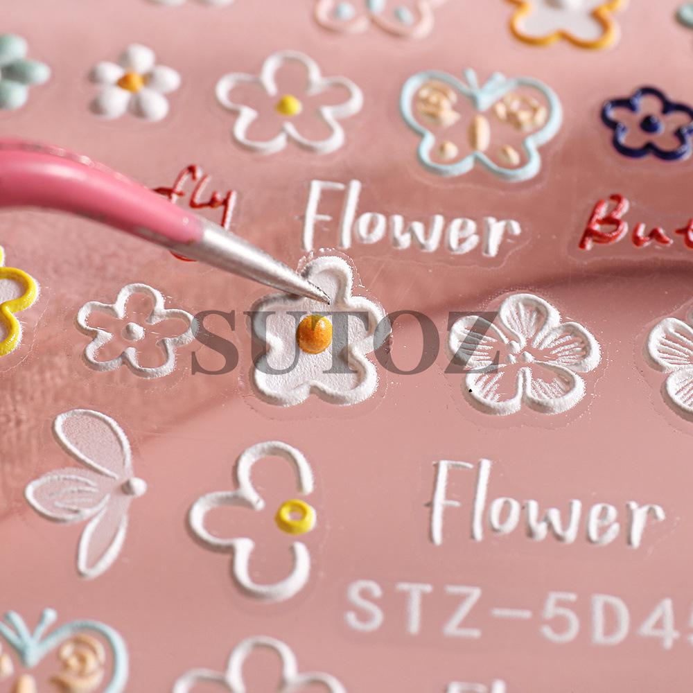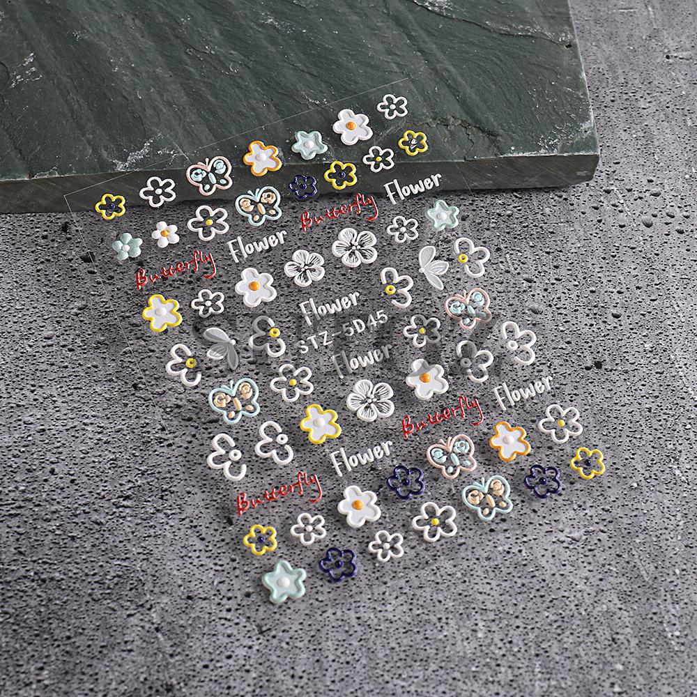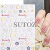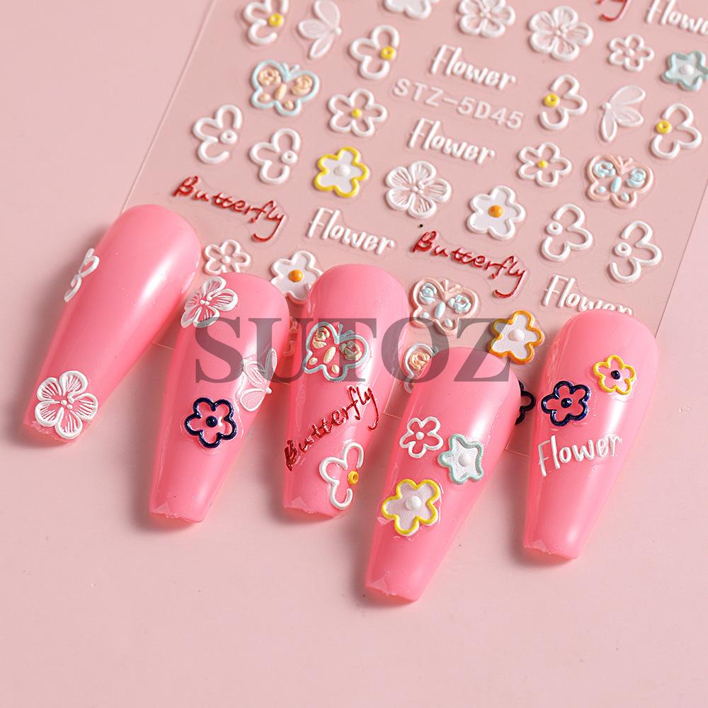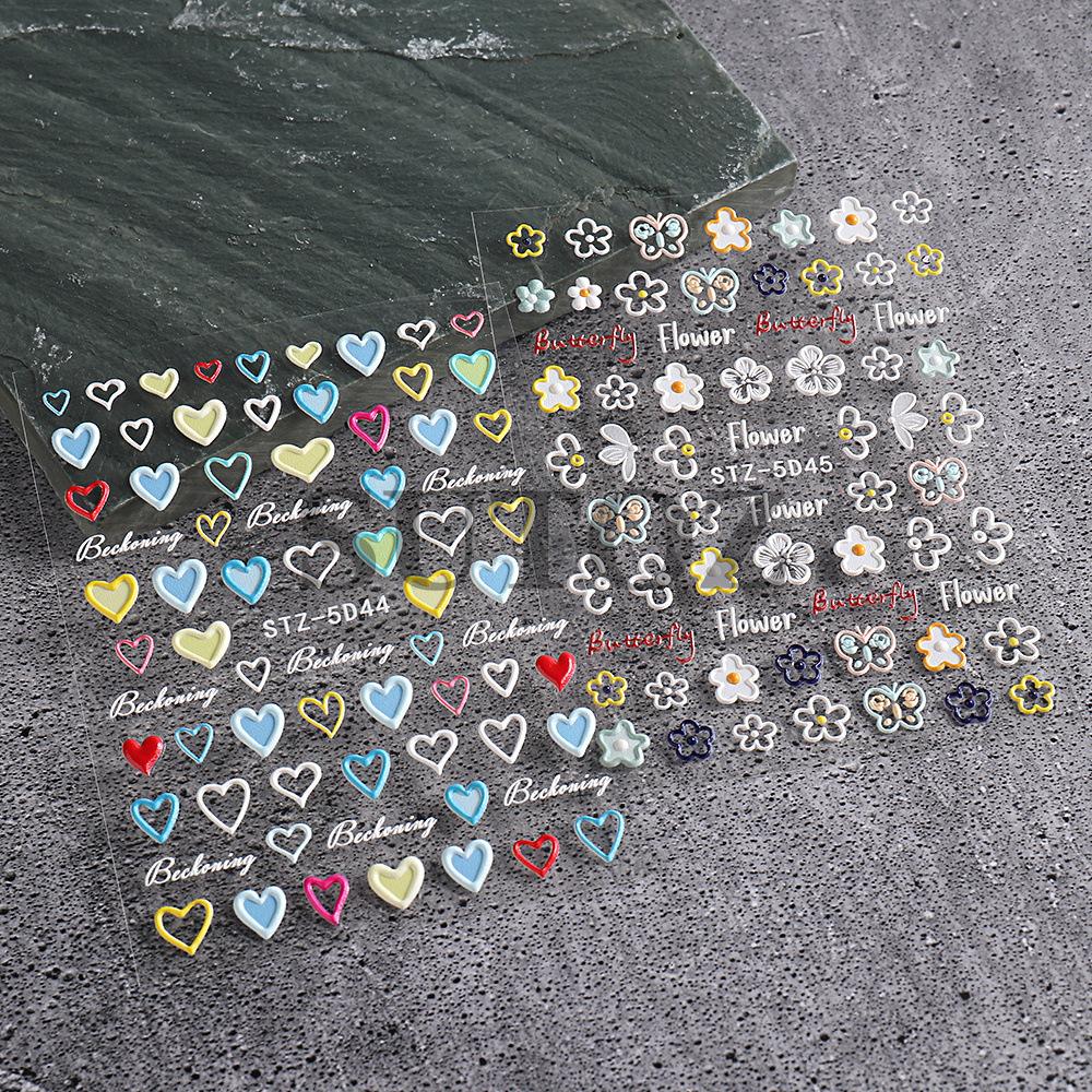 Nuevas pegatinas de uñas transfronterizas 5D con diseño tridimensional de flores huecas, mariposas y corazones, pegatinas de uñas con dibujos animados en inglés.