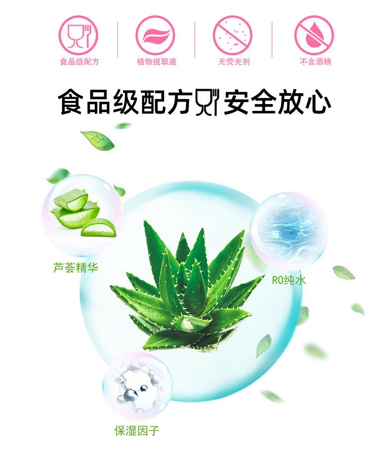 Principales materias primas: tela no tejida, agua pura RO, glicerina natural, esencia de aloe vera, esencia de aceite de oliva, etc.