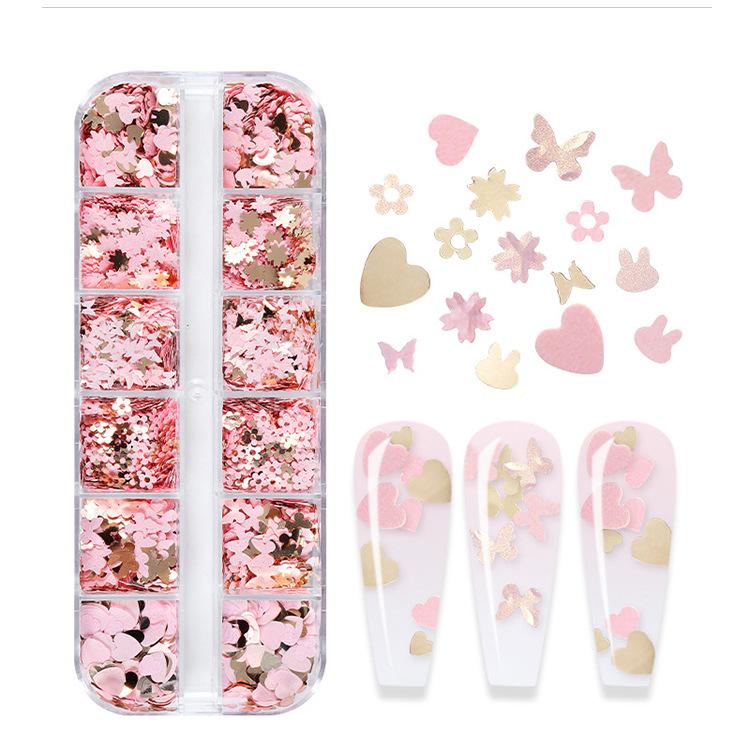 Nuevos Accesorios para Nail Art Decoraciones Mixtas 6 Cuadrículas 12 Cuadrículas Caja Larga Accesorios para Uñas Mariposa Corazón Flor Calcomanías Venta al por Mayor