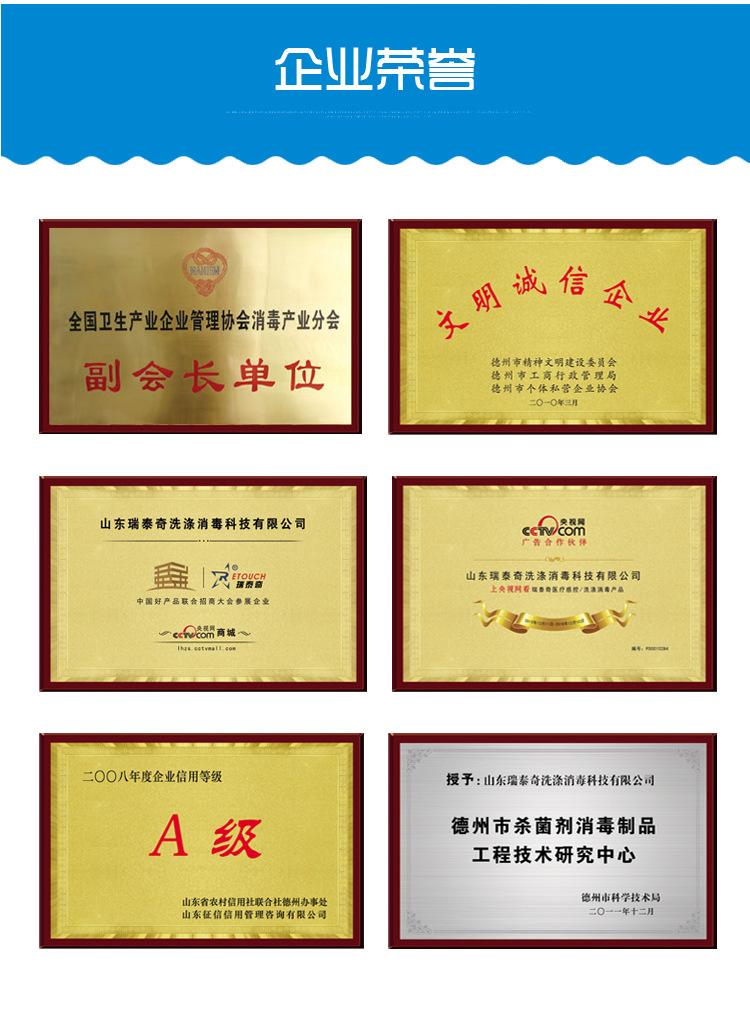 2009En 2011, se construyó el primer taller de purificación de nivel 10.000 y parcialmente de nivel 100 en la industria de la desinfección en la provincia de Shandong.2011En 2017, se convirtió en el primer fabricante de la provincia de Shandong en obtener la calificación para producir desinfectantes para la piel y las membranas mucosas.2014En 2017, Ruitaiqi se convirtió en la primera empresa de la industria del lavado y la desinfección en patentar productos de envasado antibacterianos. Ruitaiqi ha construido un centro de pruebas experimentales y un laboratorio técnico independientes, equipados con equipos de prueba de vanguardia en la industria actual de la desinfección, como cromatografía líquida de alta resolución, cromatografía de gases, espectrofotómetro ultravioleta y otros instrumentos de gran tamaño para garantizar la calidad constante del producto.2008En 2000, fue reconocida como una empresa de alta tecnología en la ciudad de Dezhou.2010Se convirtió en el proveedor designado de desinfectante para la 4ª Conferencia de Sun City.2011En 2000, se le otorgó el Centro de Investigación de Tecnología de Ingeniería de Productos de Desinfección Antiséptica de la Ciudad de Dezhou.2009Año,2012Año"Ritech"La marca ha sido reconocida como una marca famosa en la provincia de Shandong durante muchos años.2011El año fue reconocido como"Centro de Ingeniería y Tecnología de Productos de Desinfección Bactericida de Dezhou",2015El año fue reconocido como"Centro de Tecnología Empresarial Municipal de Dezhou",2016En 2017, fue seleccionado para el archivo de la marca CCTV. Asimismo, Ruitaiqi es miembro del Comité Nacional de Estándares de Desinfección, el Comité de Infecciones Hospitalarias, la Sección de Desinfección de la Sociedad de Medicina Preventiva, la Sección de Infecciones Hospitalarias de la Sociedad de Medicina Preventiva, el Comité Profesional de Infecciones Hospitalarias del Comité de Gestión Hospitalaria y el Comité Profesional de Suministros de Desinfección y Esterilización de la Sociedad de Enfermería.2017A finales de año, Ruitaiqi fue calificado como vicepresidente de la unidad de la Rama de la Industria de Desinfección de la Asociación de Gestión Empresarial de la Industria Nacional de la Salud.