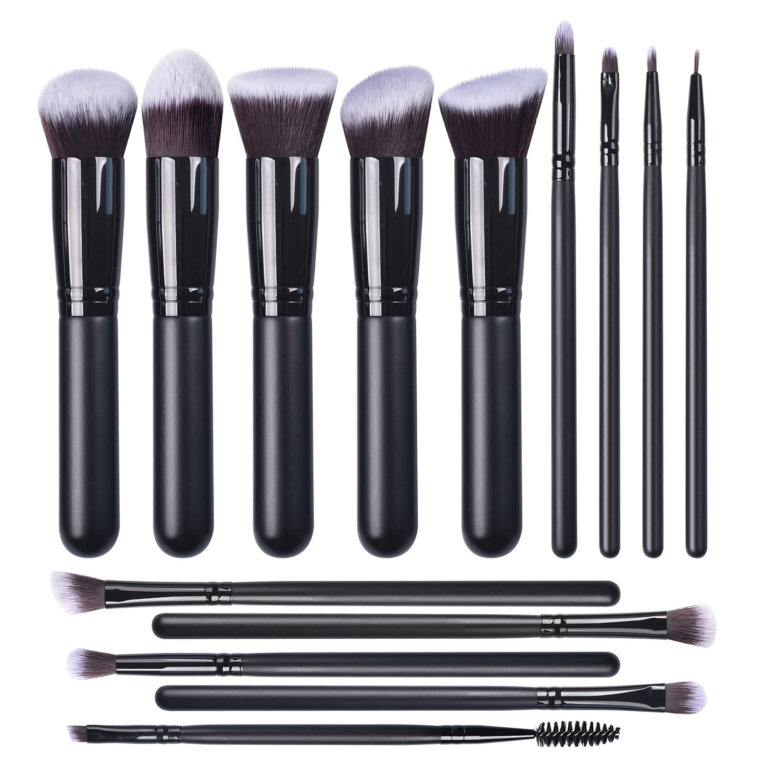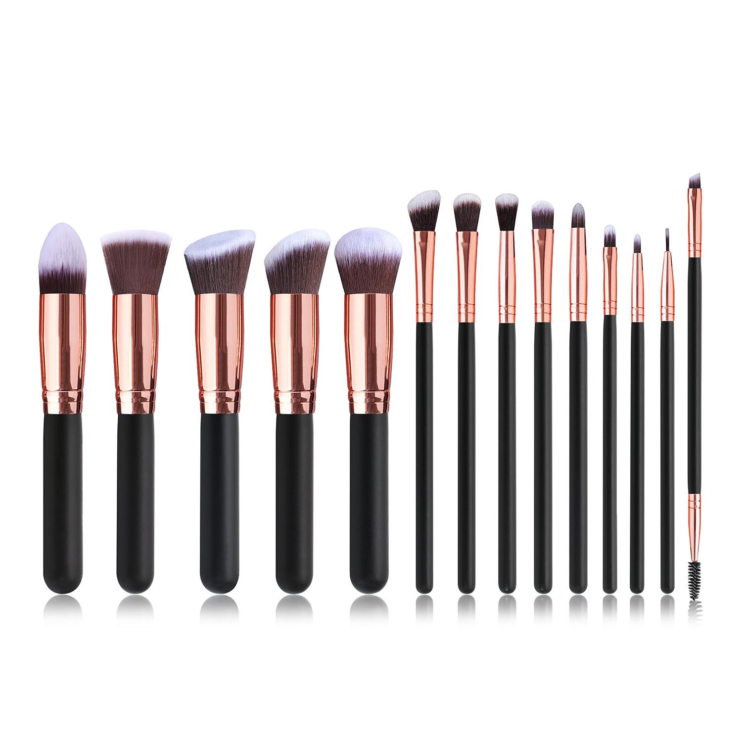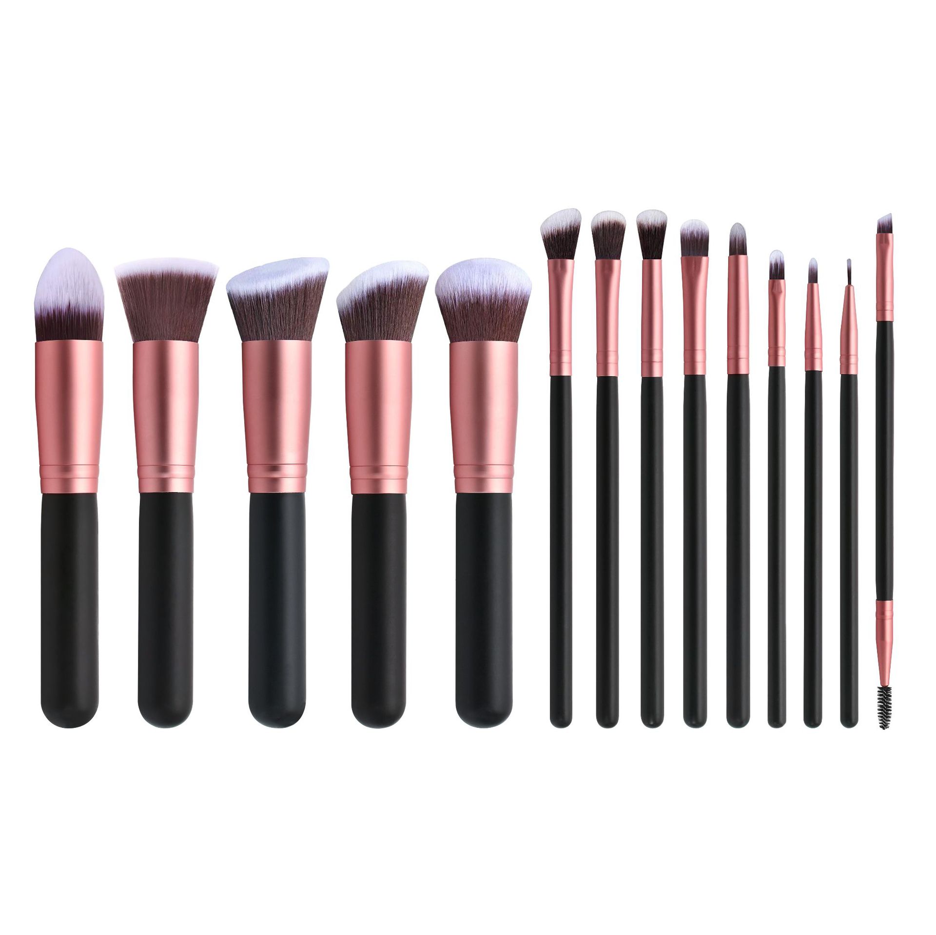 ![]() Juego de 15 brochas de maquillaje de oro rosa con cerdas de fibra negra y mango de madera, incluye bolsa nueva.