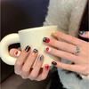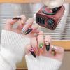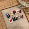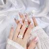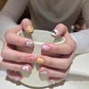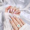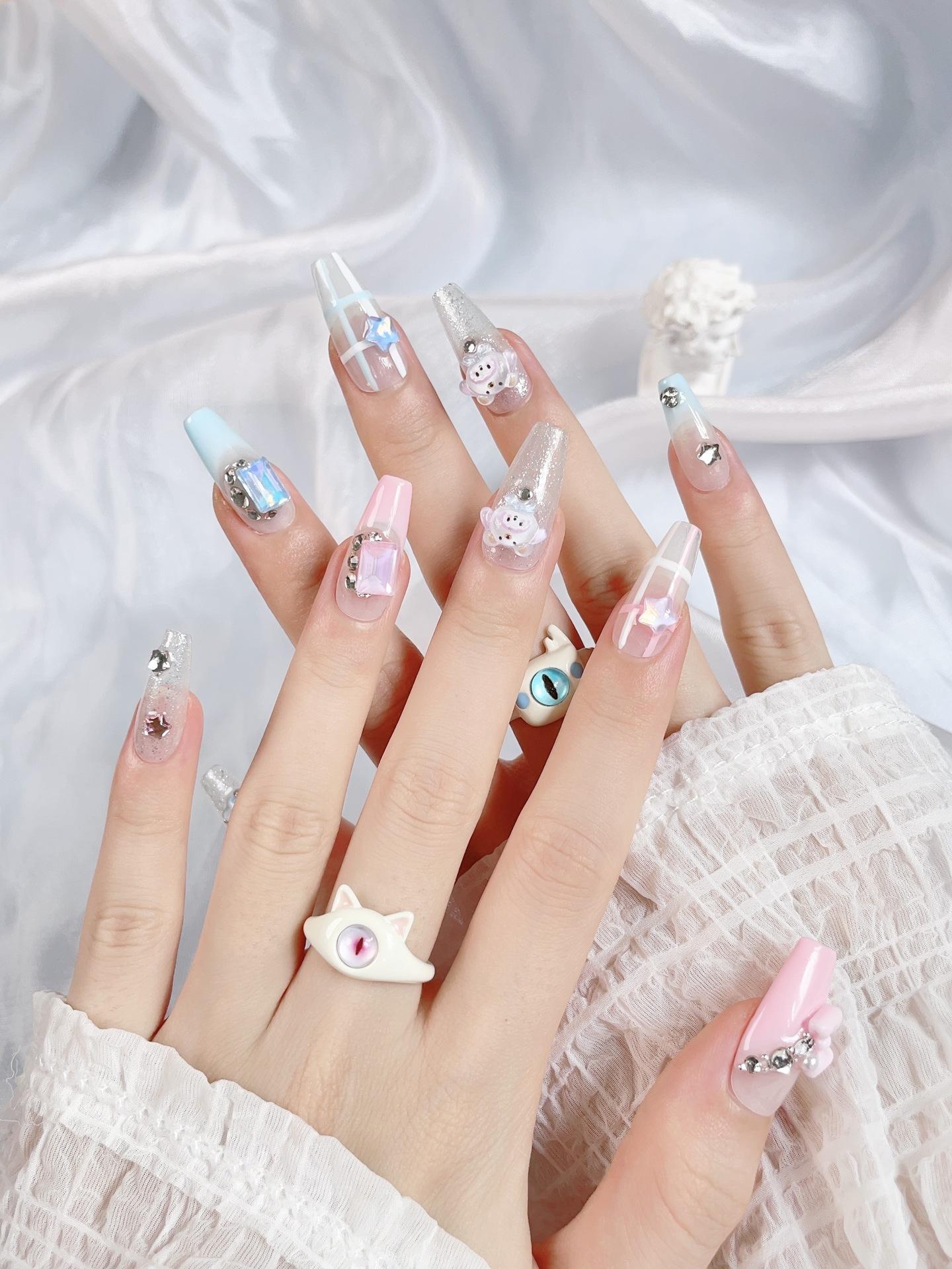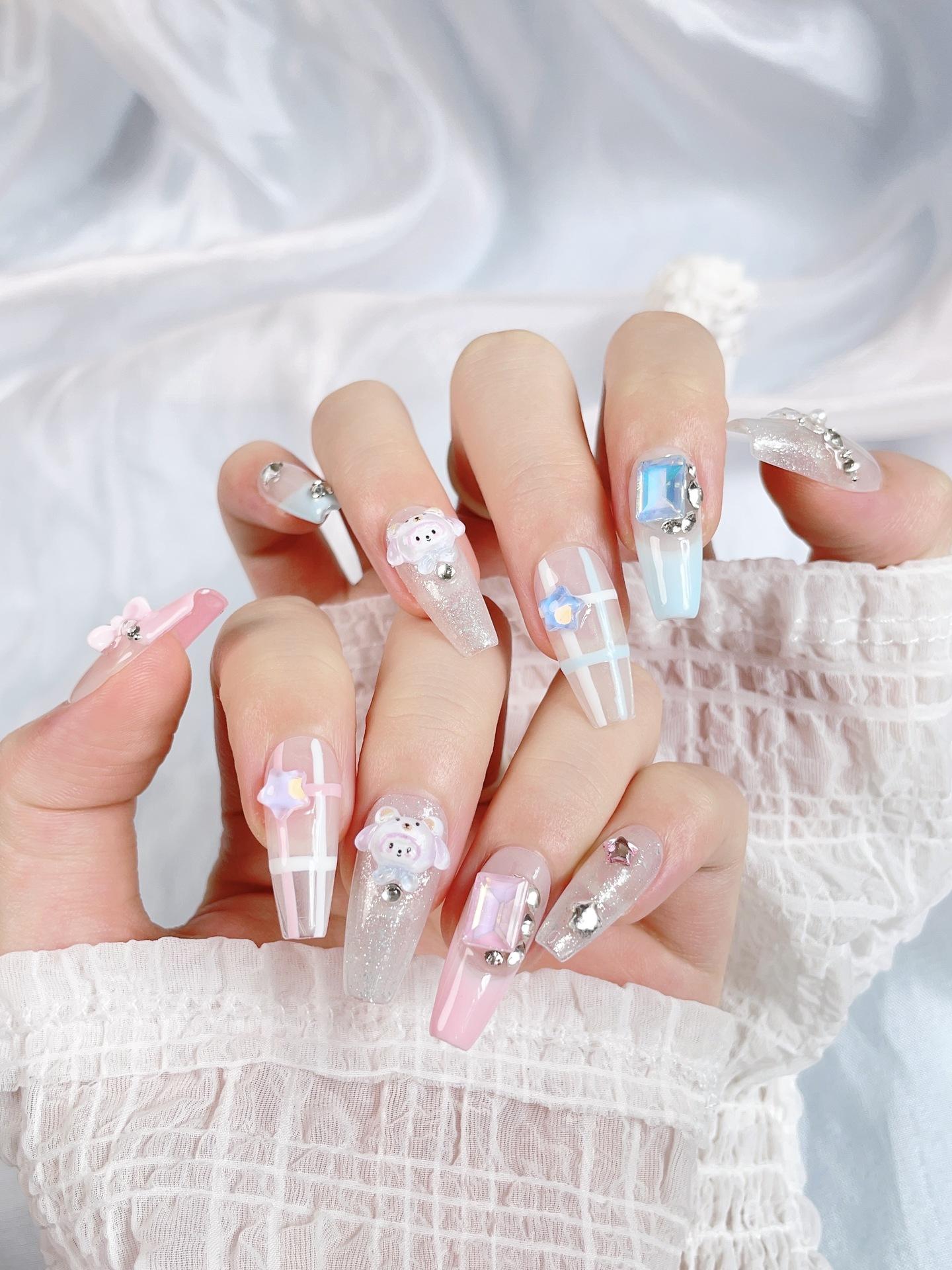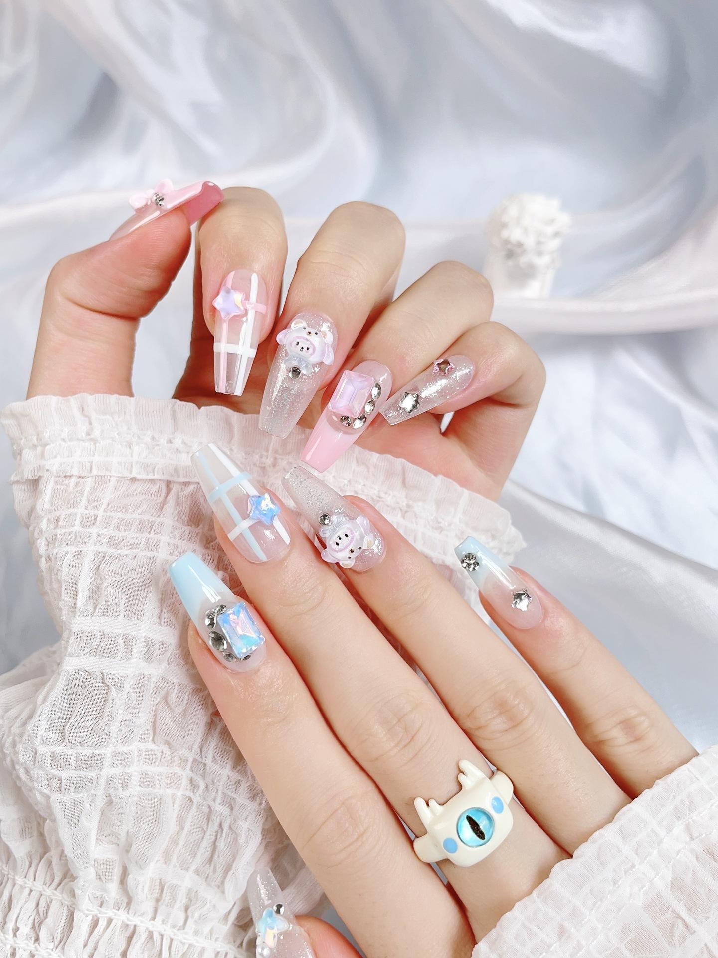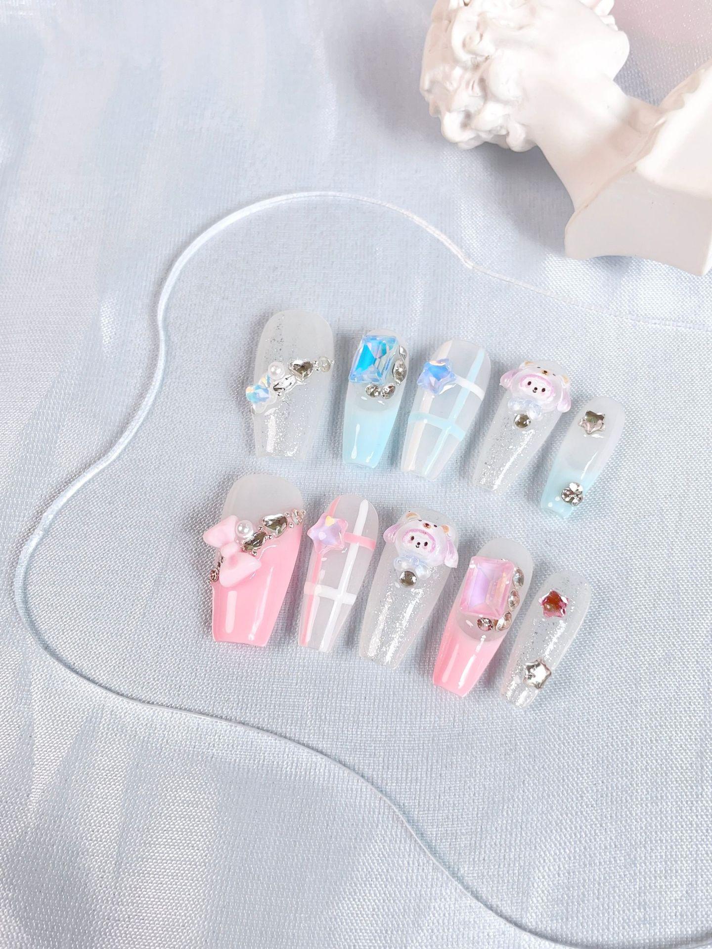 Uñas postizas de estudiante con diseño de boutique de longitud media, con armadura pura, pintadas a mano y terminadas con parches de diamantes de dibujos animados.