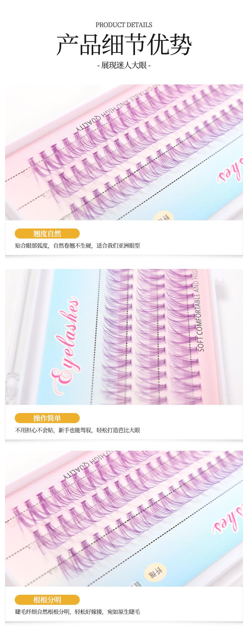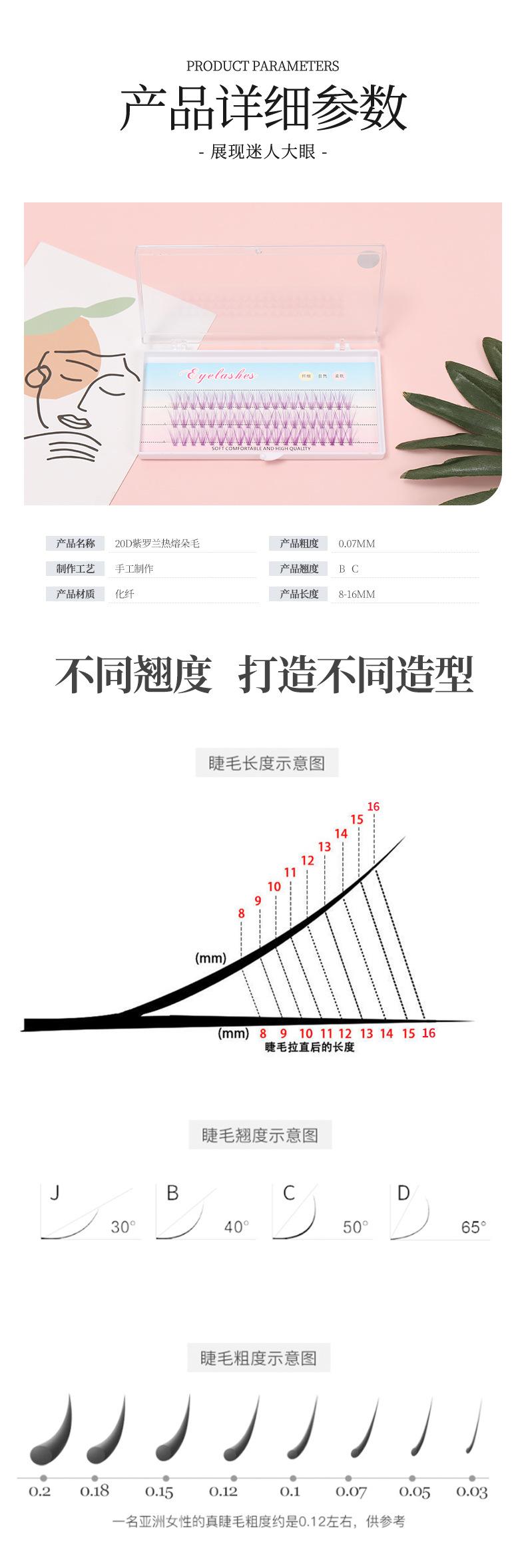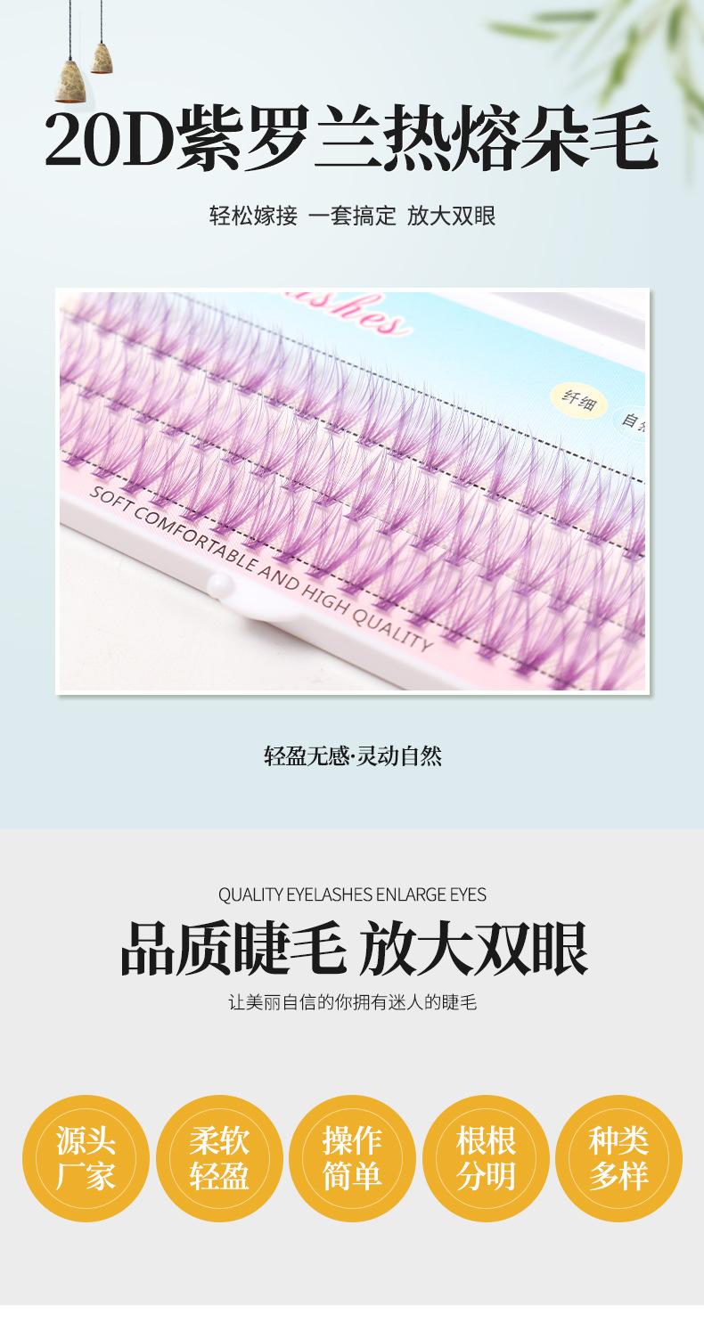 Cabello violeta de fusión caliente 20D (Corte de raíz) autoinjerto de pestañas plantación cola de golondrina racimo único pestañas segmentadas