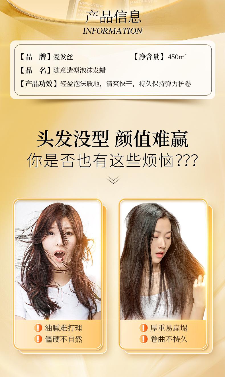 Espuma para el cabello Love Hair, cera para el cabello, forma esponjosa, fragancia hidratante, spray para peinar para hombres y mujeres, venta directa de fábrica al por mayor