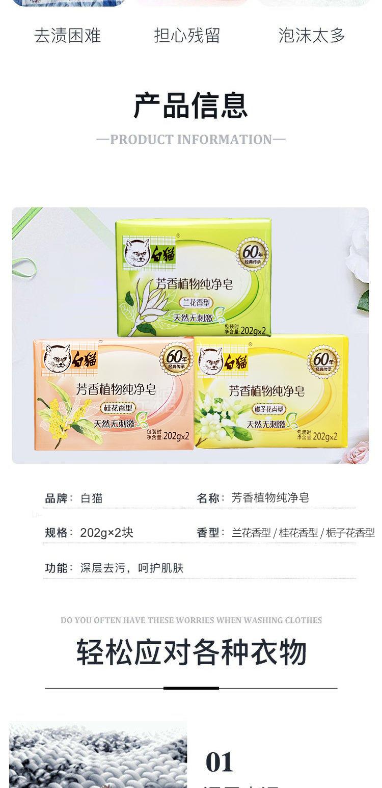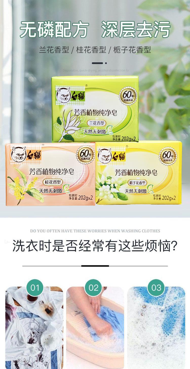 Jabón puro aromático de planta de gato blanco (Orquídea, osmanthus, Gardenia) 202g * 2 quita manchas de ropa familiar