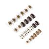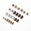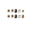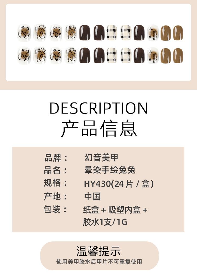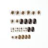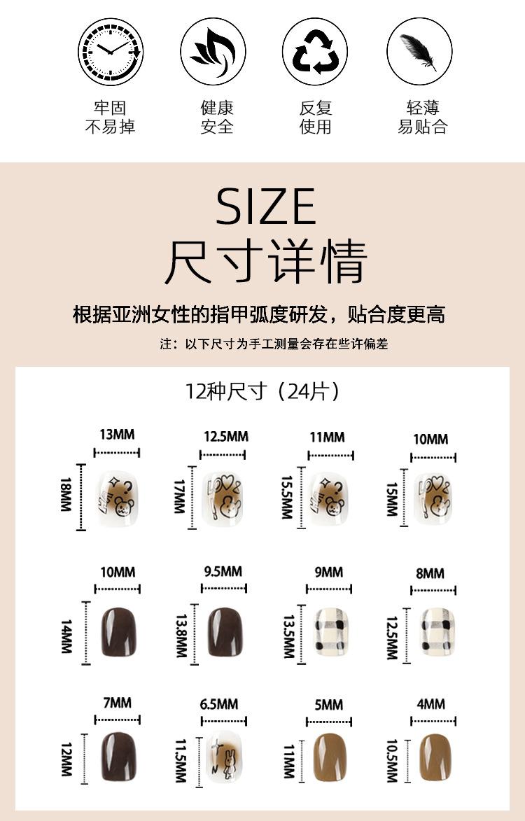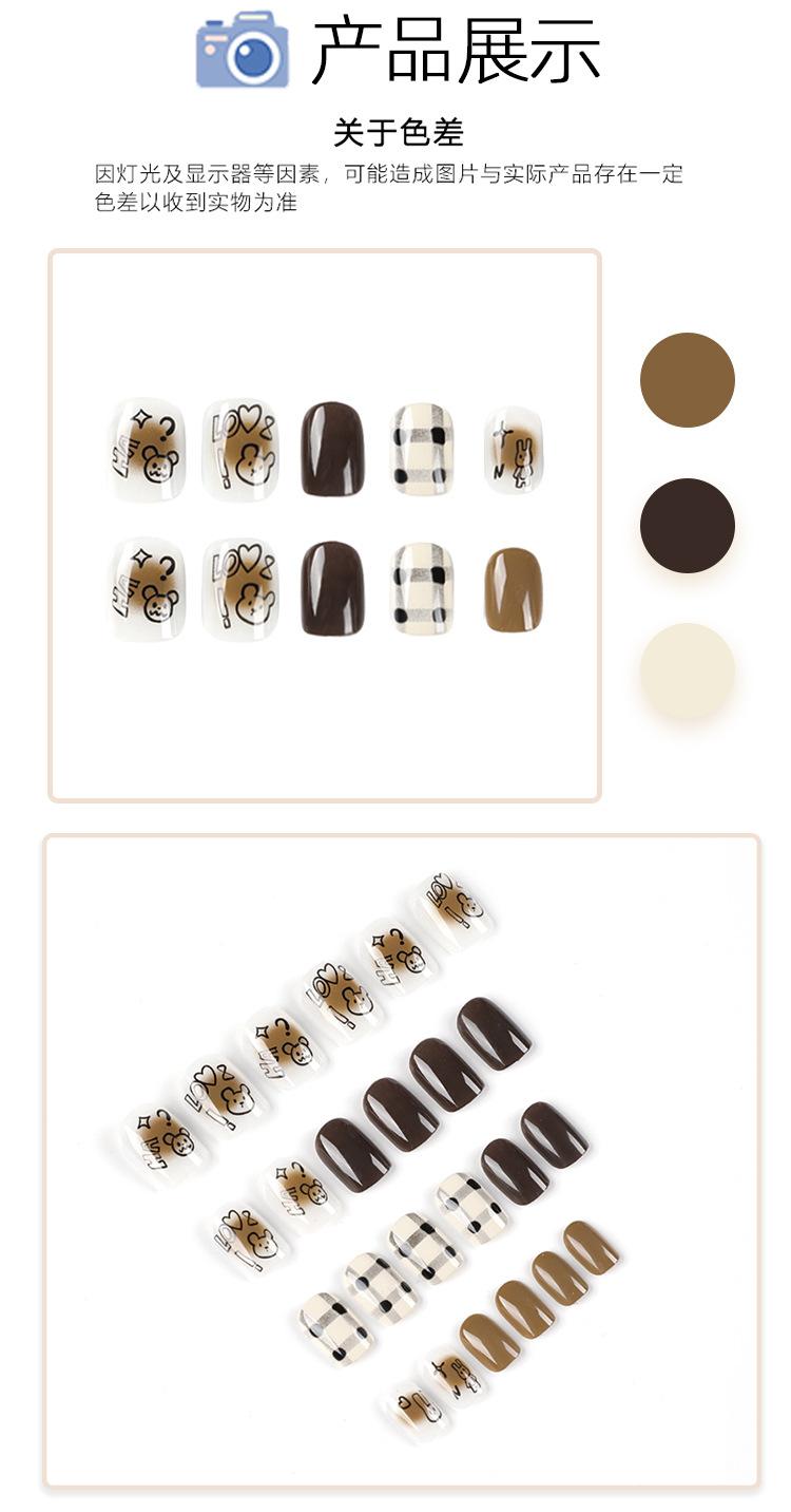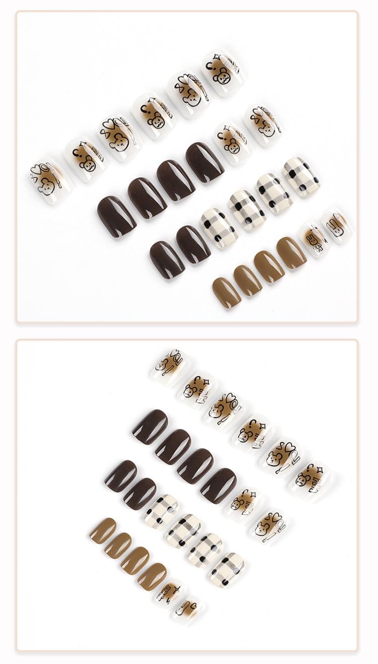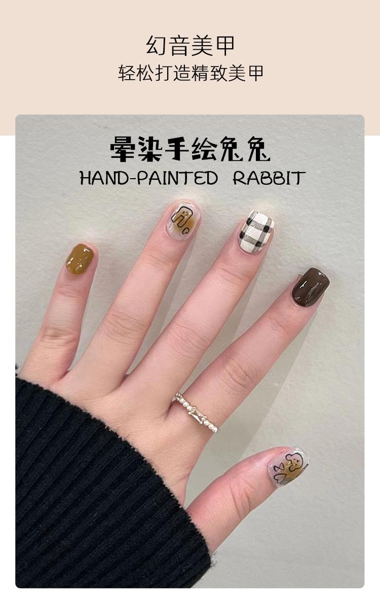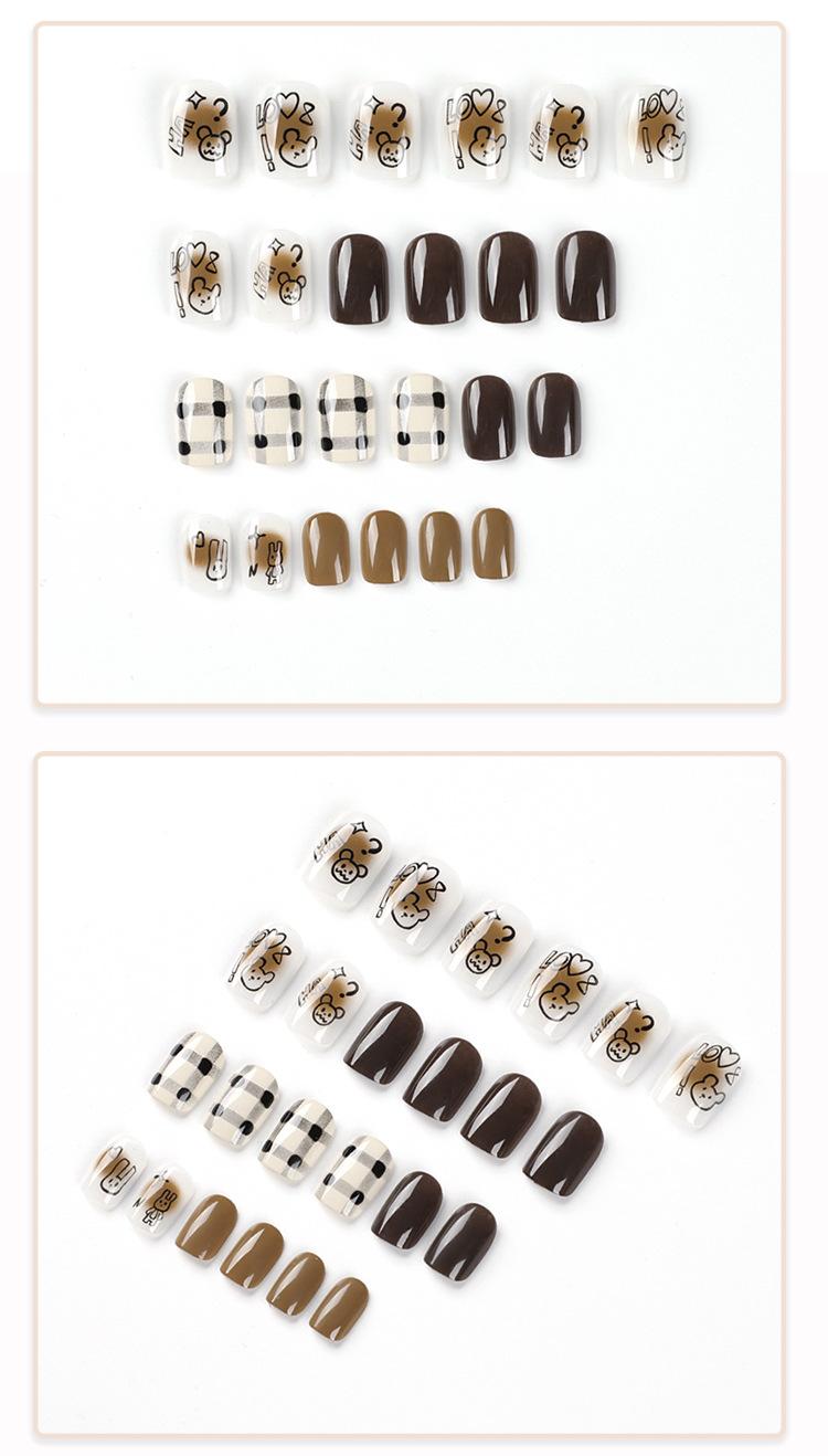 Pieza de uña usable terminada con viñeteado marrón, uña corta, parche de uña de amor negro con dibujo de oso y conejo