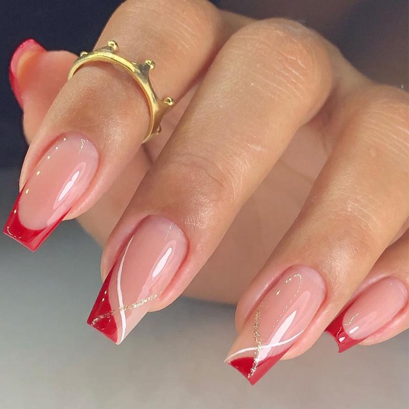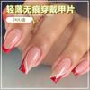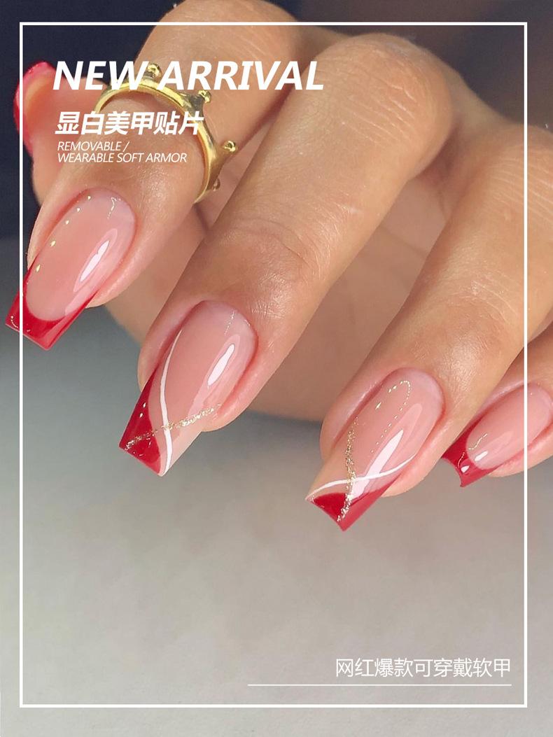 Venta al por mayor de esmaltes de uñas europeos y americanos, de longitud media, con rayas rojas, manicura sencilla, producto terminado, 24 piezas de uñas postizas para usar.