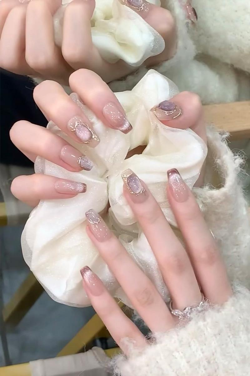 Nueva manicura de ojo de gato ligera y lujosa con acabado en blanco suave, pieza de uña reutilizable