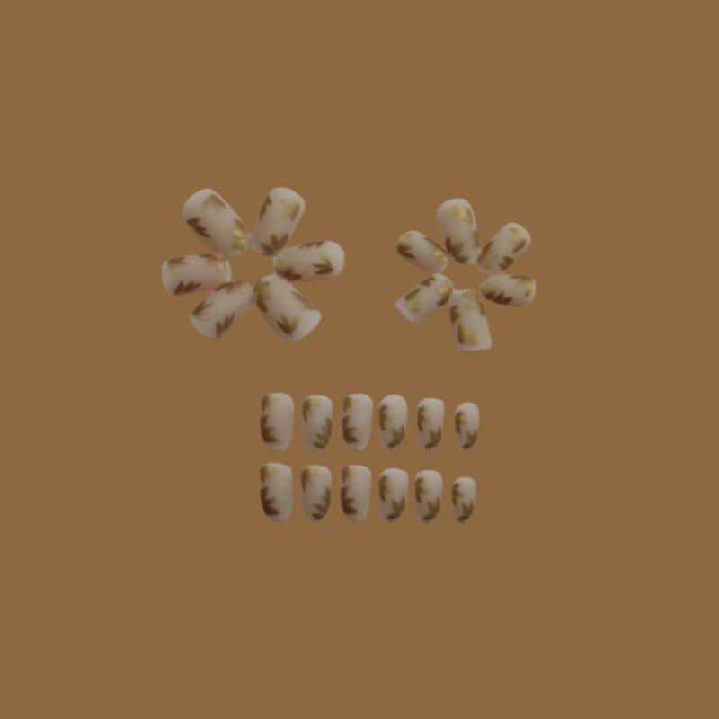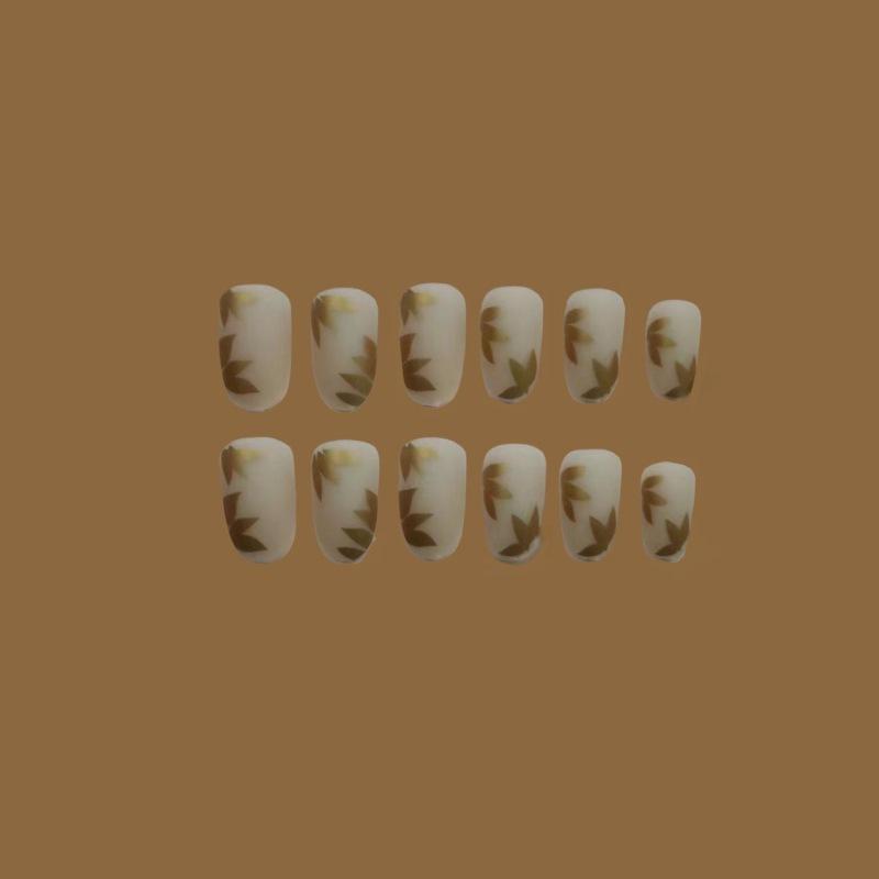 Manicura de otoño e invierno, manicura marrón, corta, ovalada, esmerilada, hojas doradas, uñas postizas, uñas con parche terminado