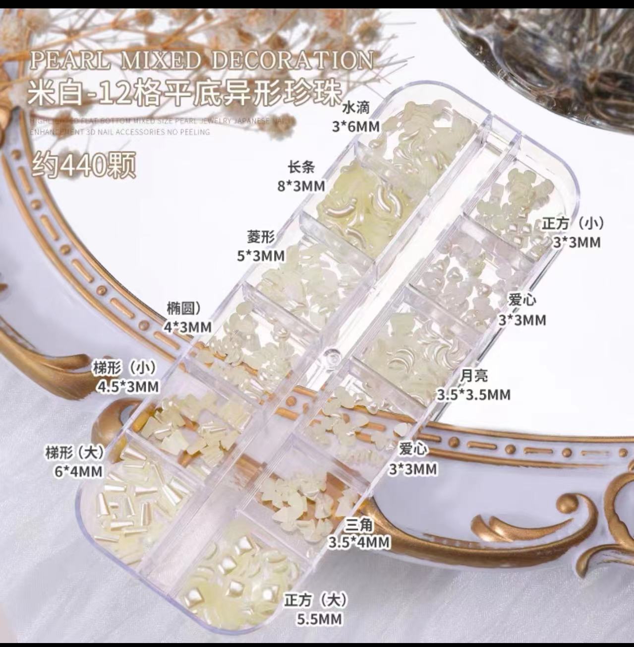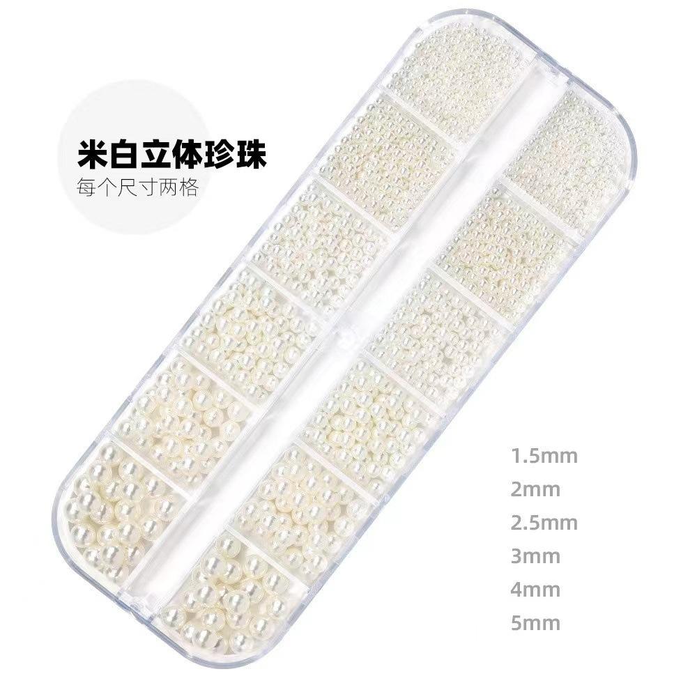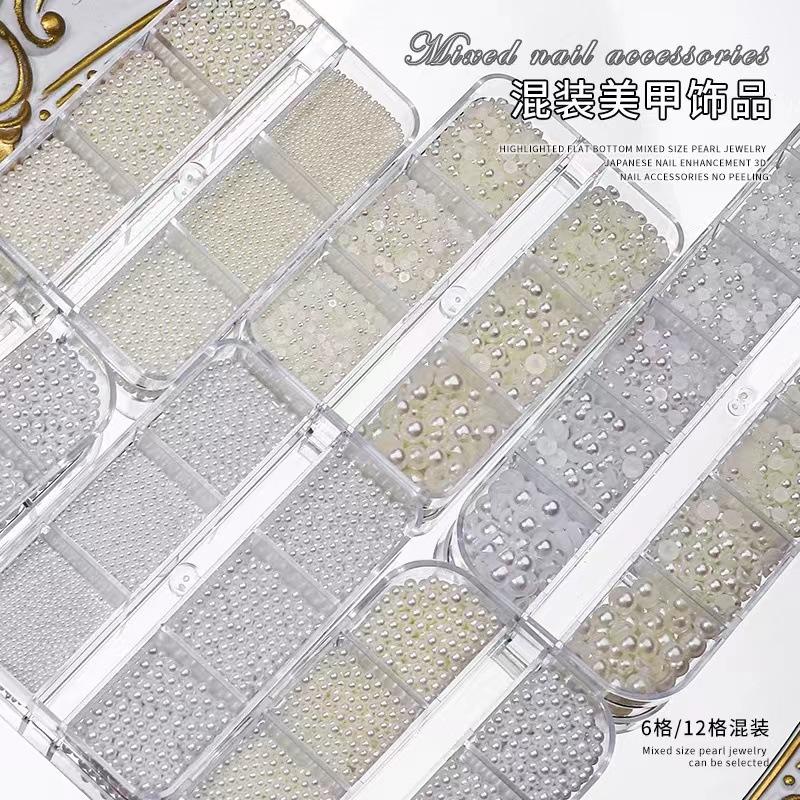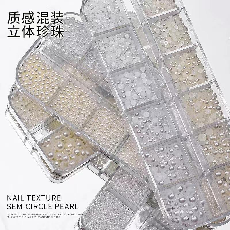 Joyería de perlas para uñas de estilo japonés, semicírculo beige, 12 cuadrículas, alto brillo, tamaño mixto, accesorios de decoración para uñas tridimensionales, nuevo