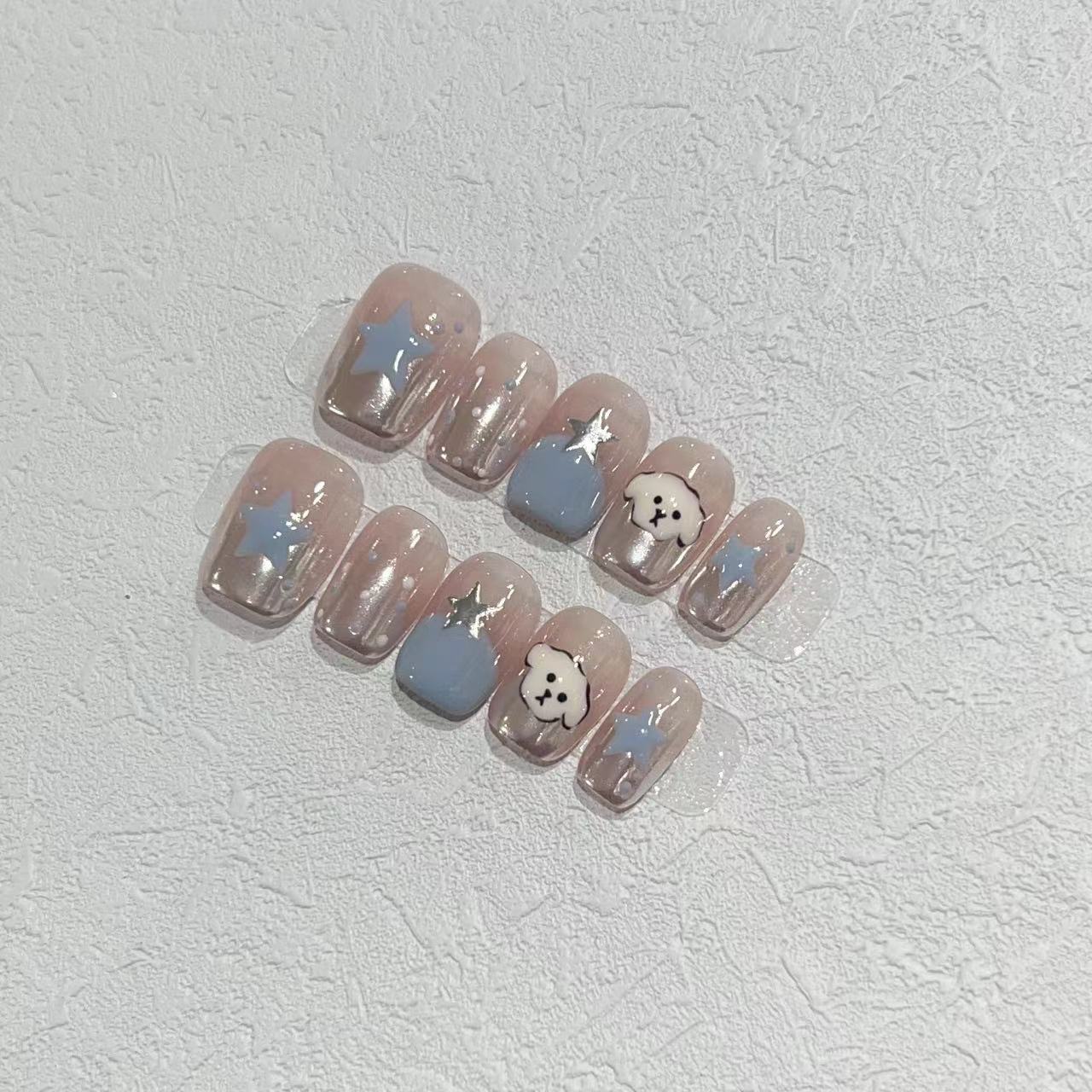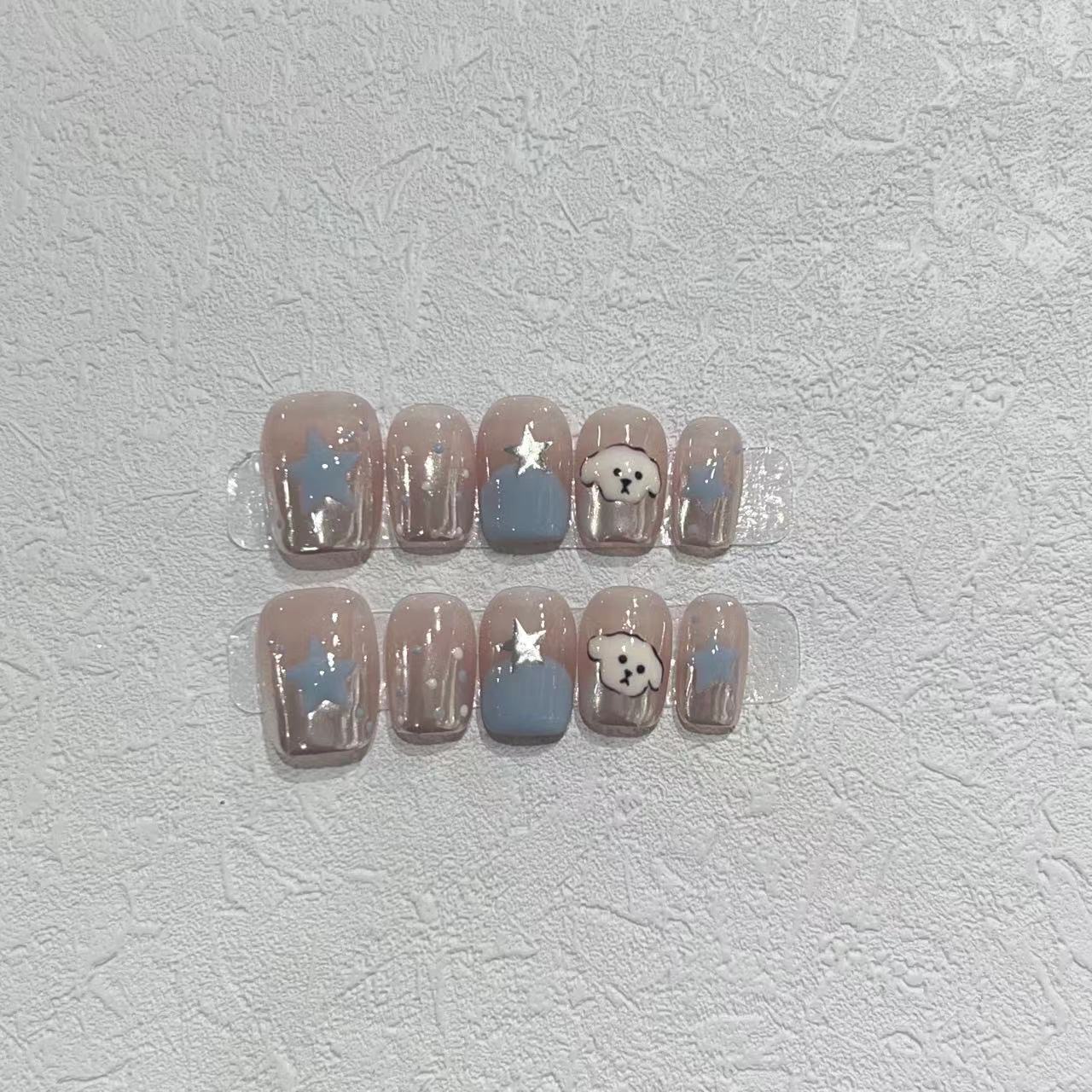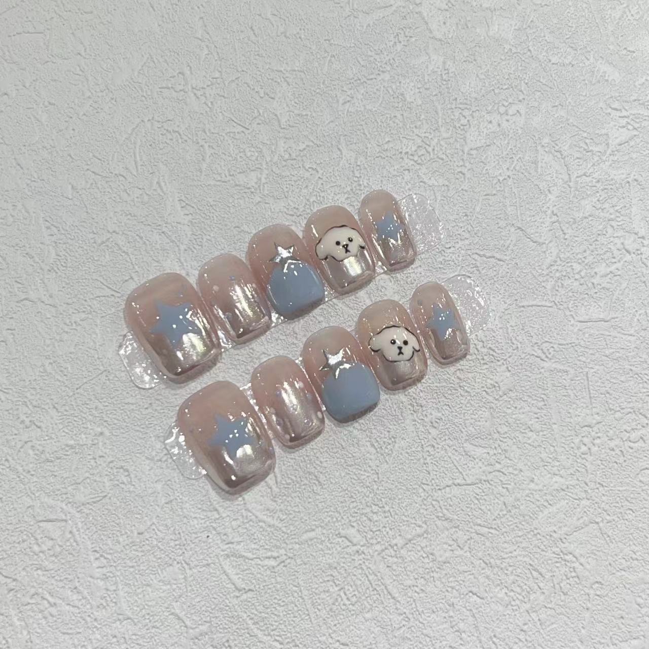 Compra Bonitas uñas cortas con diseño de arte de uñas, estilo ins, pintadas a mano, con un pequeño espejo mágico de perro lechero, uñas cortas francesas para estudiantes. al por mayor en Joom.pro