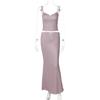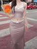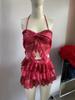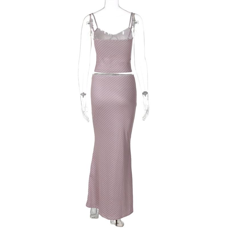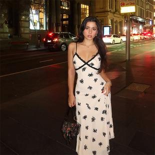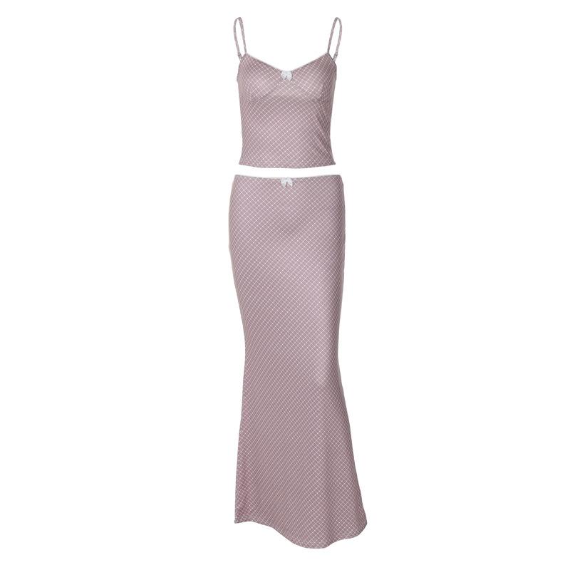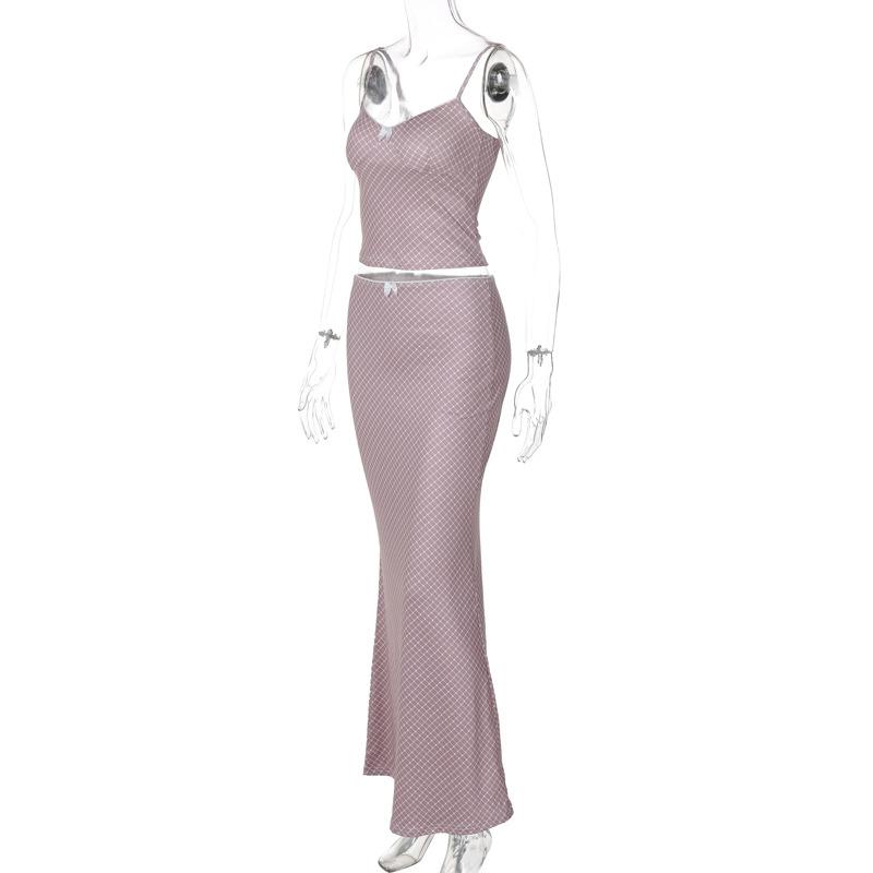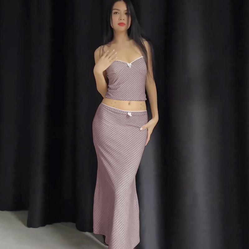 Ropa Europea y Americana 2025 Verano Estilo Dulce Traje Estampado Sexy Ombliguera Tirantes Finos Falda Larga Ajustada Conjunto de Dos Piezas para Mujer
