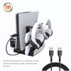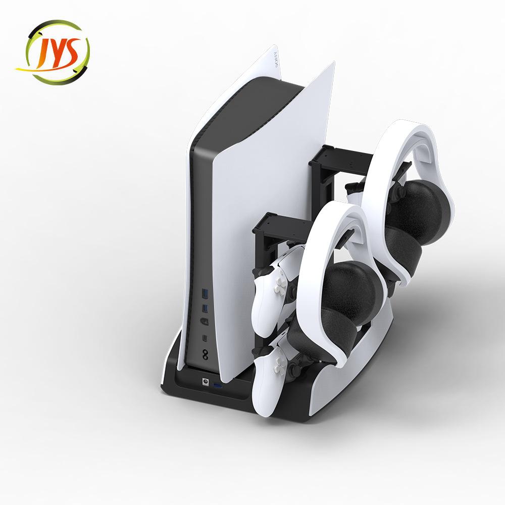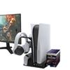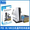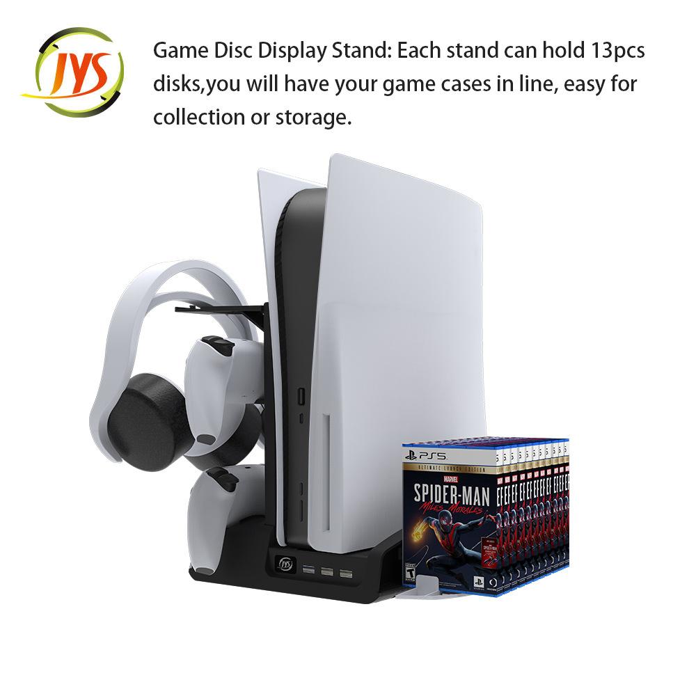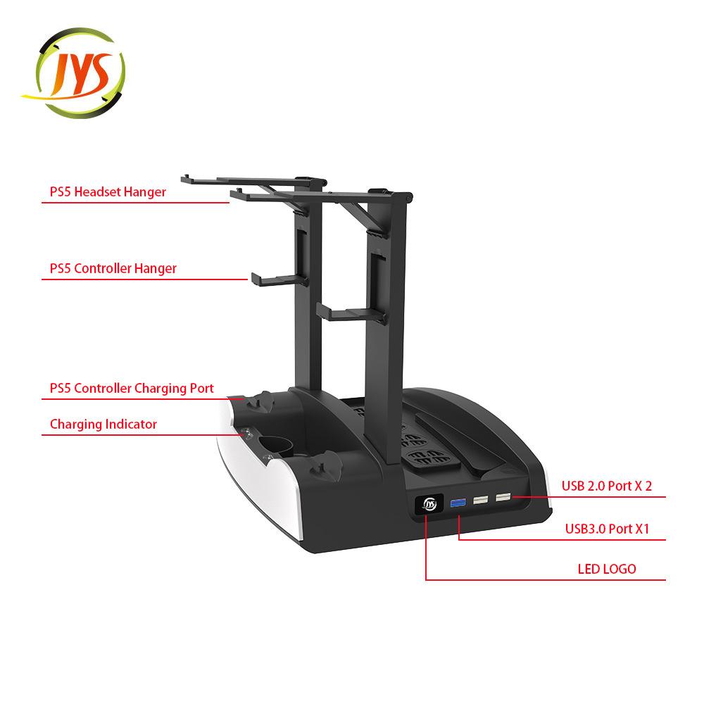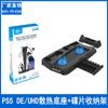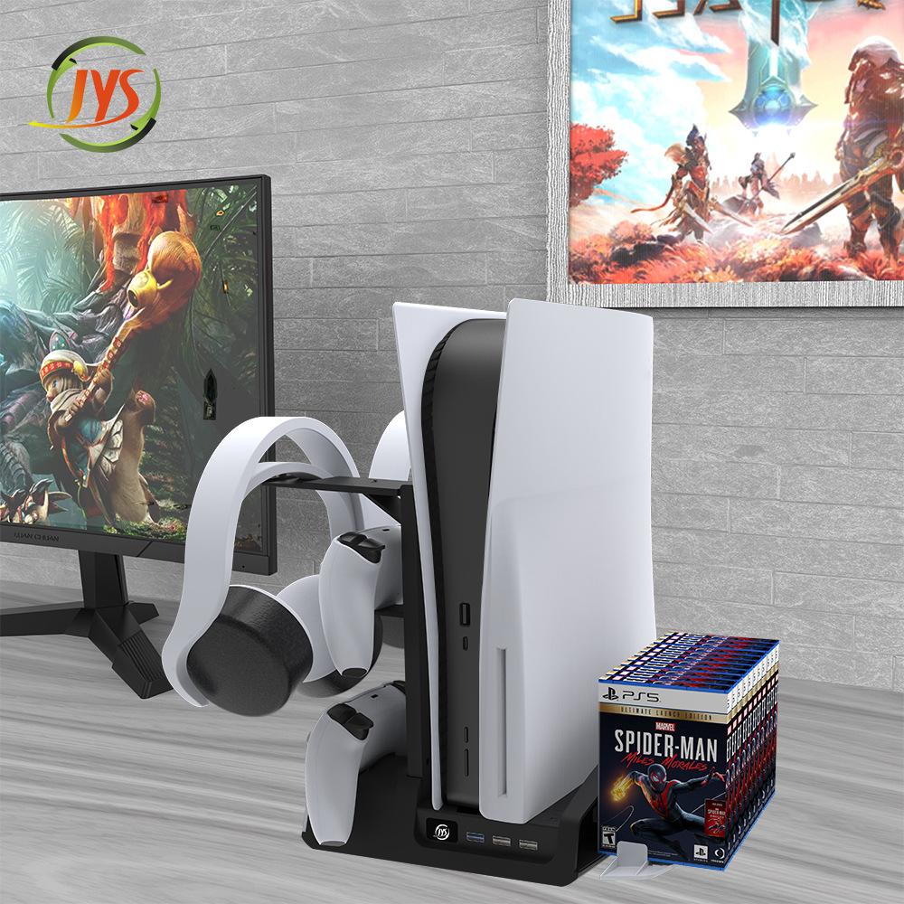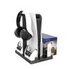 *Soporte de carga multifunción para consola PS5. La parte inferior está equipada con 4 ventiladores de refrigeración para la consola, incluyendo carga dual por contacto para los mandos, y un estante para guardar tarjetas de juego, incluyendo 2 puertos de expansión USB 2.0 y 1 puerto de expansión USB 3.0, 1 ranura para tarjetas de almacenamiento para el mando a distancia, 2 soportes para guardar auriculares, 2 soportes para mandos, etc.