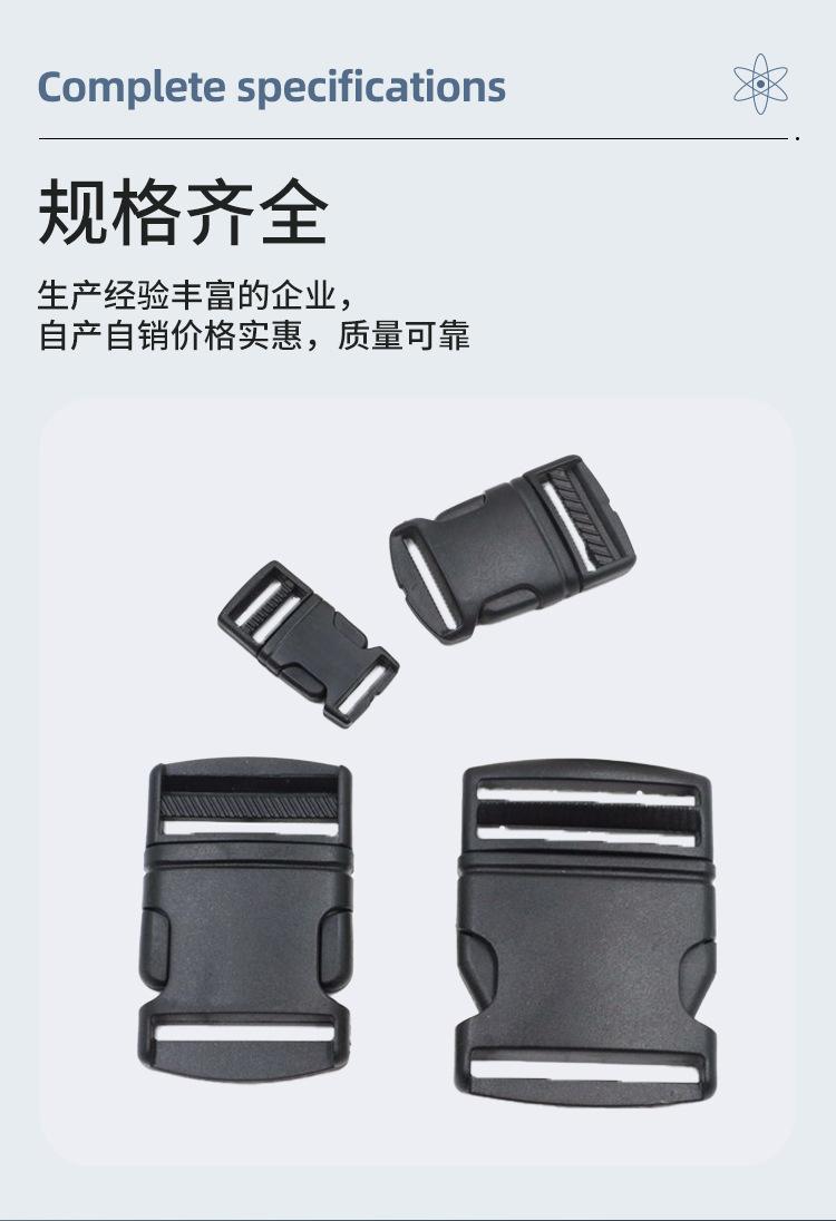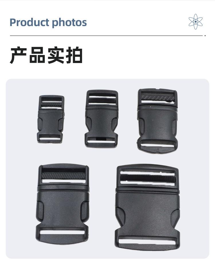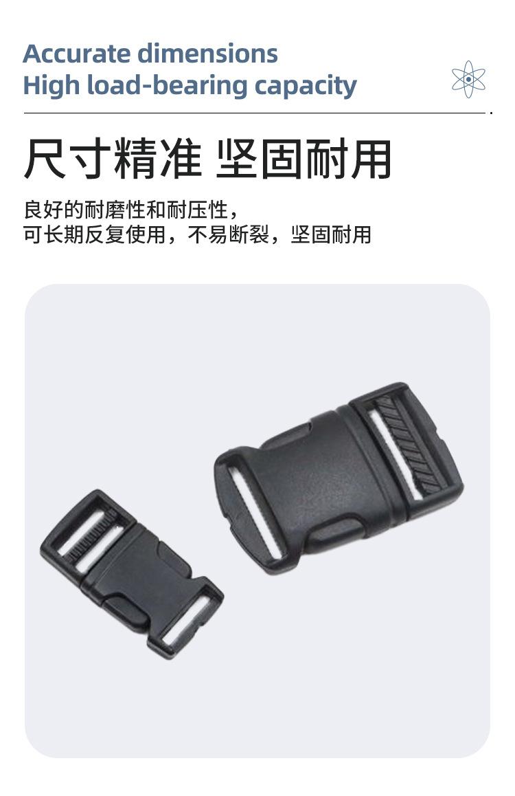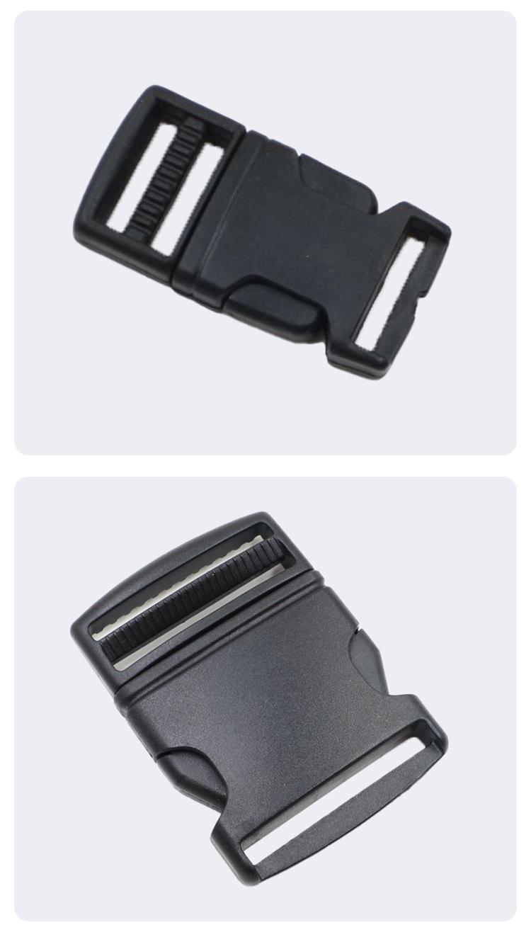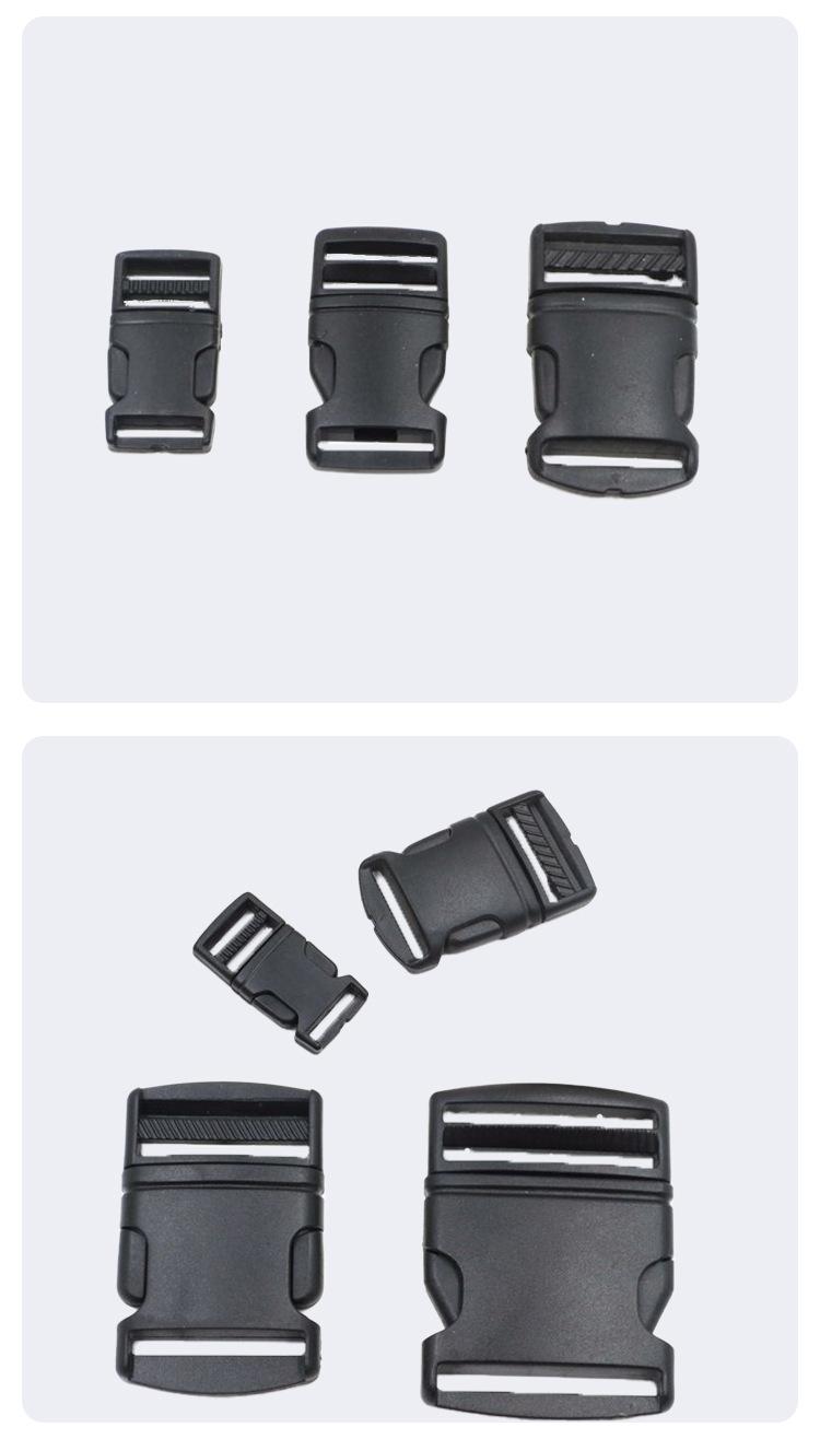 La hebilla generalmente se compone de dos partes: una hebilla macho y una hebilla hembra. El lugar detrás de la hebilla para colgar la cinta generalmente es de un diente o de doble diente. El de un diente no es ajustable, y el de doble diente es ajustable. El material es principalmente polipropileno (PP), polioximetileno (POM, comúnmente conocido como Saigang) y nailon (PA) en plásticos. Este producto es adecuado para embalaje, equipaje, productos para exteriores, hebillas para productos de automóviles, hebillas integradas para sofás, etc., y tiene una amplia gama de usos. El color y el material del producto se pueden cambiar según los requisitos del cliente. Si necesita saber más información del producto, ¡comuníquese con el servicio al cliente a tiempo!