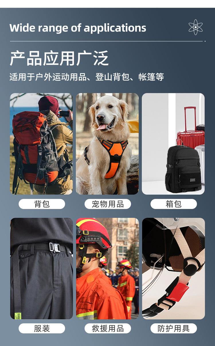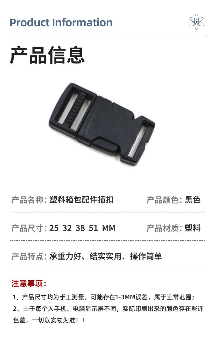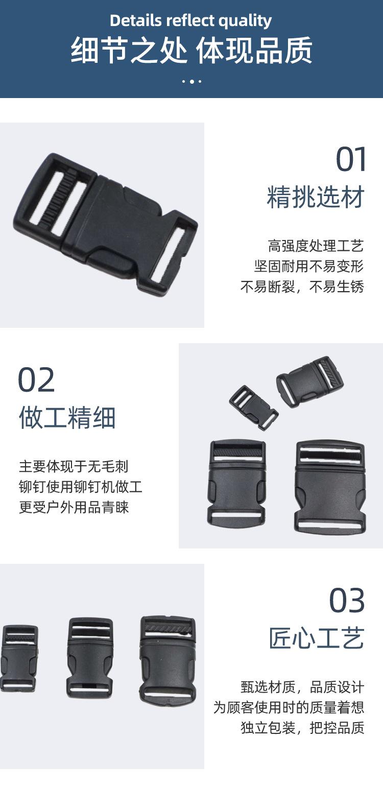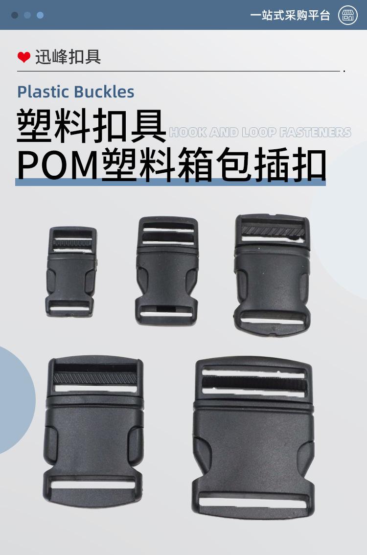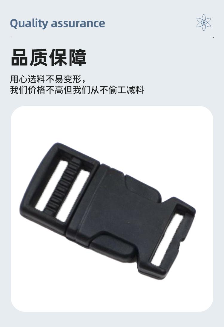 La hebilla generalmente se compone de dos partes: una hebilla macho y una hebilla hembra. El lugar detrás de la hebilla para colgar la cinta generalmente es de un diente o de doble diente. El de un diente no es ajustable, y el de doble diente es ajustable. El material es principalmente polipropileno (PP), polioximetileno (POM, comúnmente conocido como Saigang) y nailon (PA) en plásticos. Este producto es adecuado para embalaje, equipaje, productos para exteriores, hebillas para productos de automóviles, hebillas integradas para sofás, etc., y tiene una amplia gama de usos. El color y el material del producto se pueden cambiar según los requisitos del cliente. Si necesita saber más información del producto, ¡comuníquese con el servicio al cliente a tiempo!