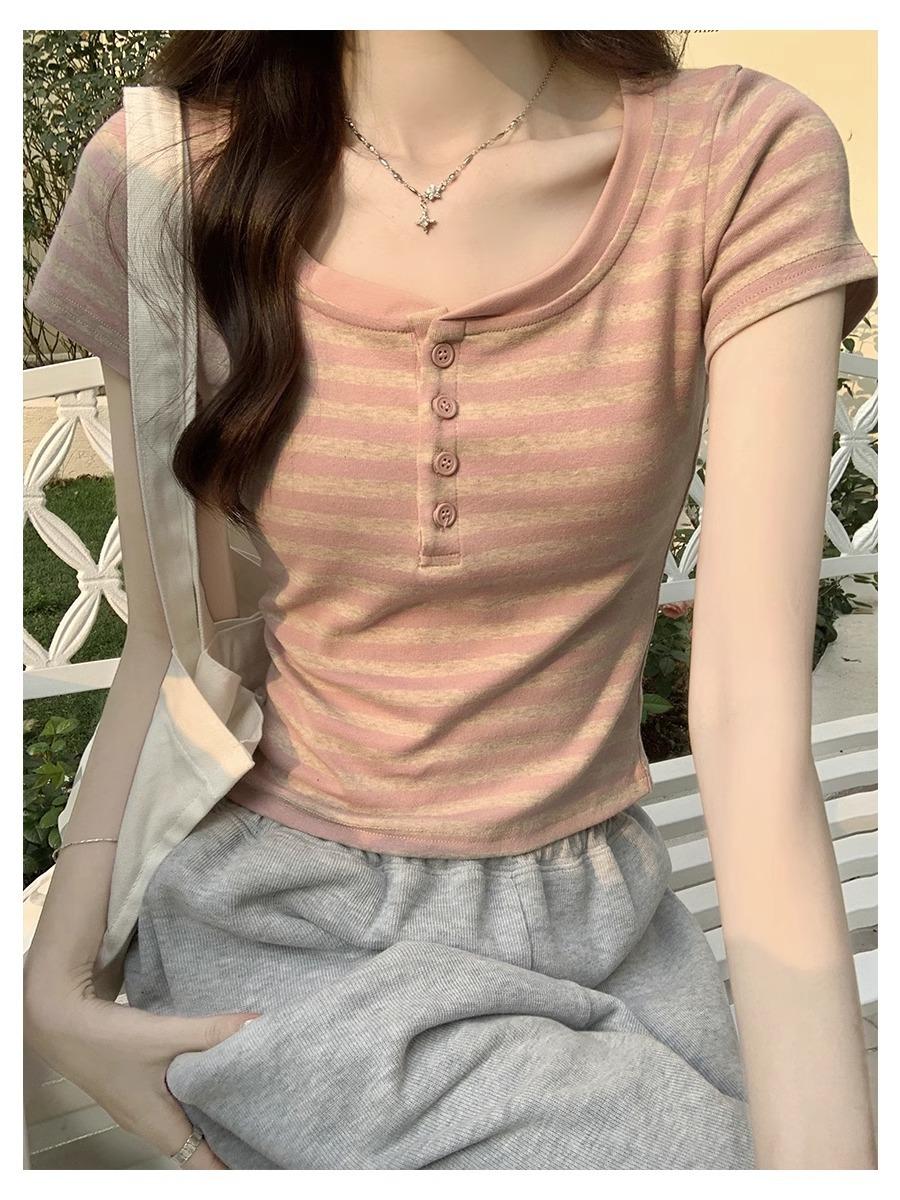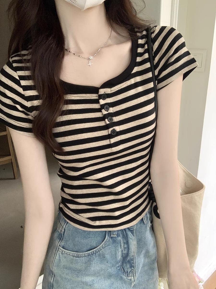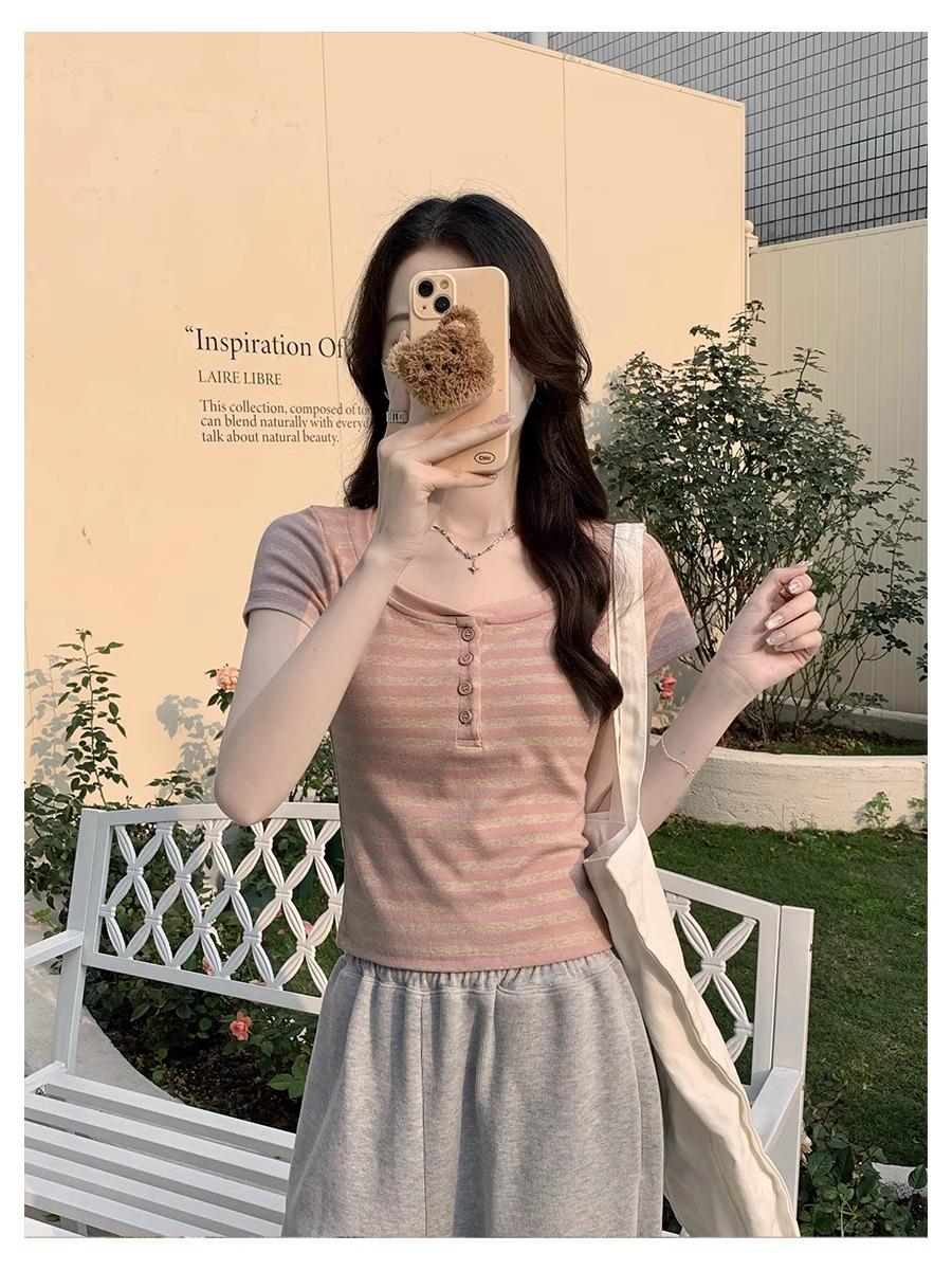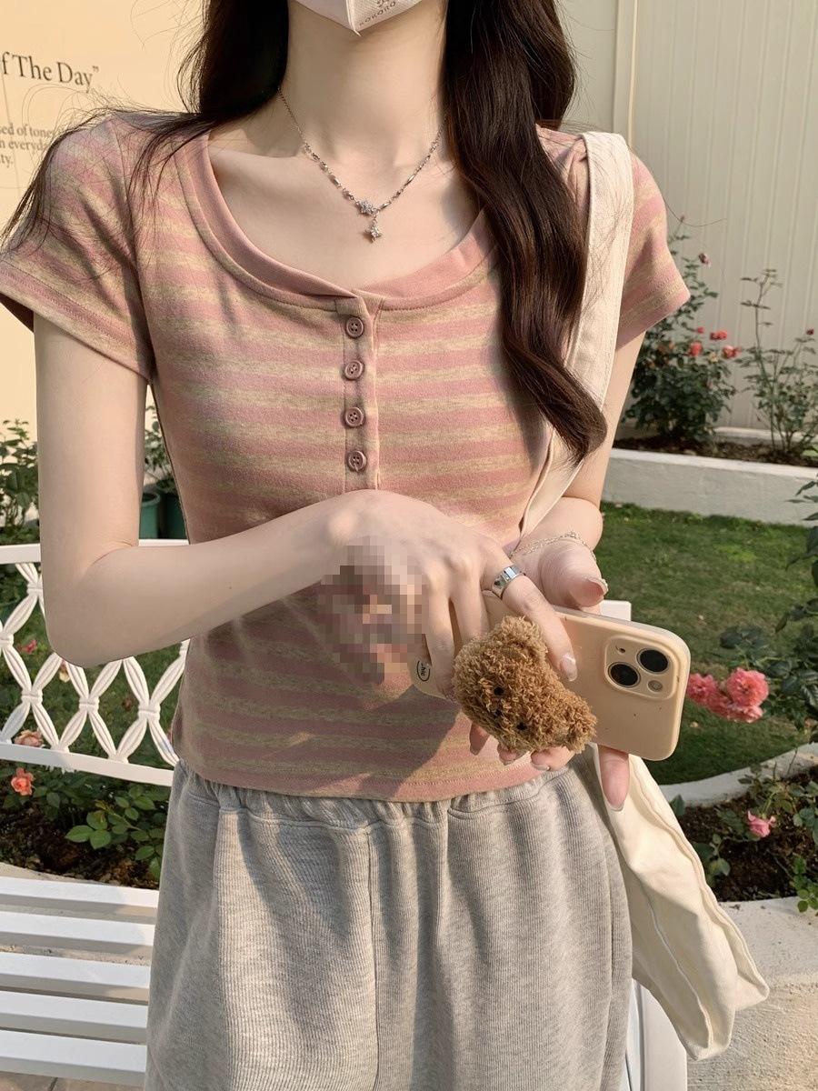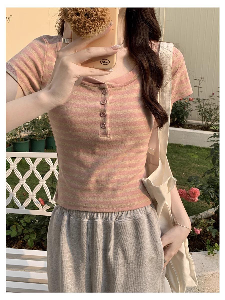 Camiseta de manga corta con hilo, estilo coreano, de verano 2025, con rayas en los hombros, corte entallado, cuello redondo y manga corta.