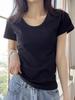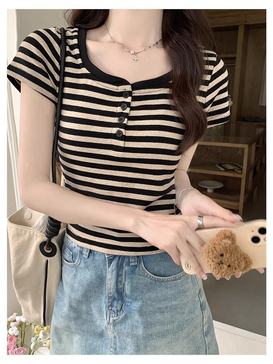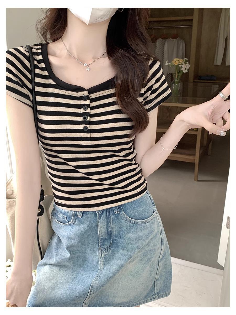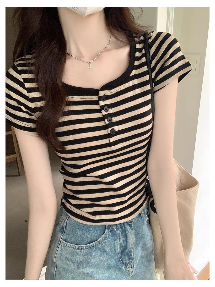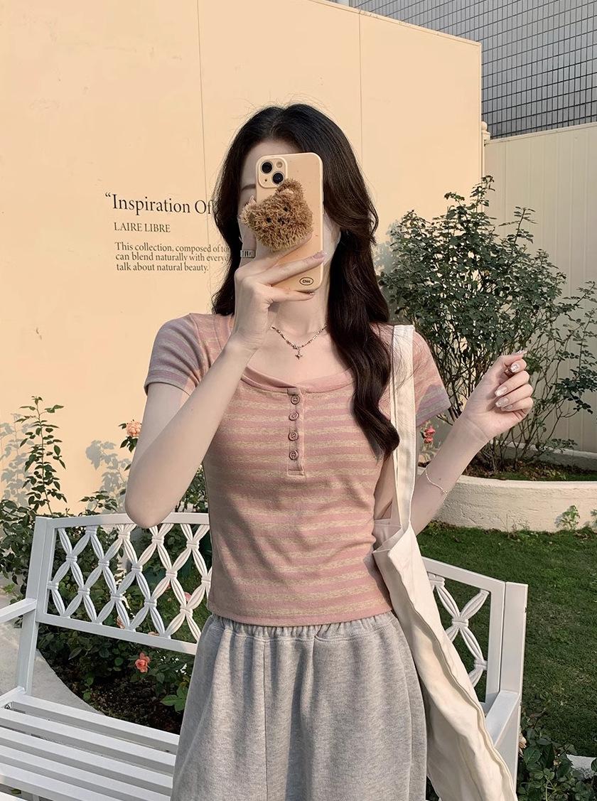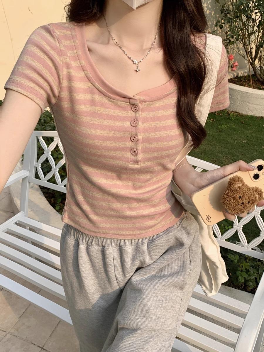 Camiseta de manga corta con hilo, estilo coreano, de verano 2025, con rayas en los hombros, corte entallado, cuello redondo y manga corta.