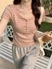 Camiseta rosa de manga corta con cuello en V para mujer, diseño de verano, top plisado con cintura dividida e irregular, 2025